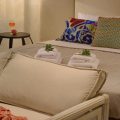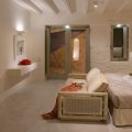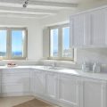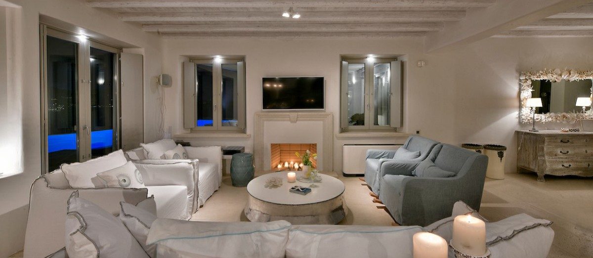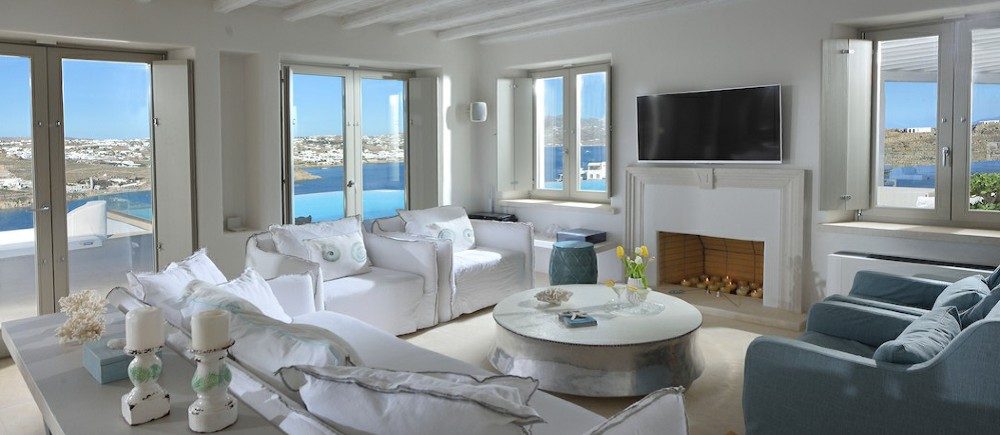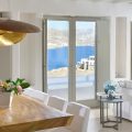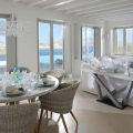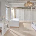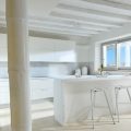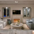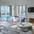 Inside, the villa is designed according to a coastal aesthetic, embracing a minimalist approach that conveys a sense of modern sleekness. Crisp white is accentuated with sandy tans, soft greys, and splashes of blue, create an environment that feels equally soothing as it does inviting. To enhance the seaside look, the decor employs elements such as weathered woods, driftwood crafts, and shell accessories that call to mind the sun-drenched beaches of Greece.