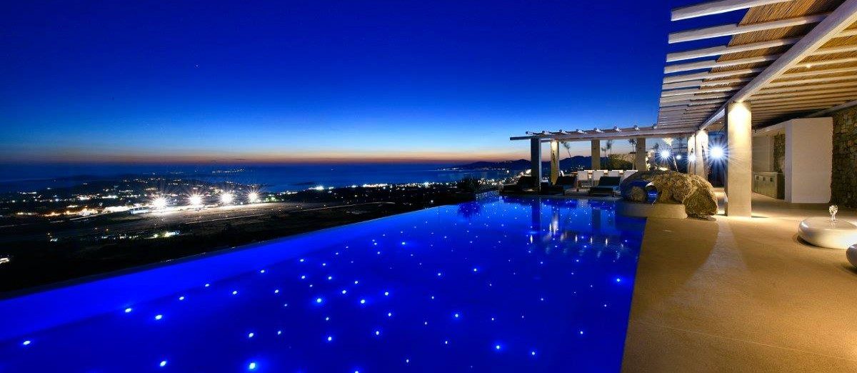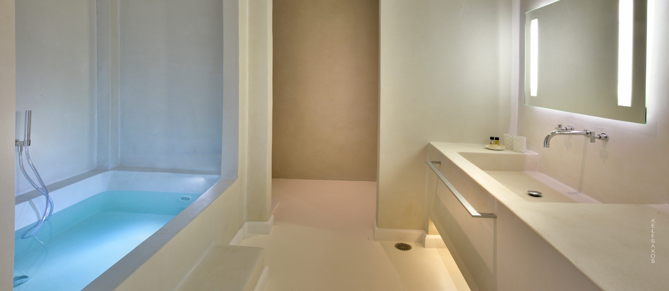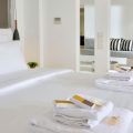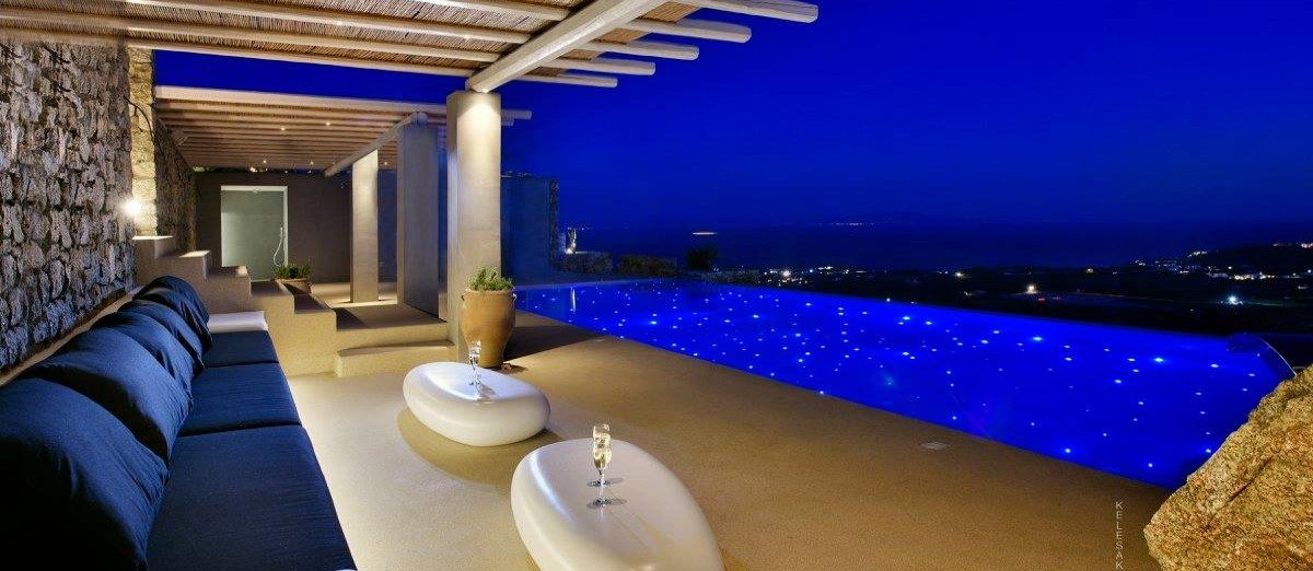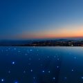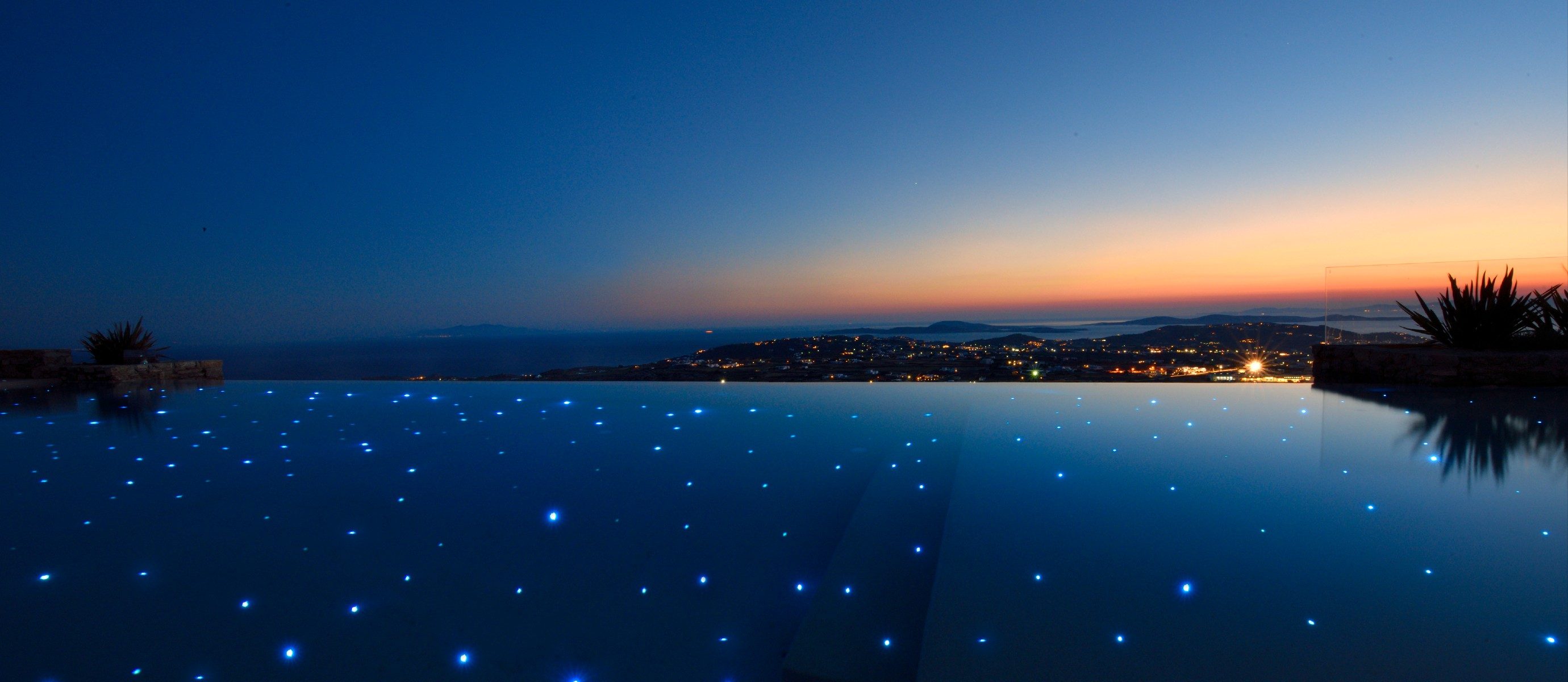 The generous exteriors feature a spectacular 100sqm infinity pool with jacuzzi, complete with gorgeous sun loungers, seating areas, pool bar and pool showers. A pergola offers cool shade to the delightful dining area. As the day passes, the brilliant white and blue surroundings give place to lovely sunset colours over the Aegean, and the night sparkles with the lights from the island and the starry-night effect of the pool lights.