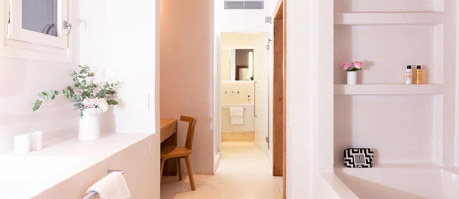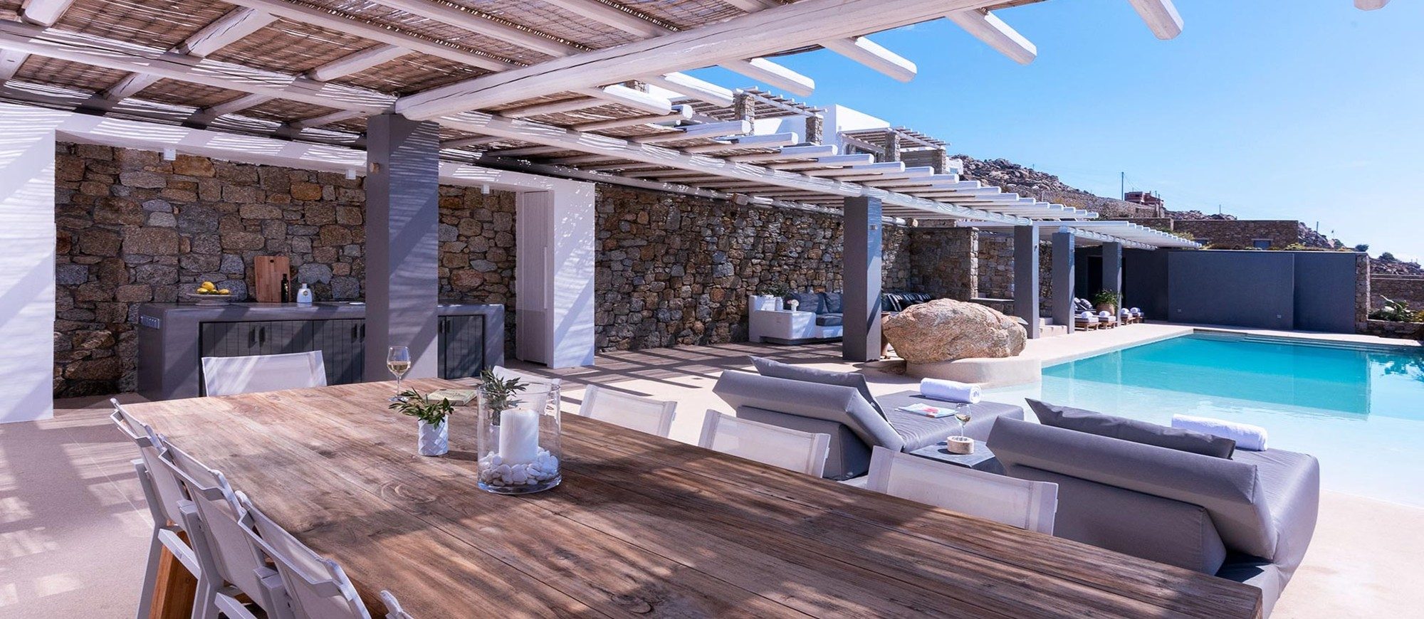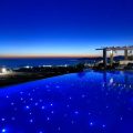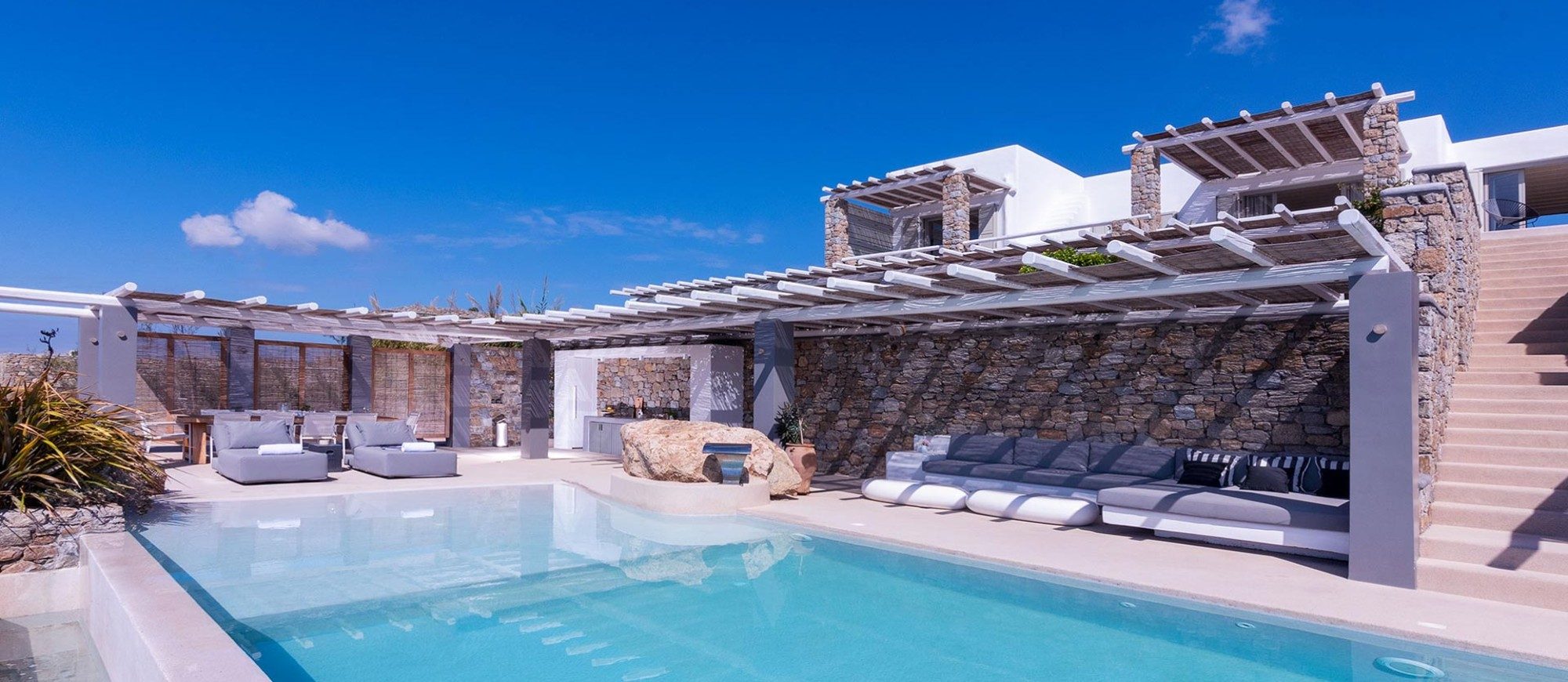 The generous exteriors feature a spectacular 100sqm infinity pool with jacuzzi, complete with gorgeous sun loungers, seating areas, pool bar and pool showers. A pergola offers cool shade to the delightful dining area. As the day passes, the brilliant white and blue surroundings give place to lovely sunset colours over the Aegean, and the night sparkles with the lights from the island and the starry-night effect of the pool lights.