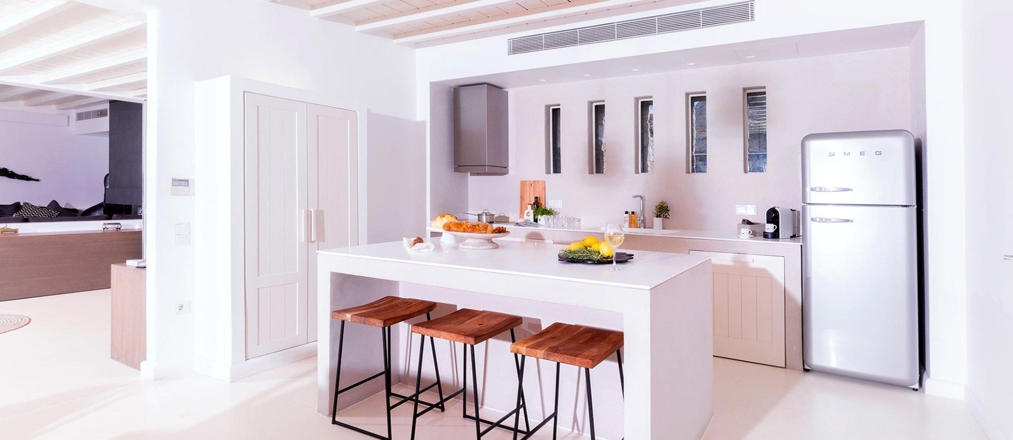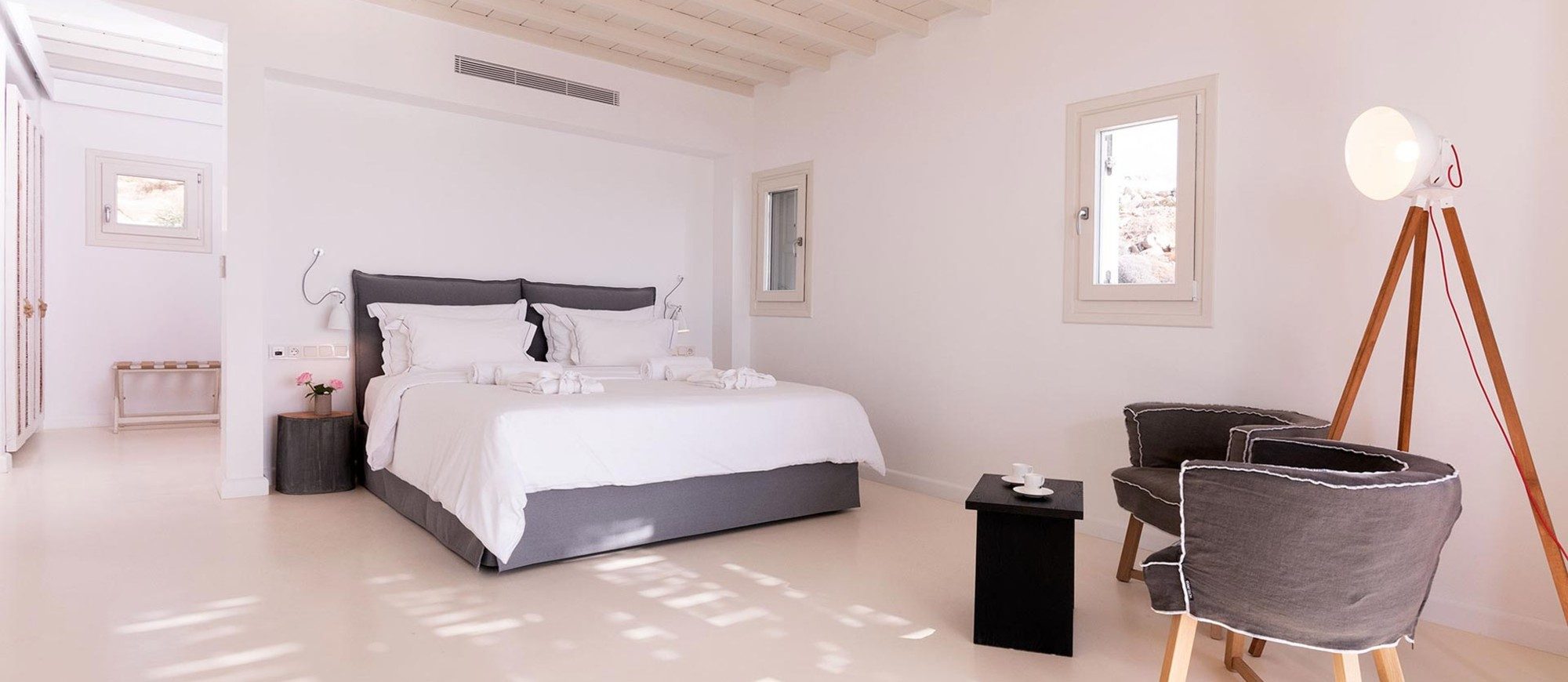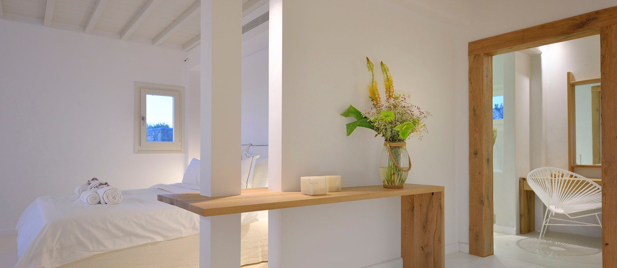 From the impeccable kitchen and bathrooms to the relaxing bedrooms, every detail is a masterful statement of style. The grand master suite, opens to a panoramic view of Mykonos and – at night – its myriad dancing lights.
