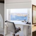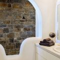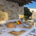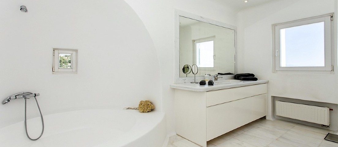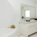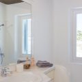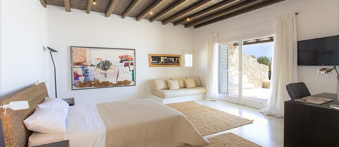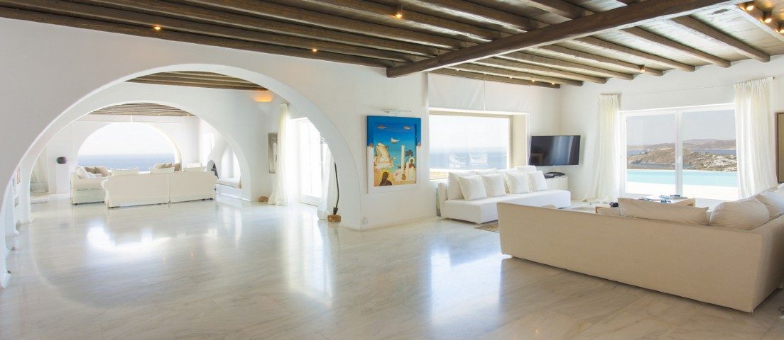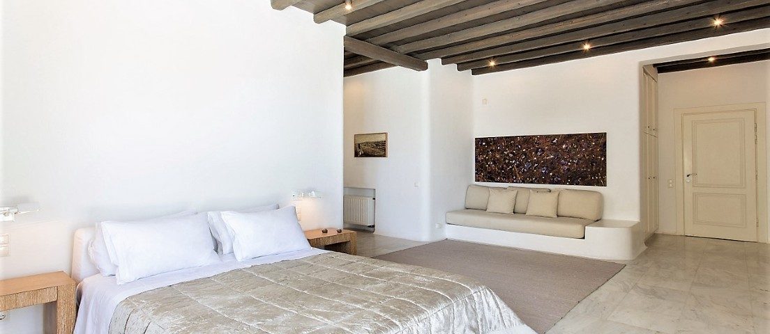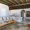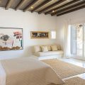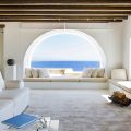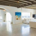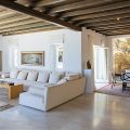 The villa’s interior captivates the senses with its minimal design and modern furnishings. Pristine white surfaces and warm splashes of grey and beige are enlivened by small accents of colour. The seven stylishly designed bedrooms, all with en-suite bathrooms, ensure comfort and privacy. The open concept, all-white colour scheme, and large windows all combine to allow the dazzling Mykonian sunshine to glow throughout the entire house.