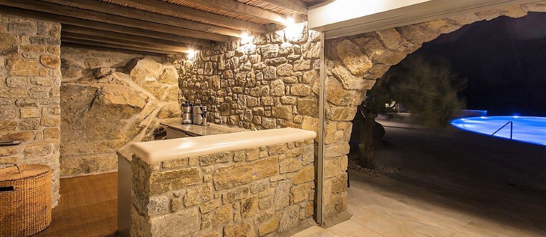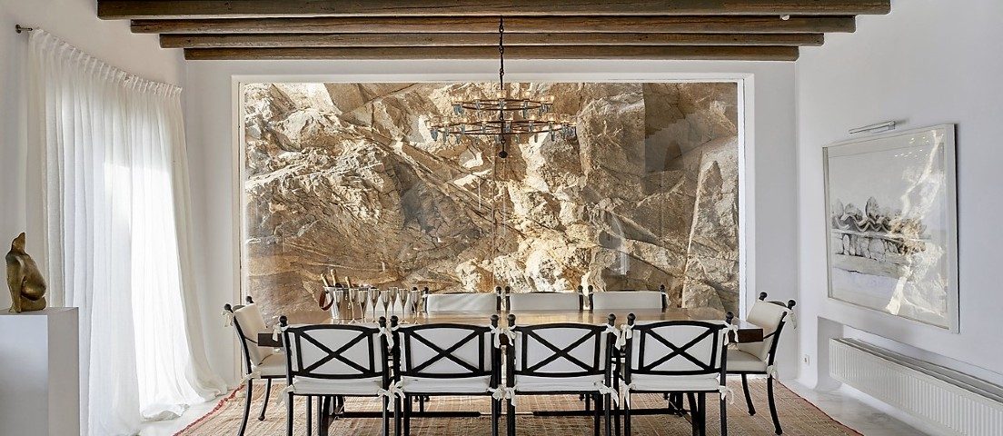 The exterior masterfully combines authentic Greek island landscape design with an array of fine contemporary touches. Although characteristically unique, this property maintains principle elements of traditional Cycladic homes, such as whitewashed walls, cubic shapes and stone details. The generous outdoor space includes a large infinity pool, spacious seating and lounge areas, a kitchen and BBQ space, and a spectacular view across the Aegean Sea.