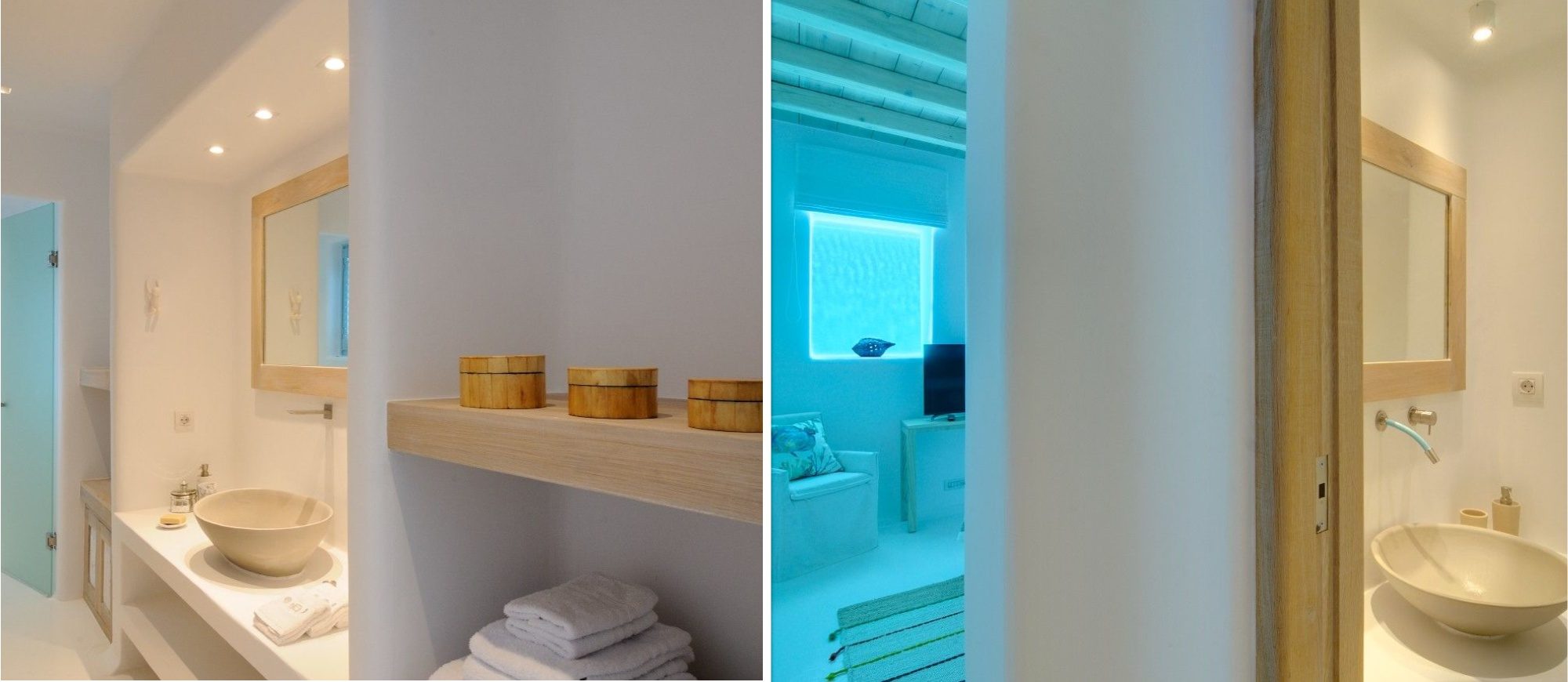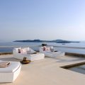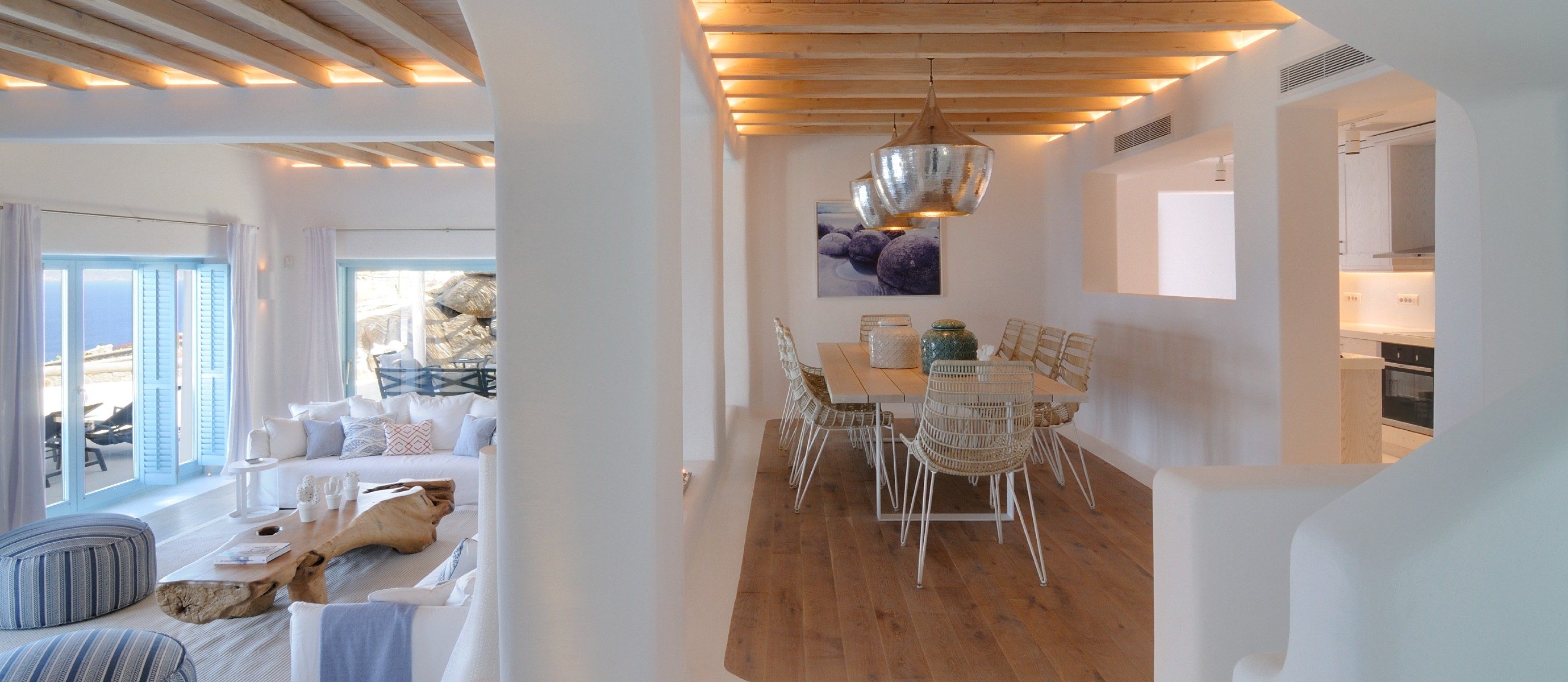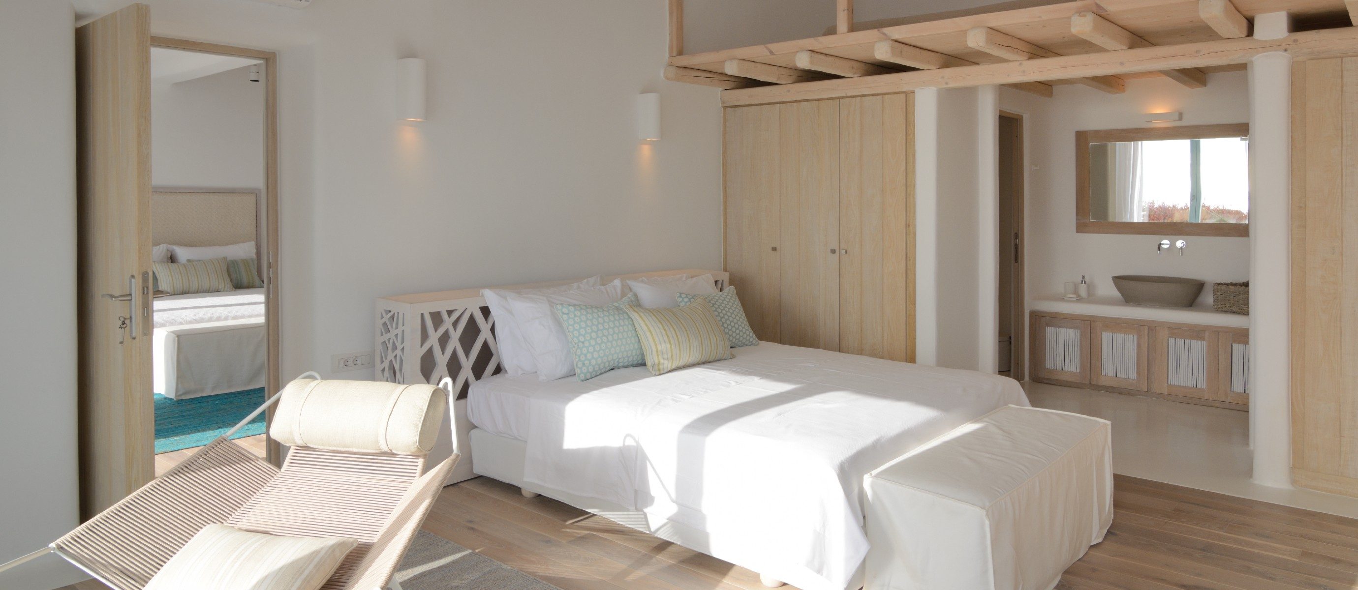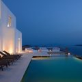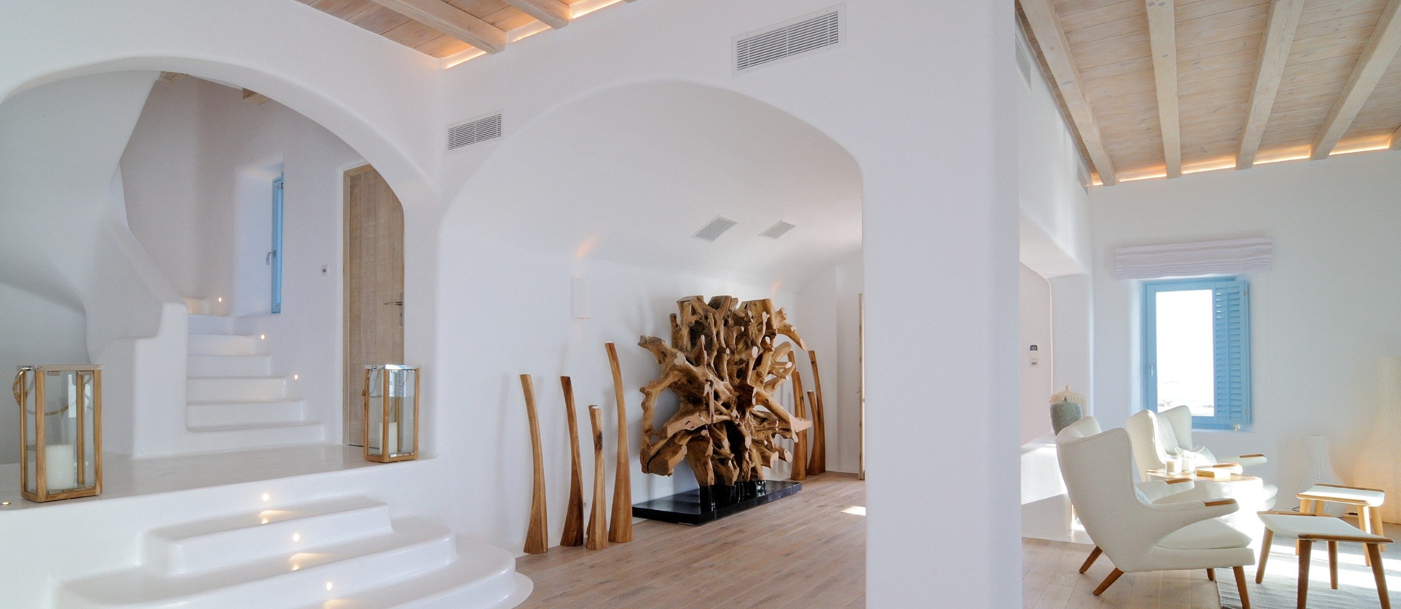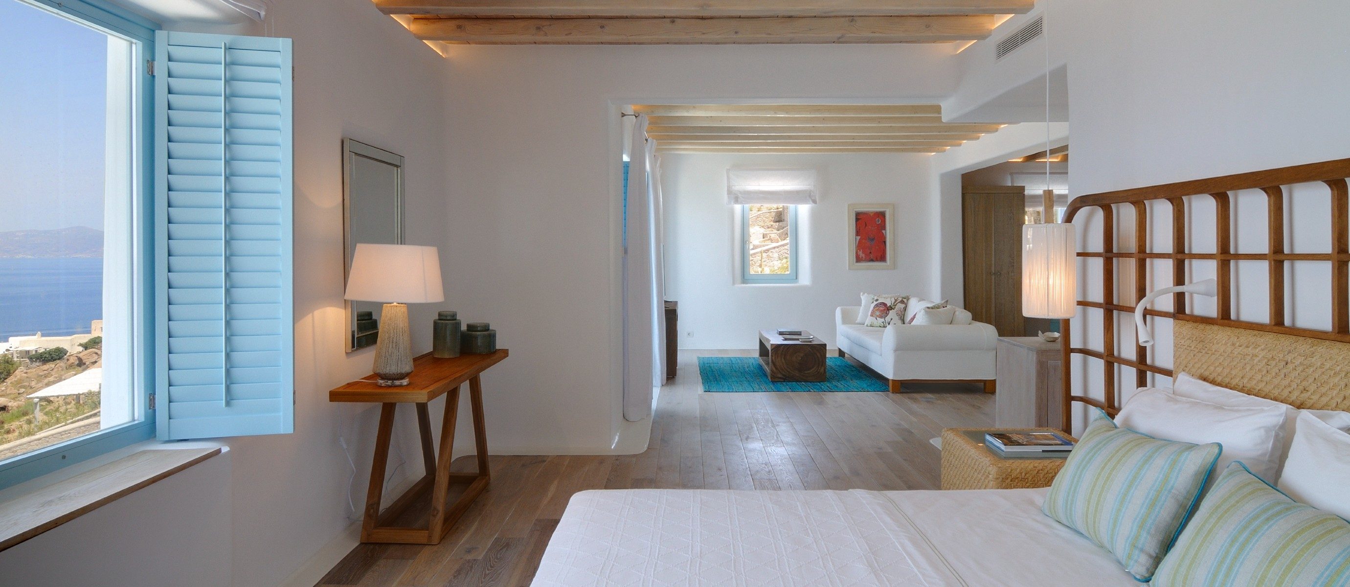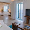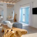 The exterior lounge and pool area have marvellous unobstructed sunset views of the island of Delos and Rheinia. The interiors follow the white minimalist Mediterranean style of Cyclades, white surfaces, arches and washed wood. All bedrooms are decorated with soft luxurious Ag. Sostis fabrics, while bathrooms are modern and fully equipped.