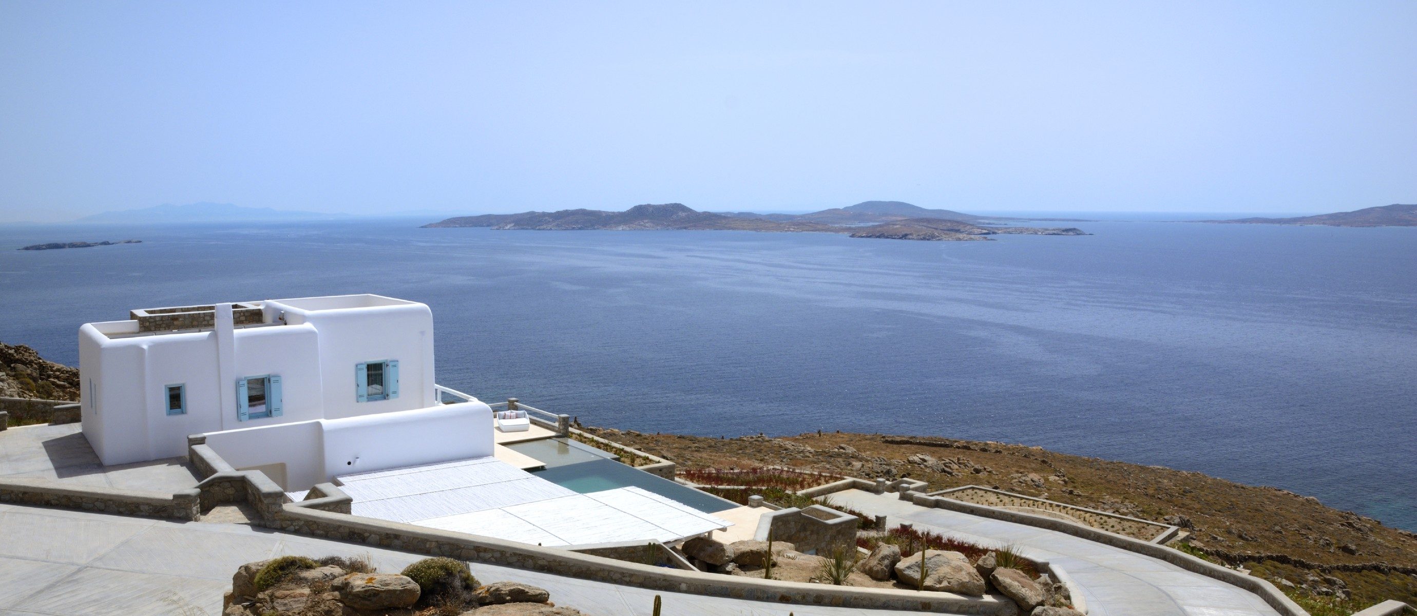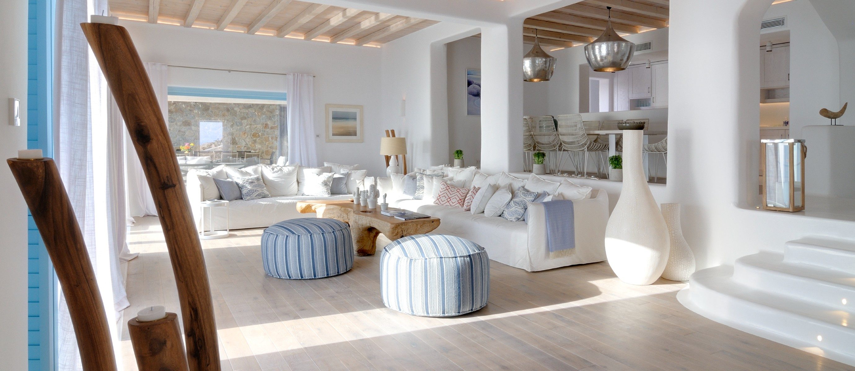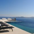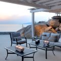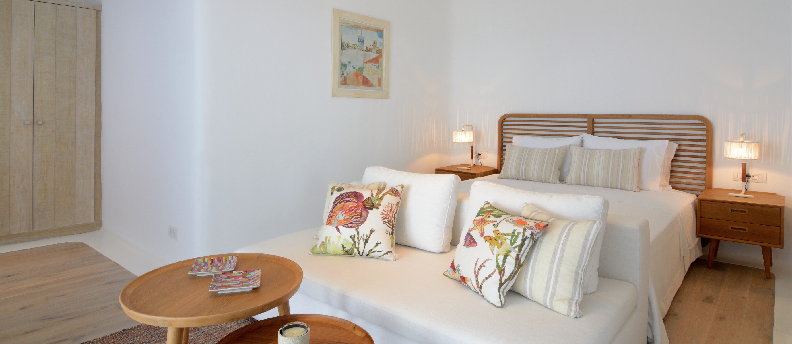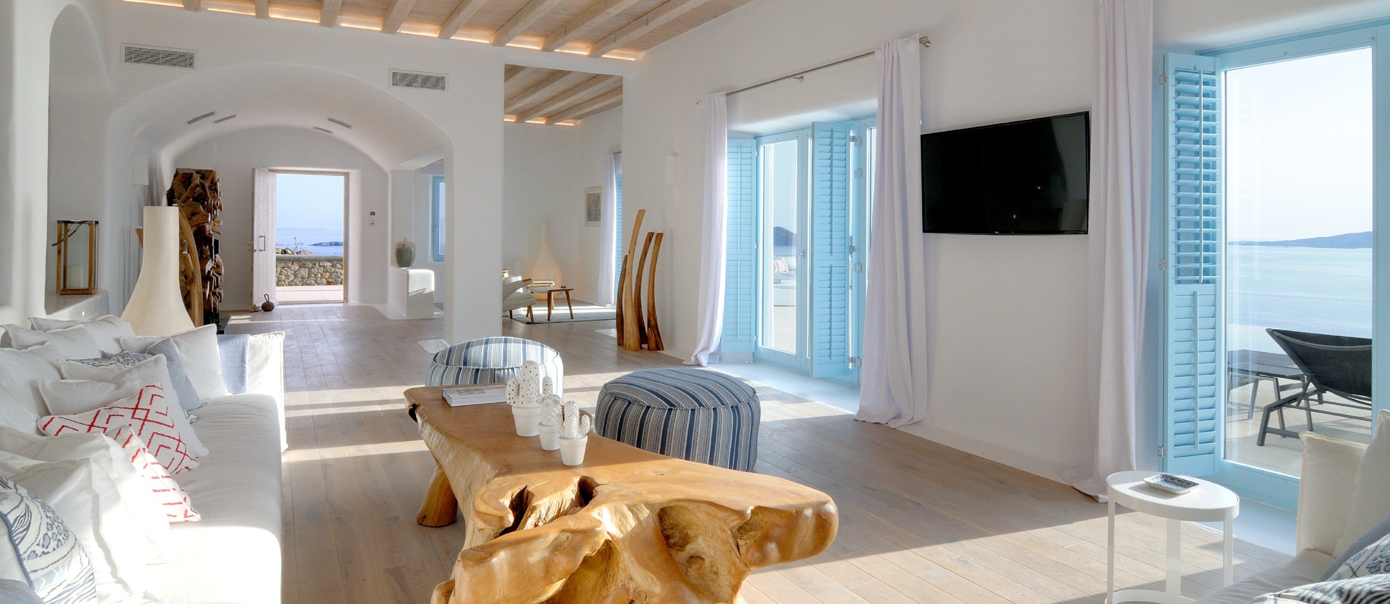 The exterior lounge and pool area have marvellous unobstructed sunset views of the island of Delos and Rheinia. The interiors follow the white minimalist Mediterranean style of Cyclades, white surfaces, arches and washed wood. All bedrooms are decorated with soft luxurious Ag. Sostis fabrics, while bathrooms are modern and fully equipped.