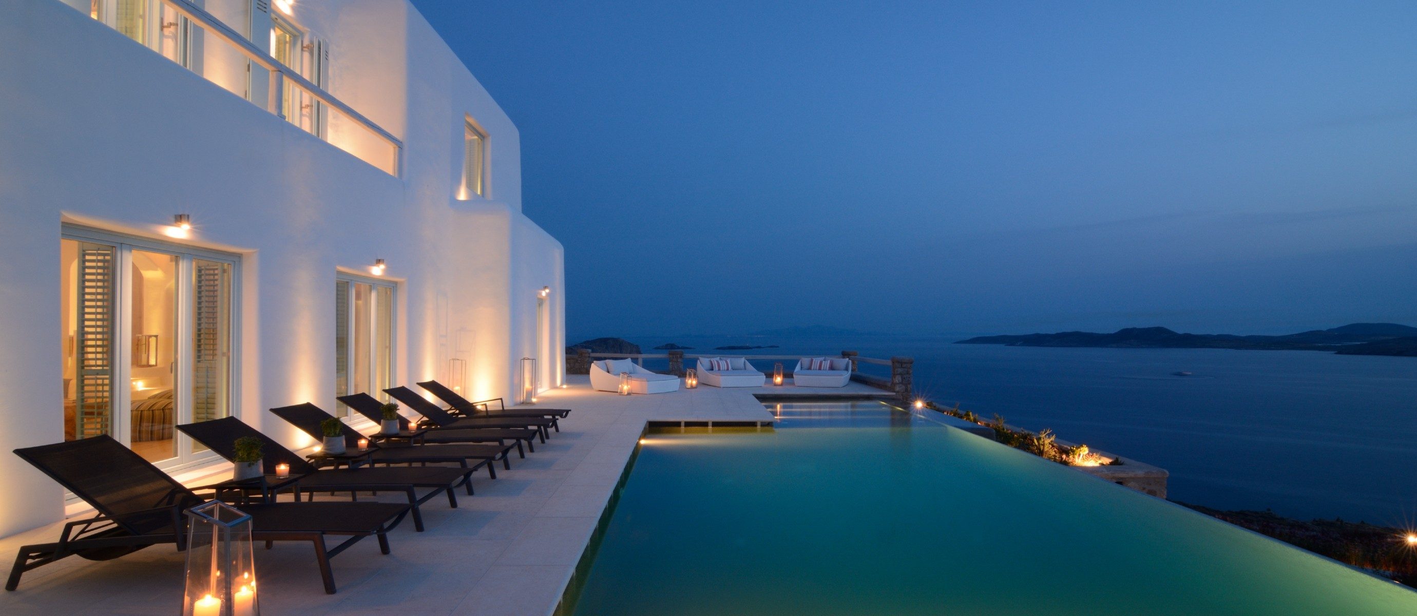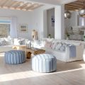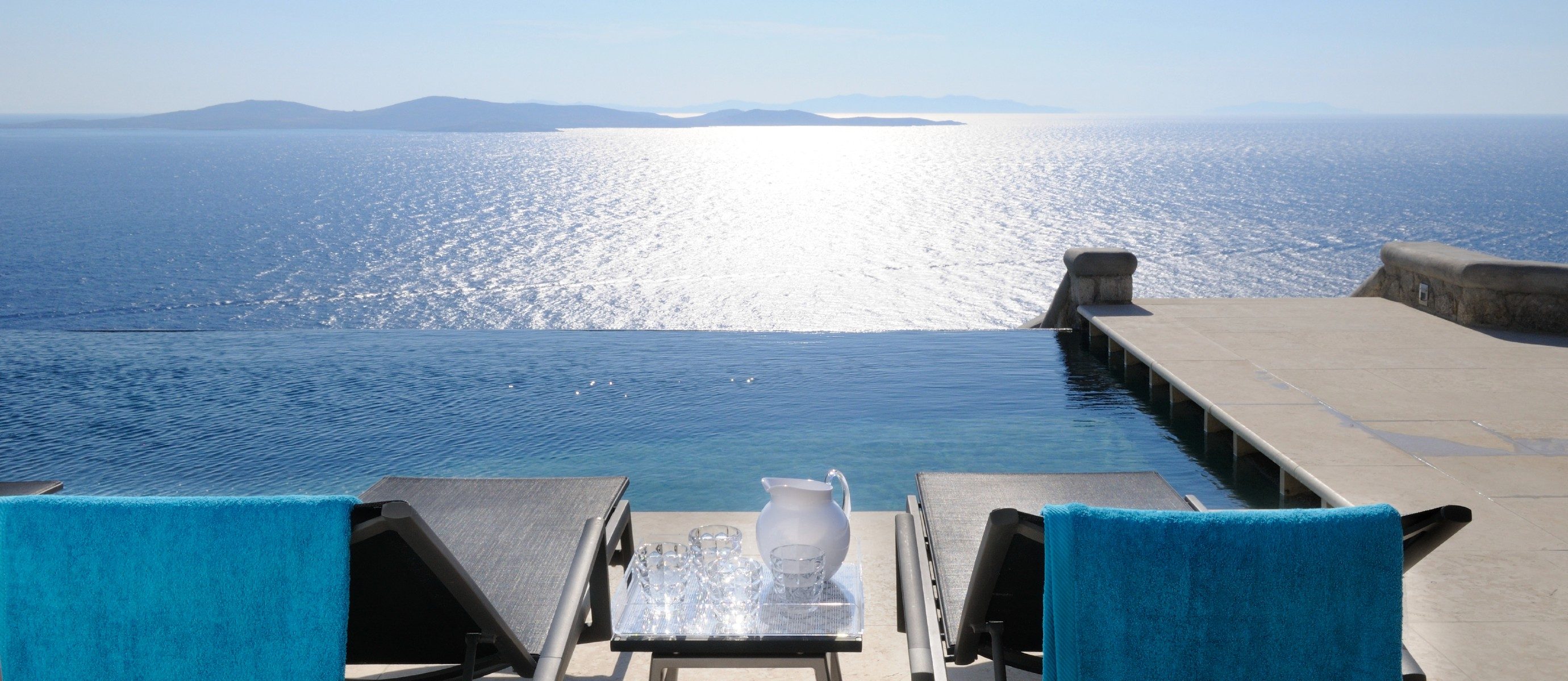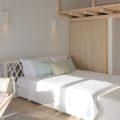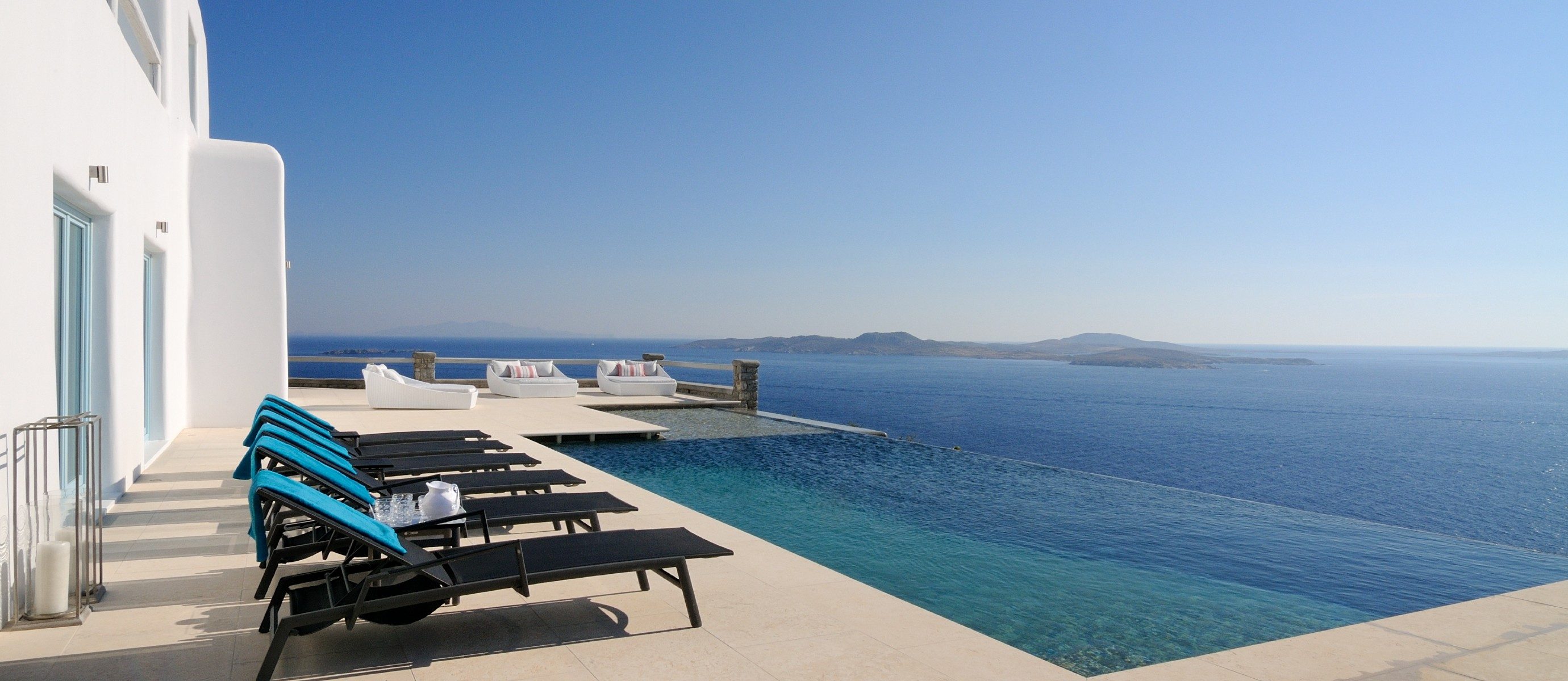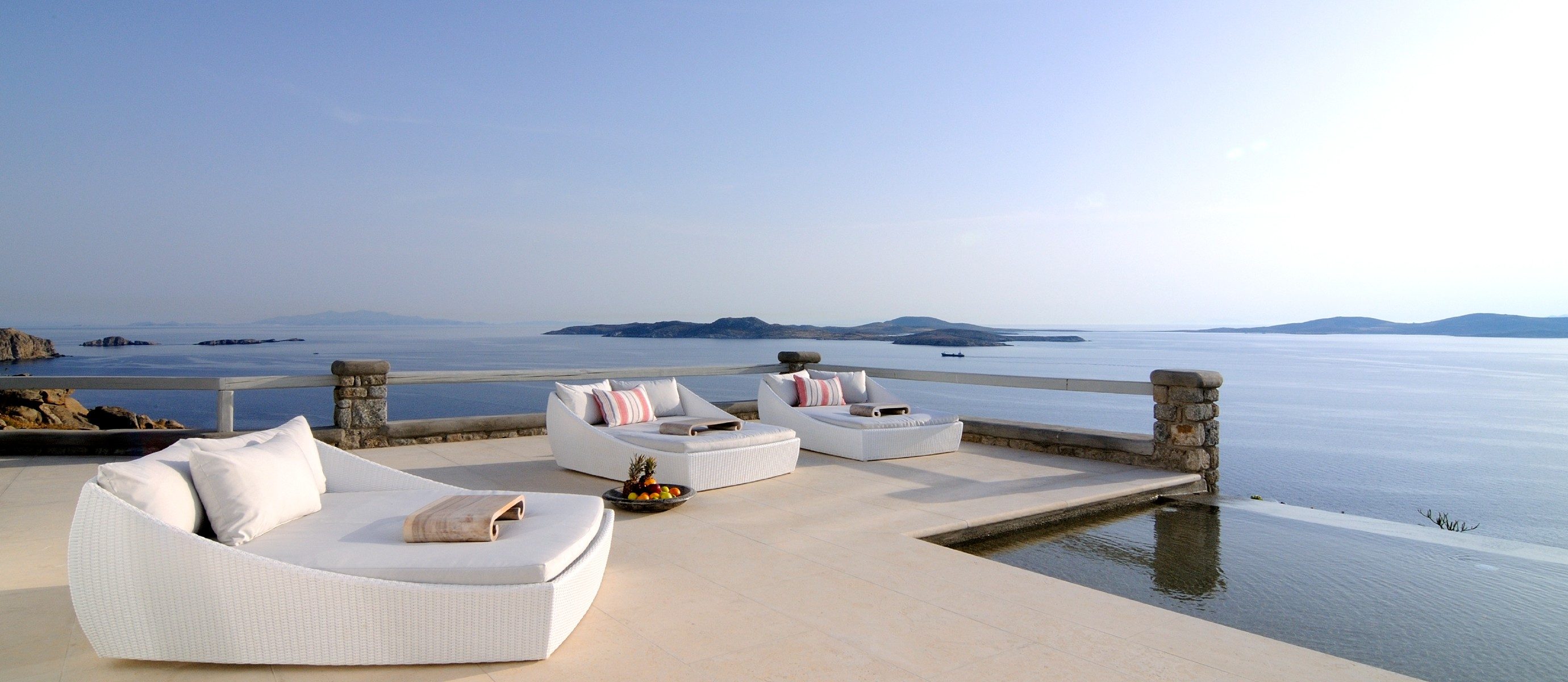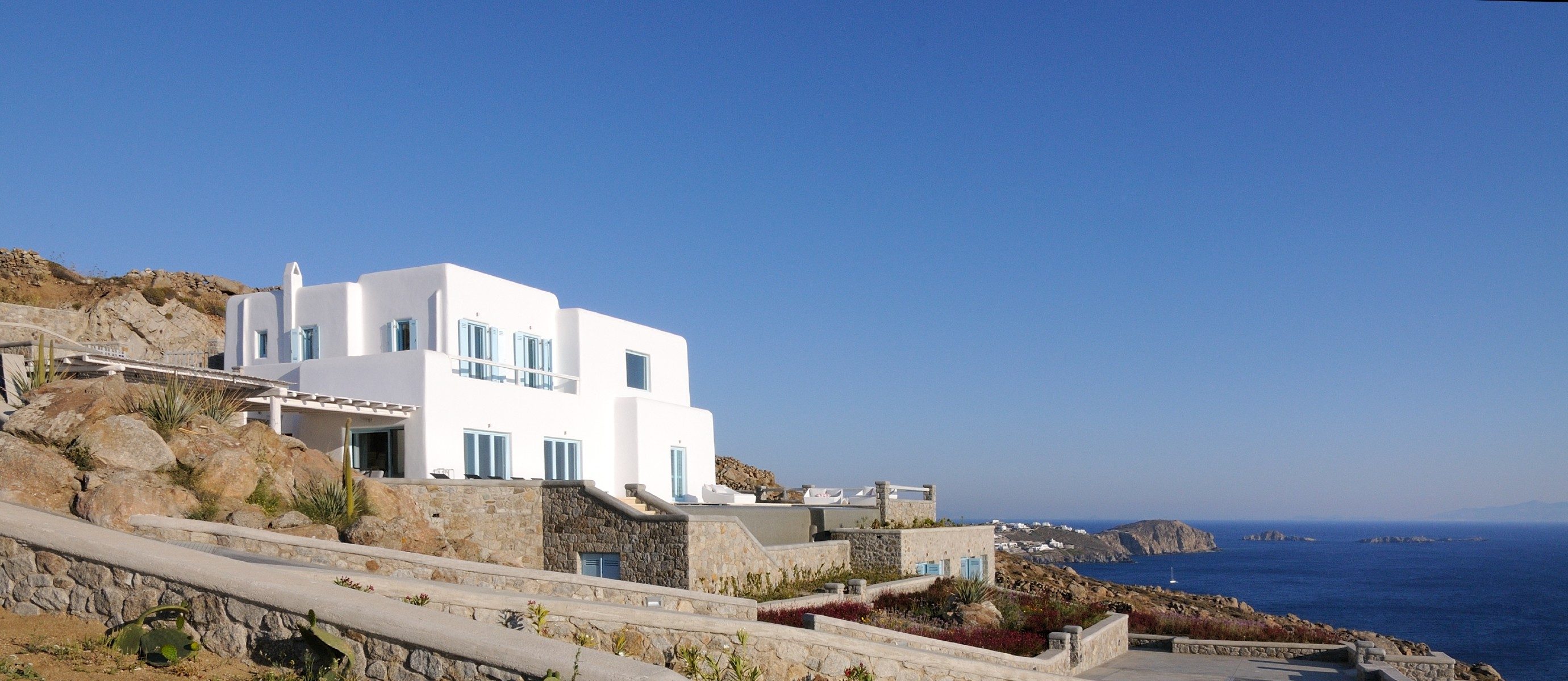 The exterior lounge and pool area have marvellous unobstructed sunset views of the island of Delos and Rheinia. The interiors follow the white minimalist Mediterranean style of Cyclades, white surfaces, arches and washed wood. All bedrooms are decorated with soft luxurious Ag. Sostis fabrics, while bathrooms are modern and fully equipped.