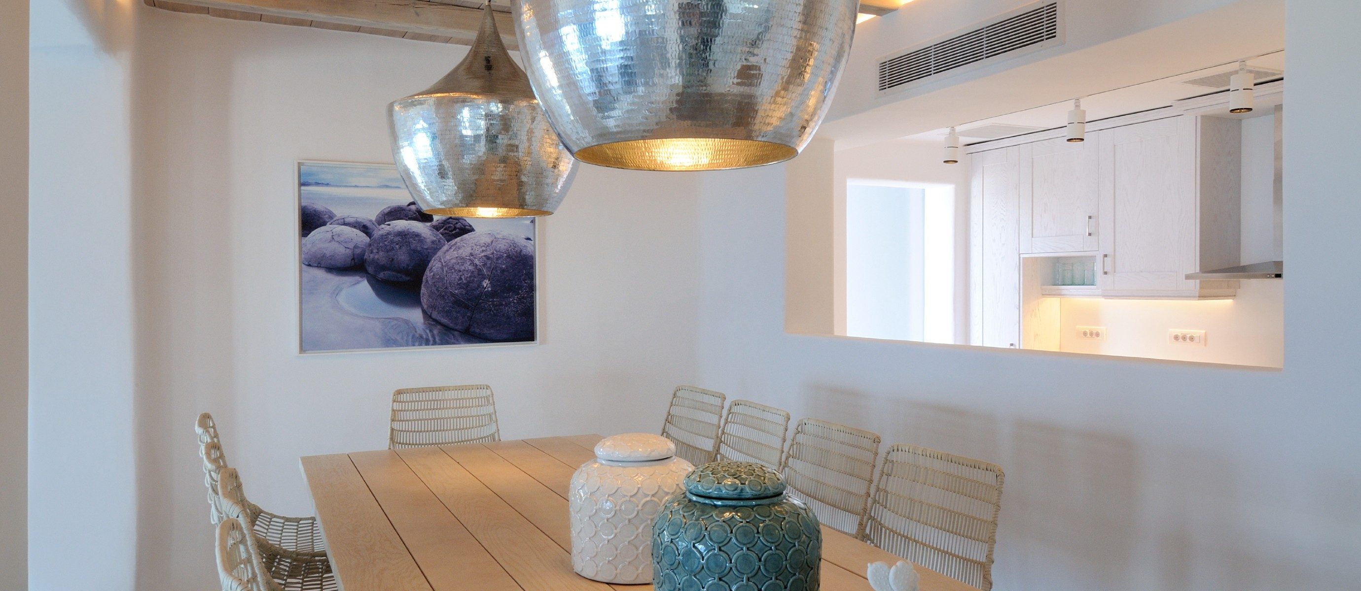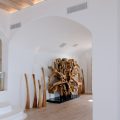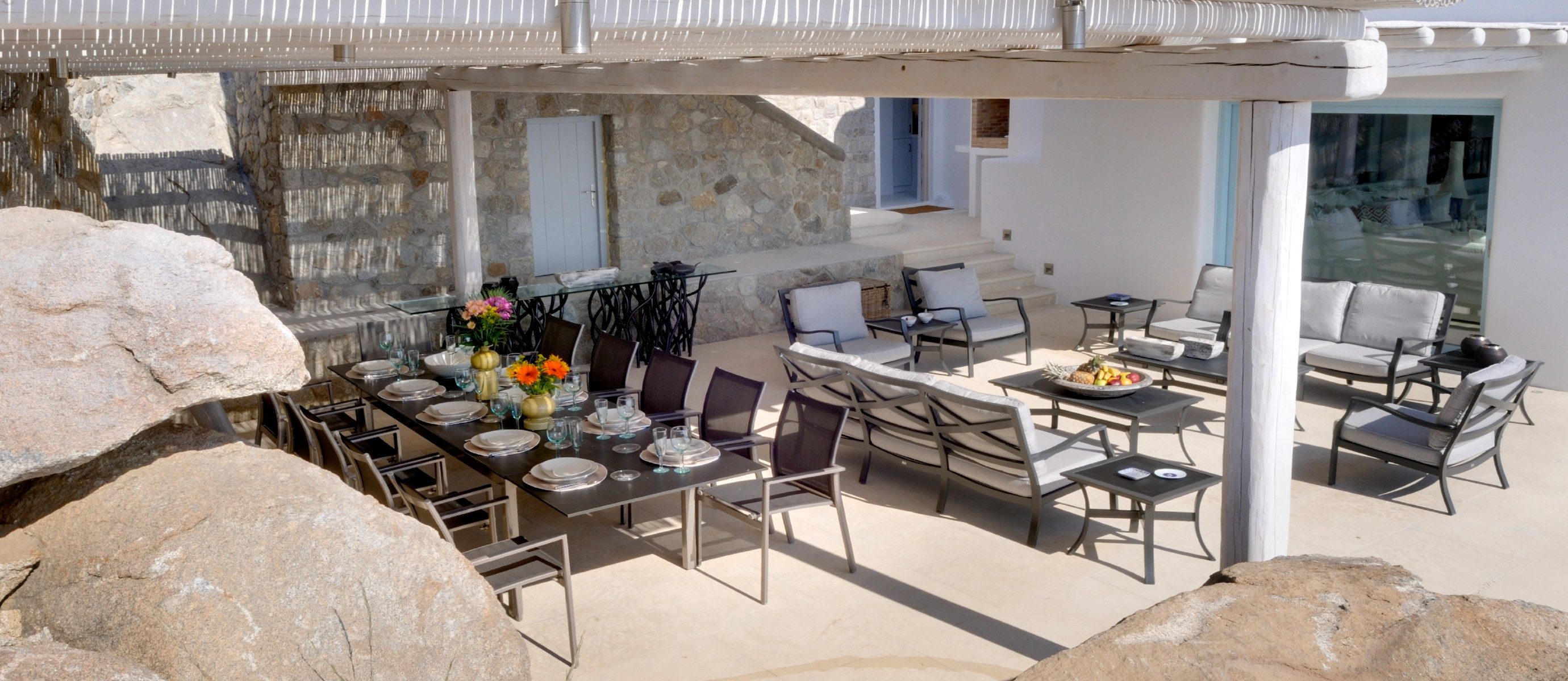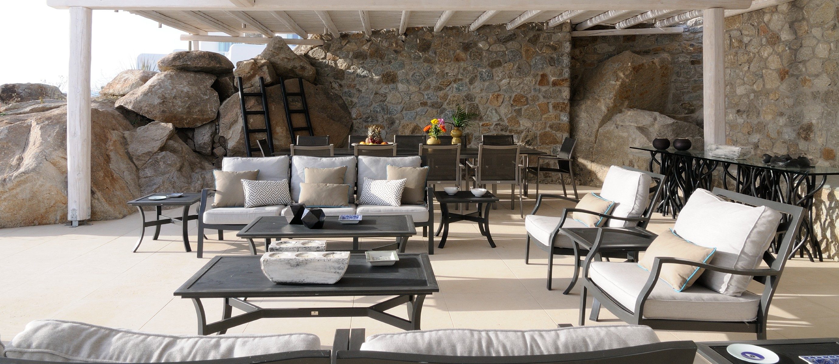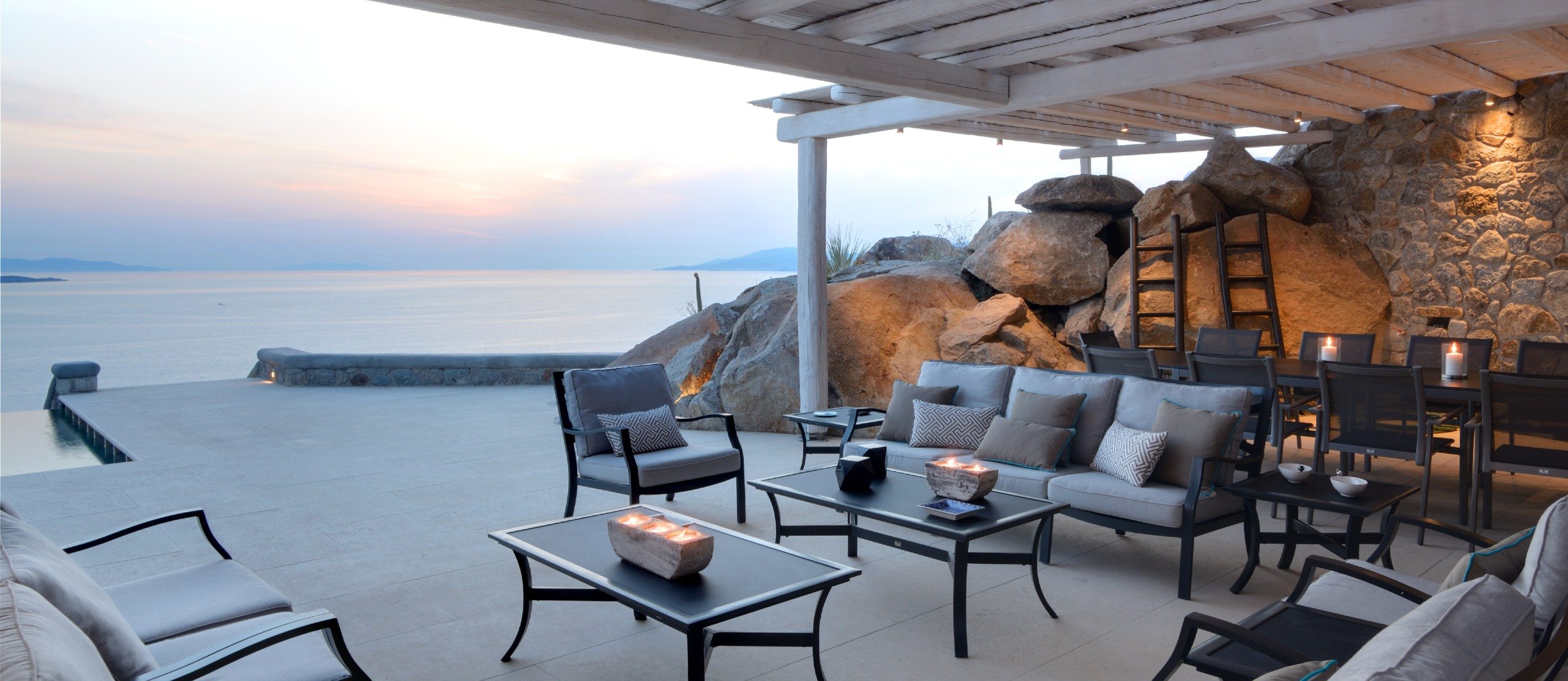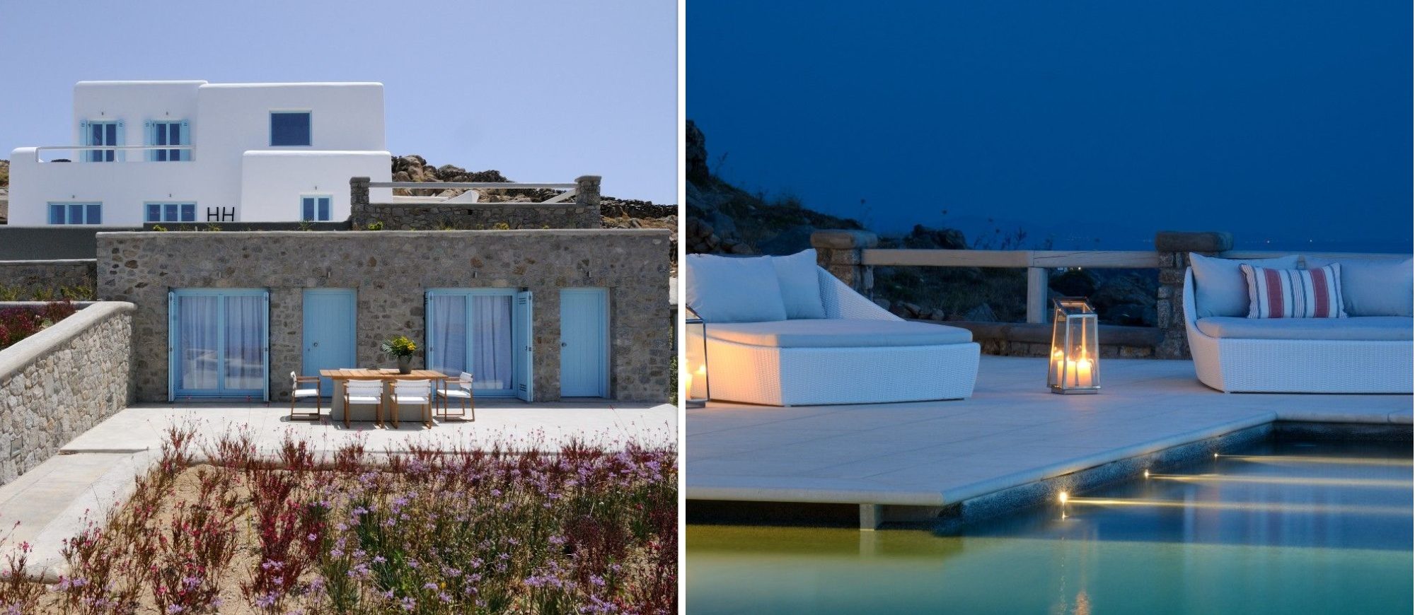 The exterior lounge and pool area have marvellous unobstructed sunset views of the island of Delos and Rheinia. The interiors follow the white minimalist Mediterranean style of Cyclades, white surfaces, arches and washed wood. All bedrooms are decorated with soft luxurious Ag. Sostis fabrics, while bathrooms are modern and fully equipped.
