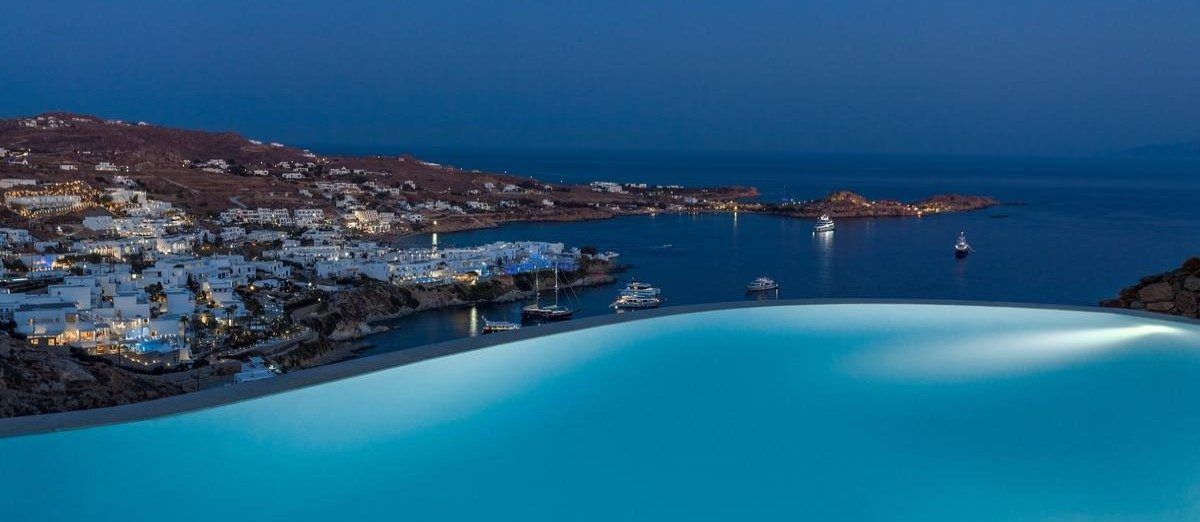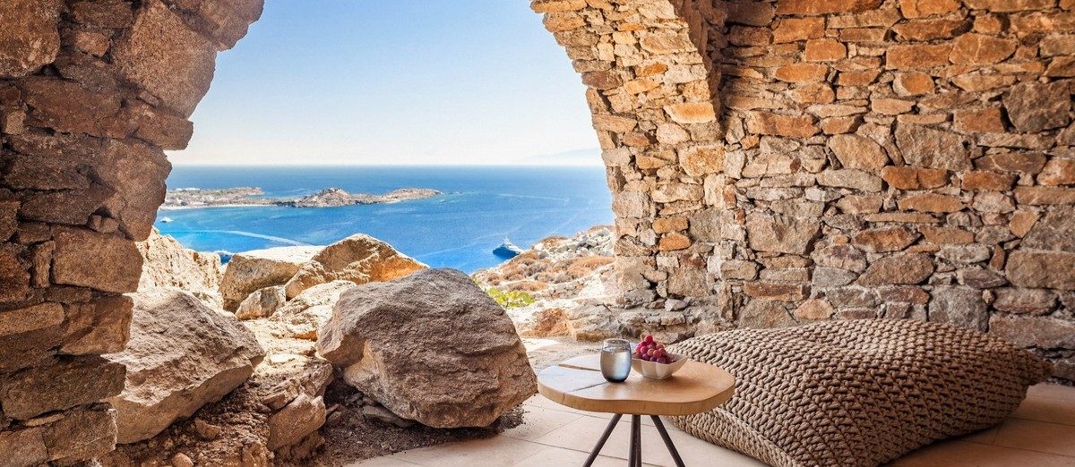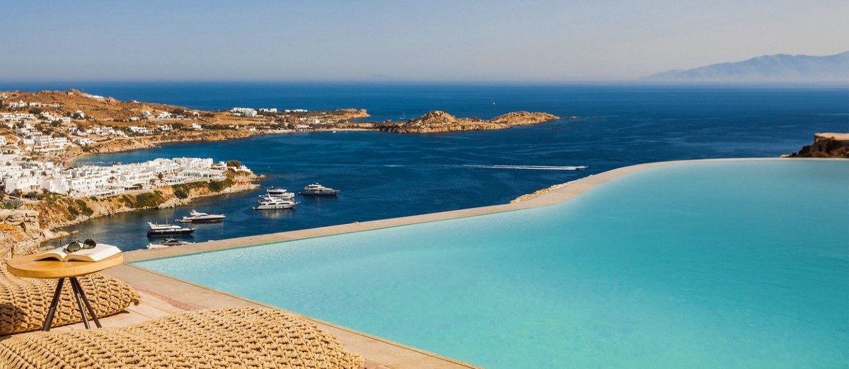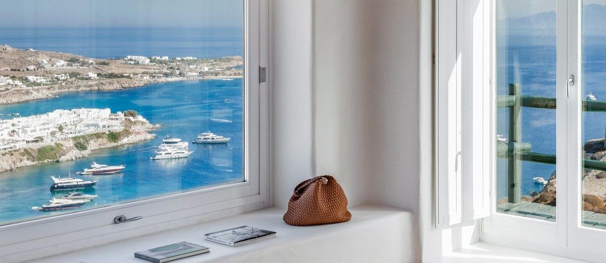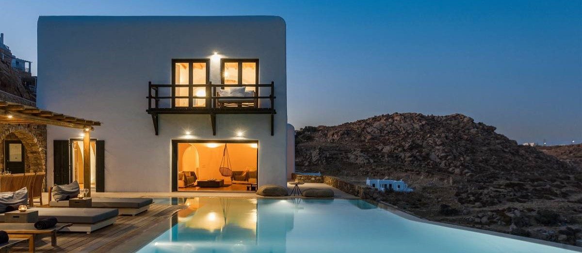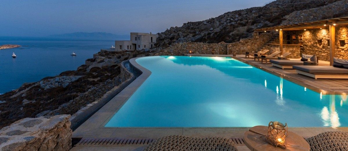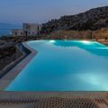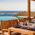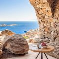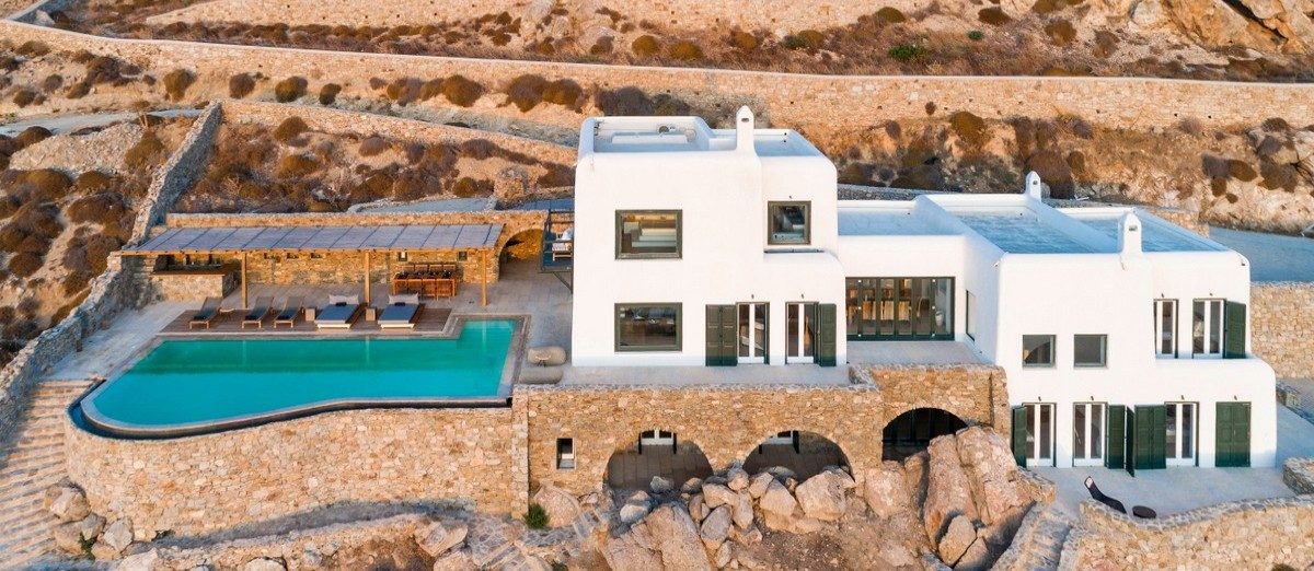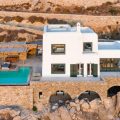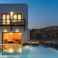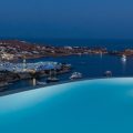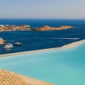 Perched on a cliff above the trendy beach of Psarou in Mykonos, with towering views over the bay and the Aegean Sea, this gorgeous, newly renovated vacation residence is a perfect fusion of Cycladic purity and cosmopolitan affluence. This remarkable three-story, six bedroom villa can welcome up to twelve guests in sophisticated luxury.