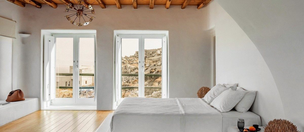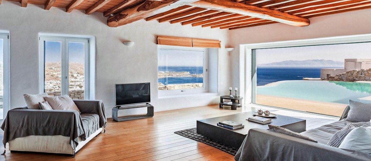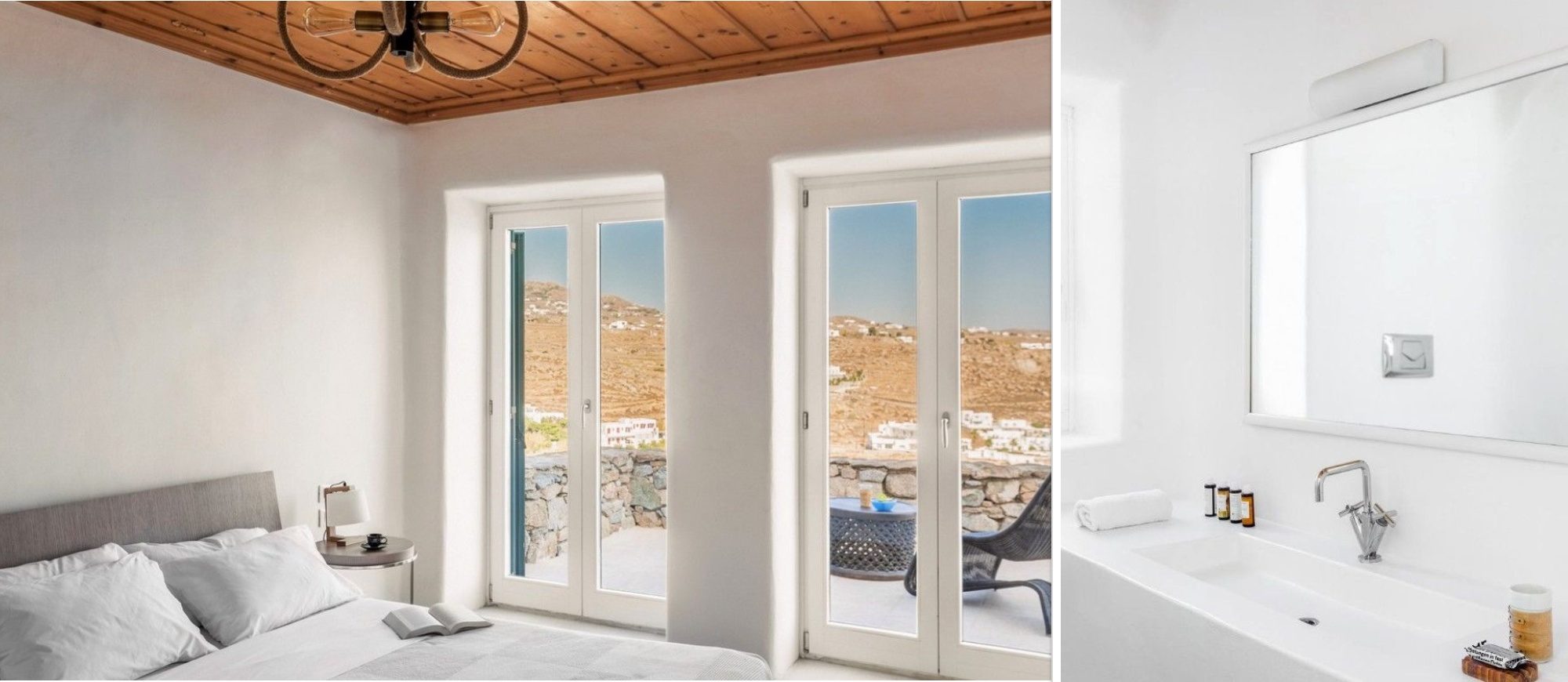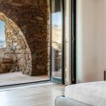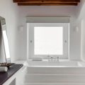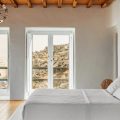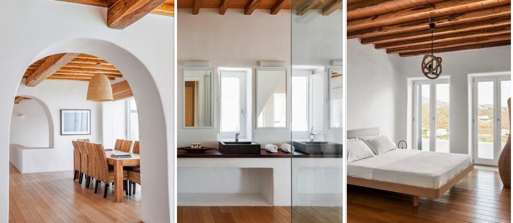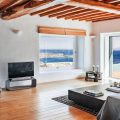 The spacious interiors of this villa are airy and filled with light from floor-to-ceiling windows. Cool white accentuated by wood beam ceilings is the dominant note of this ultra-chic space, while arches and built-in elements are a nod to Cycladic tradition. The bedrooms are inviting and luxurious, each with a sleek en-suite bathroom, generous closets, and lovely views of the Aegean. There are multiple common areas spread throughout the three levels of the villa, as well as a phenomenal, fully equipped kitchen.