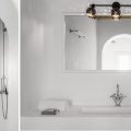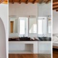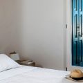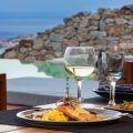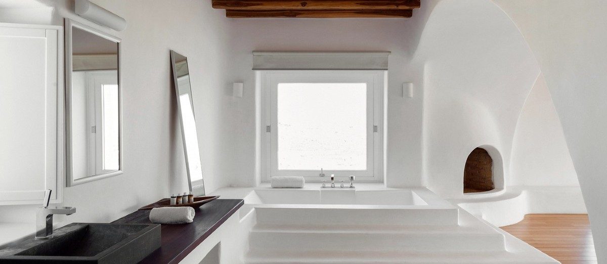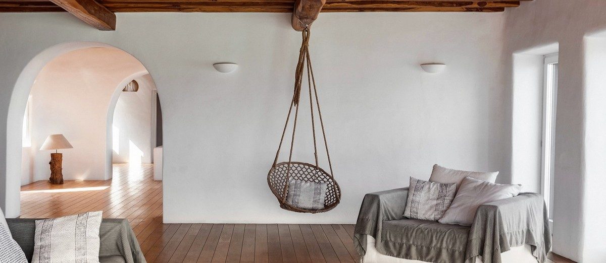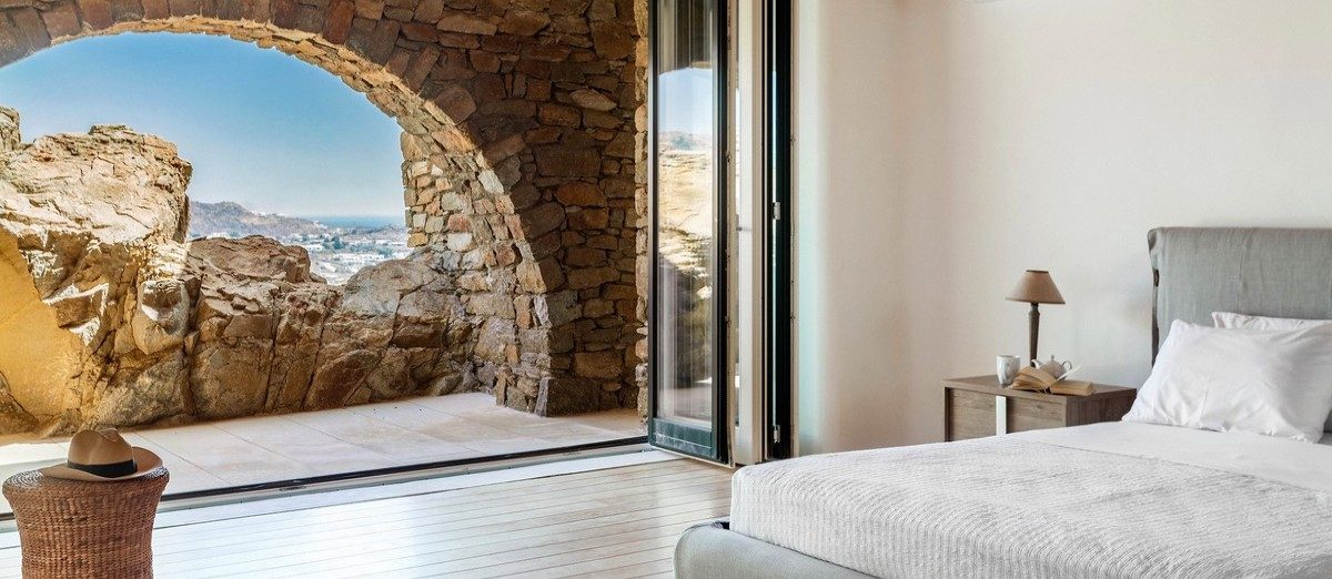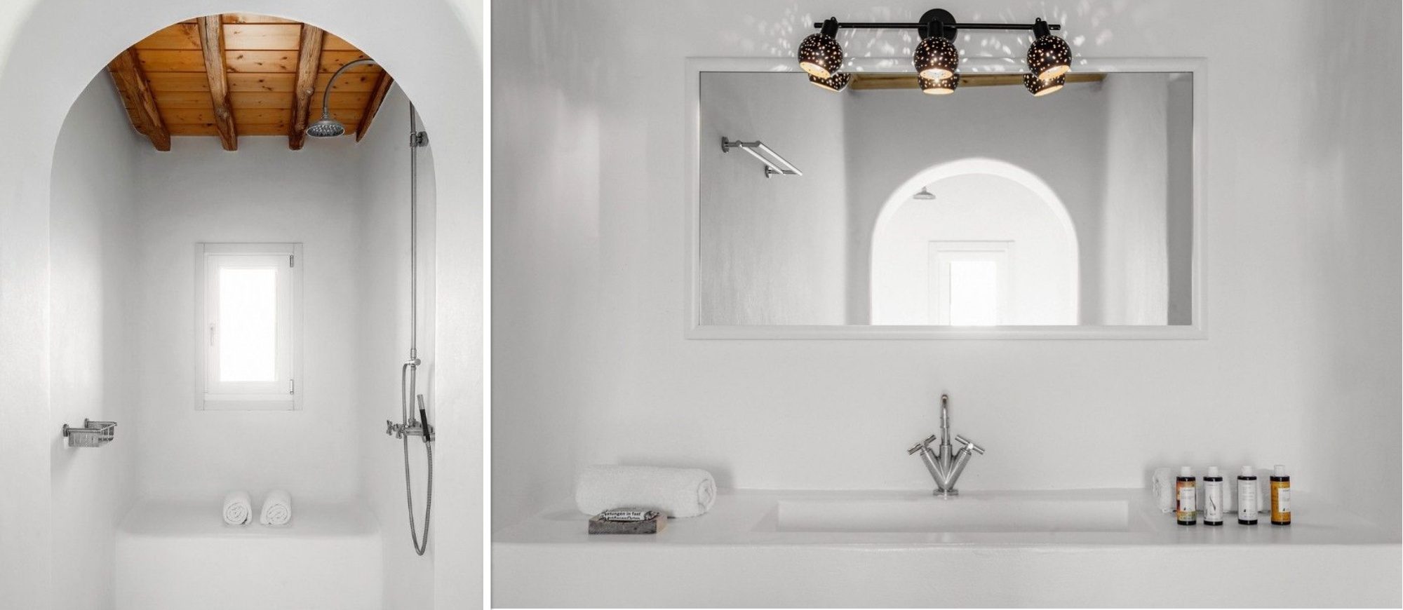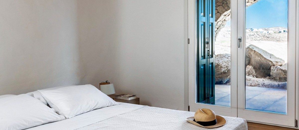 The spacious interiors of this villa are airy and filled with light from floor-to-ceiling windows. Cool white accentuated by wood beam ceilings is the dominant note of this ultra-chic space, while arches and built-in elements are a nod to Cycladic tradition. The bedrooms are inviting and luxurious, each with a sleek en-suite bathroom, generous closets, and lovely views of the Aegean. There are multiple common areas spread throughout the three levels of the villa, as well as a phenomenal, fully equipped kitchen.