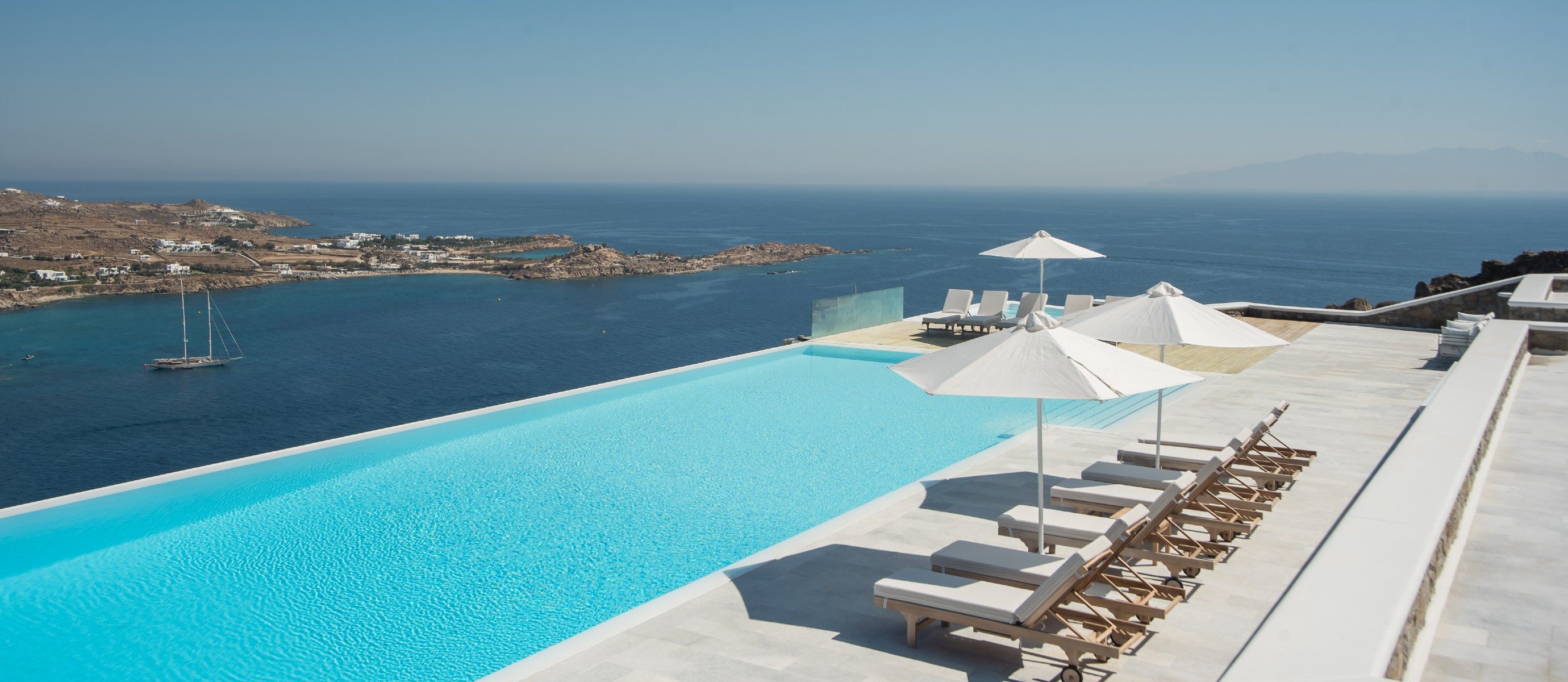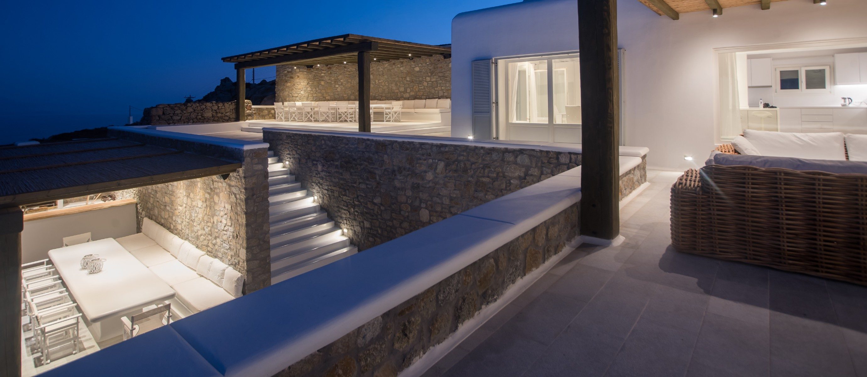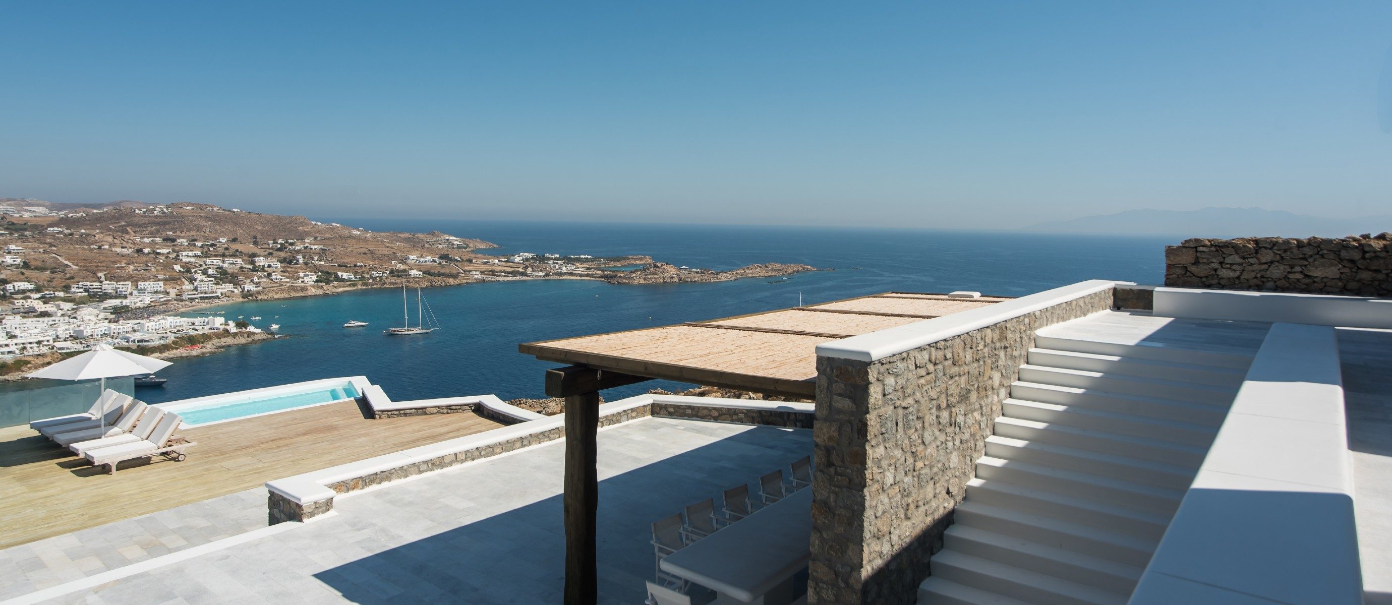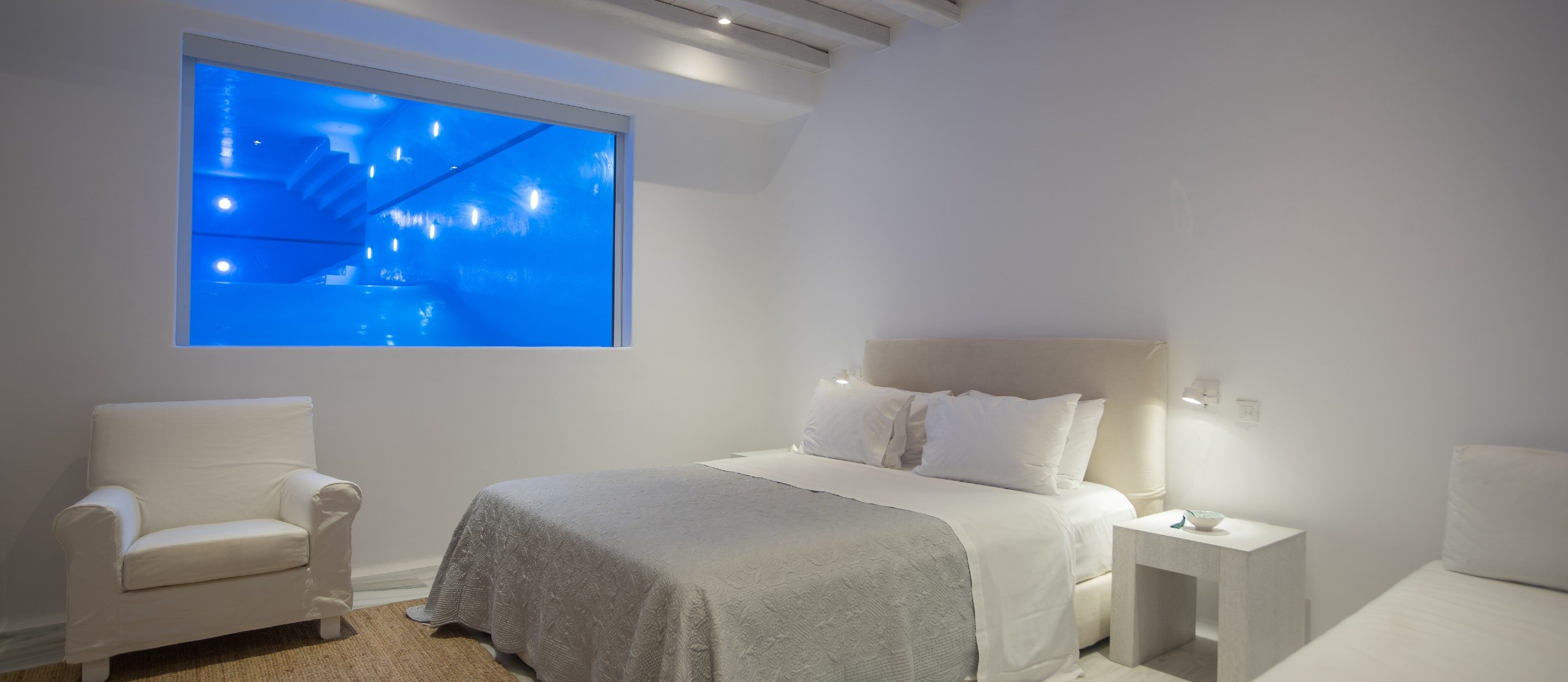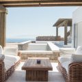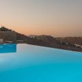 The white-washed interiors, decorated to the highest of standards, combine contemporary design with art and luxury. Psarou Heaven is an ultra-exclusive estate, ideal for those who seek top quality time with family and friends. Completely secured from the winds, the expansive terrace has every feature to keep any escapist entertained; large open spaces, plenty of outdoor lounging and eating options, a massive infinity pool, a heated Jacuzzi for eighteen, panoramic views and facilities to cater for 20 guests.
