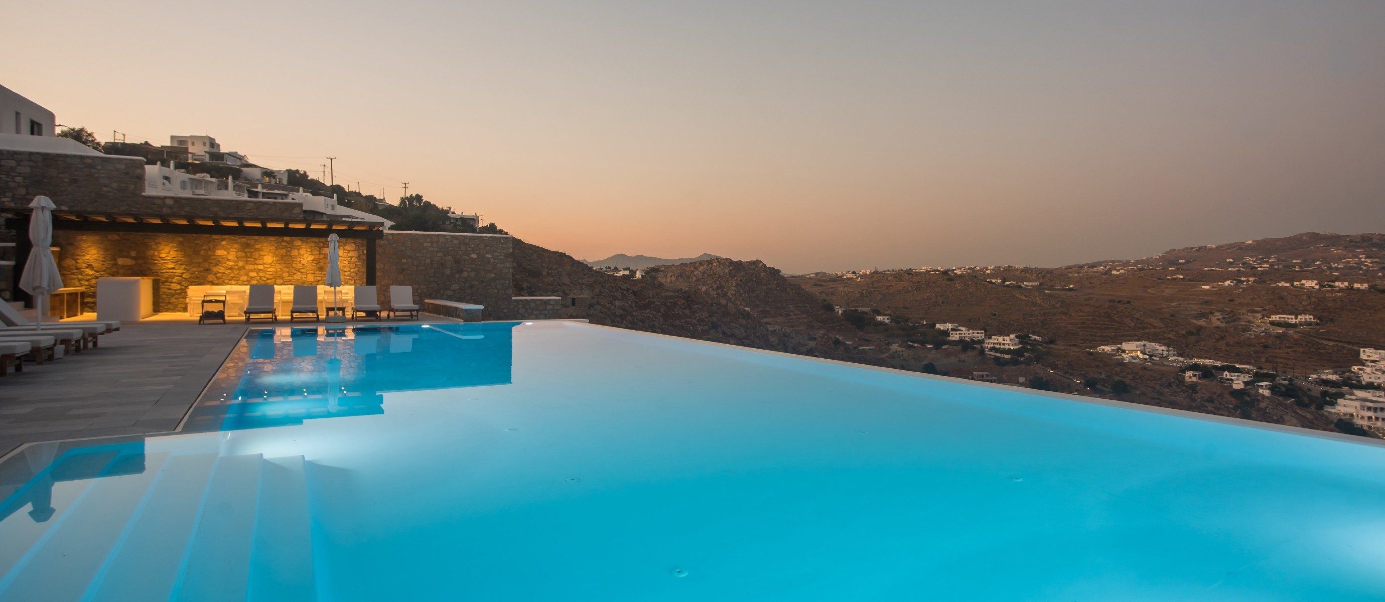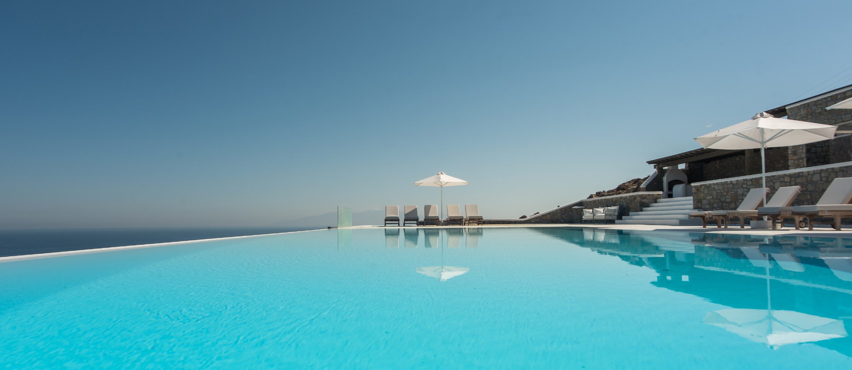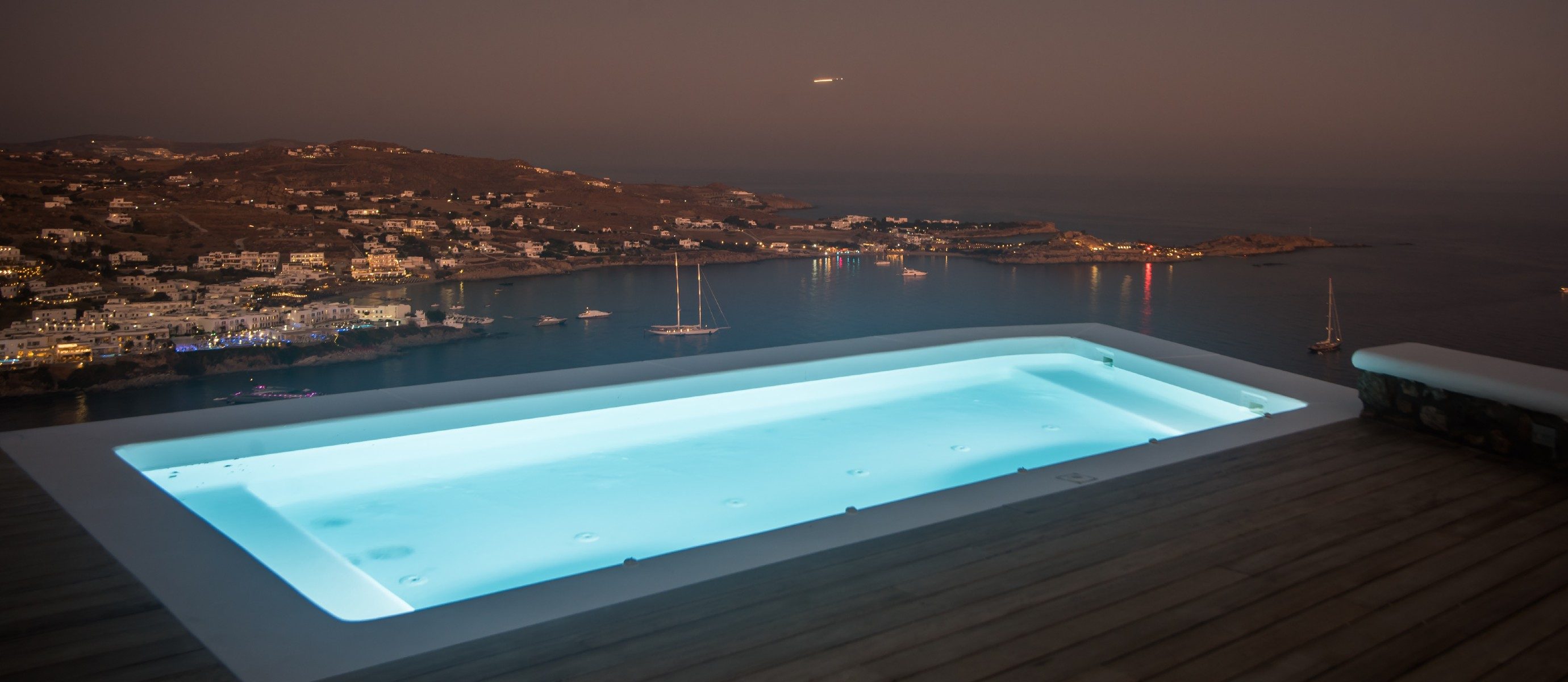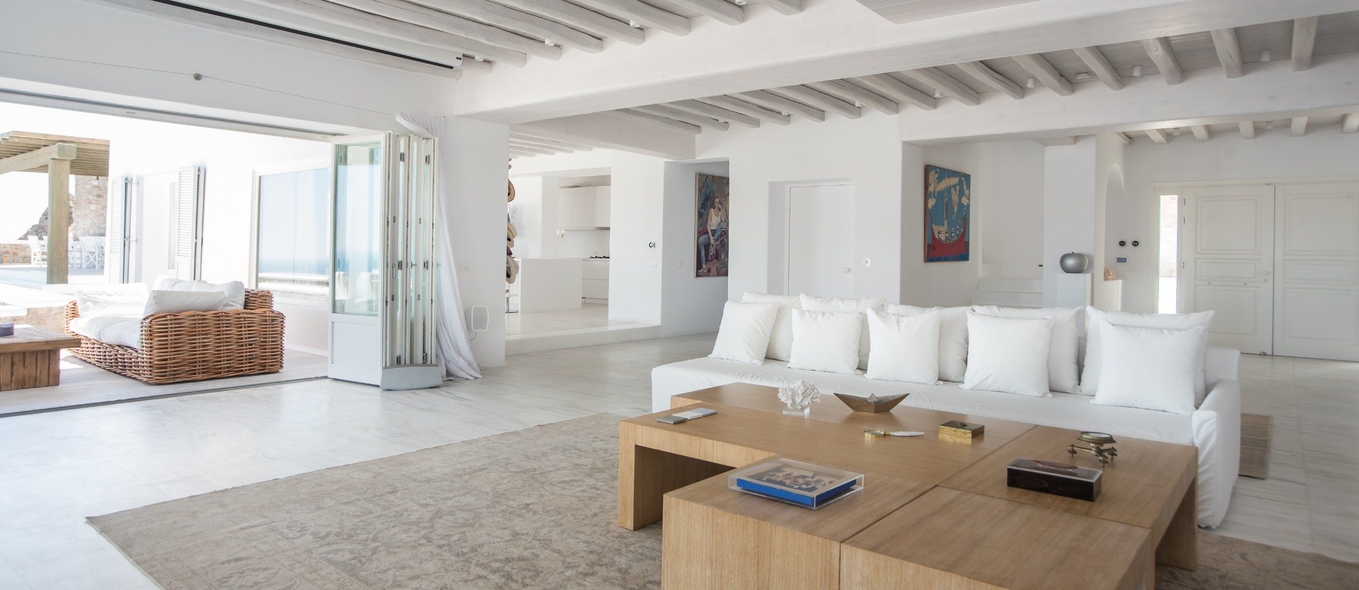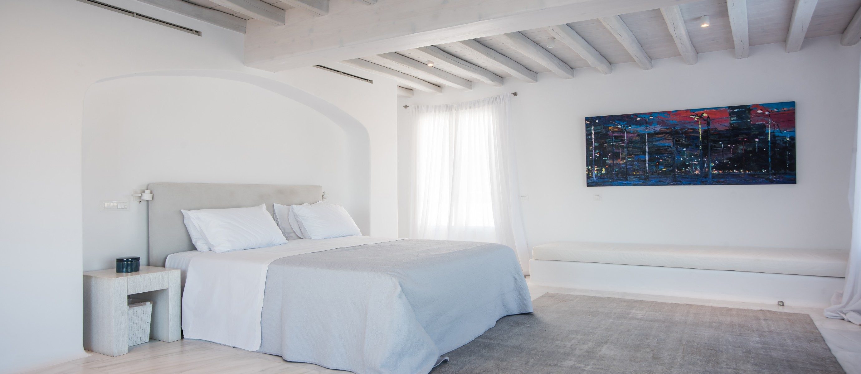 The white-washed interiors, decorated to the highest of standards, combine contemporary design with art and luxury. Psarou Heaven is an ultra-exclusive estate, ideal for those who seek top quality time with family and friends. Completely secured from the winds, the expansive terrace has every feature to keep any escapist entertained; large open spaces, plenty of outdoor lounging and eating options, a massive infinity pool, a heated Jacuzzi for eighteen, panoramic views and facilities to cater for 20 guests.