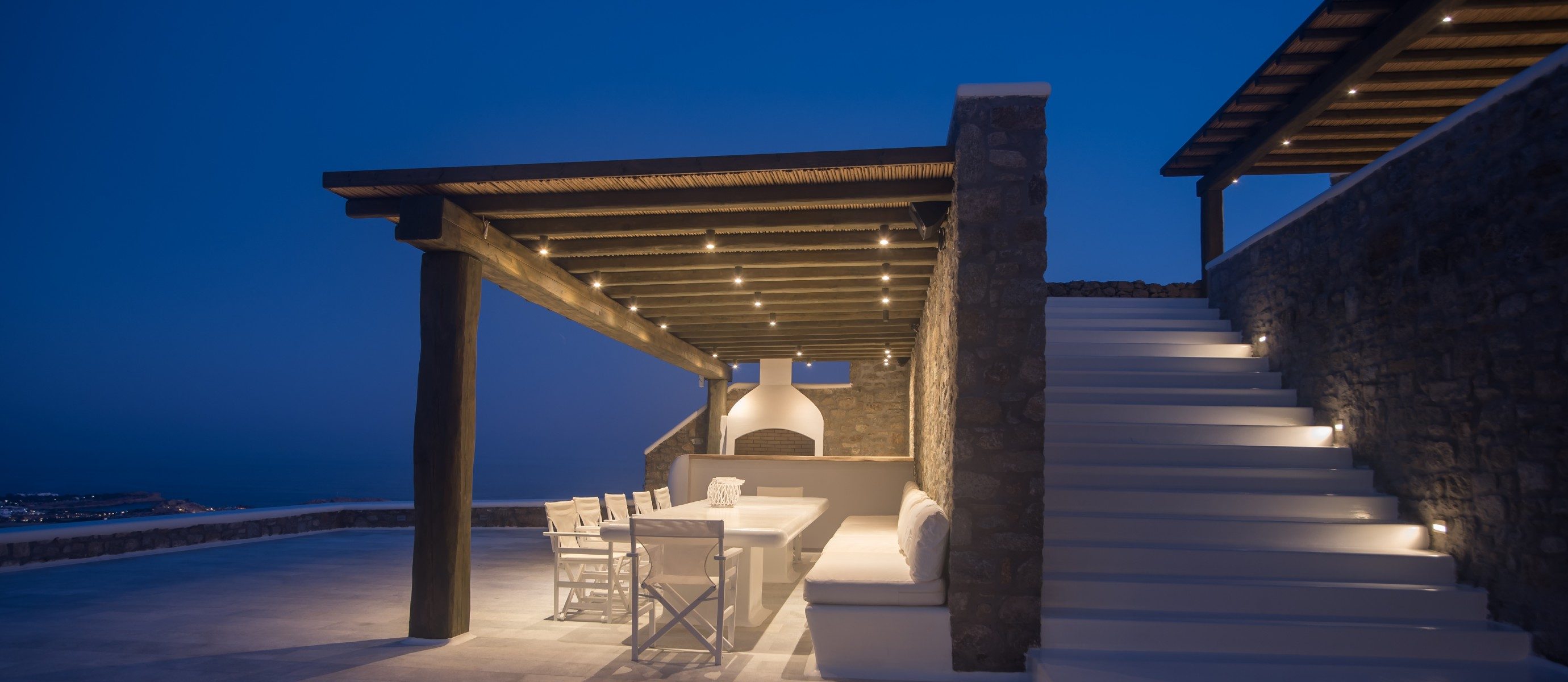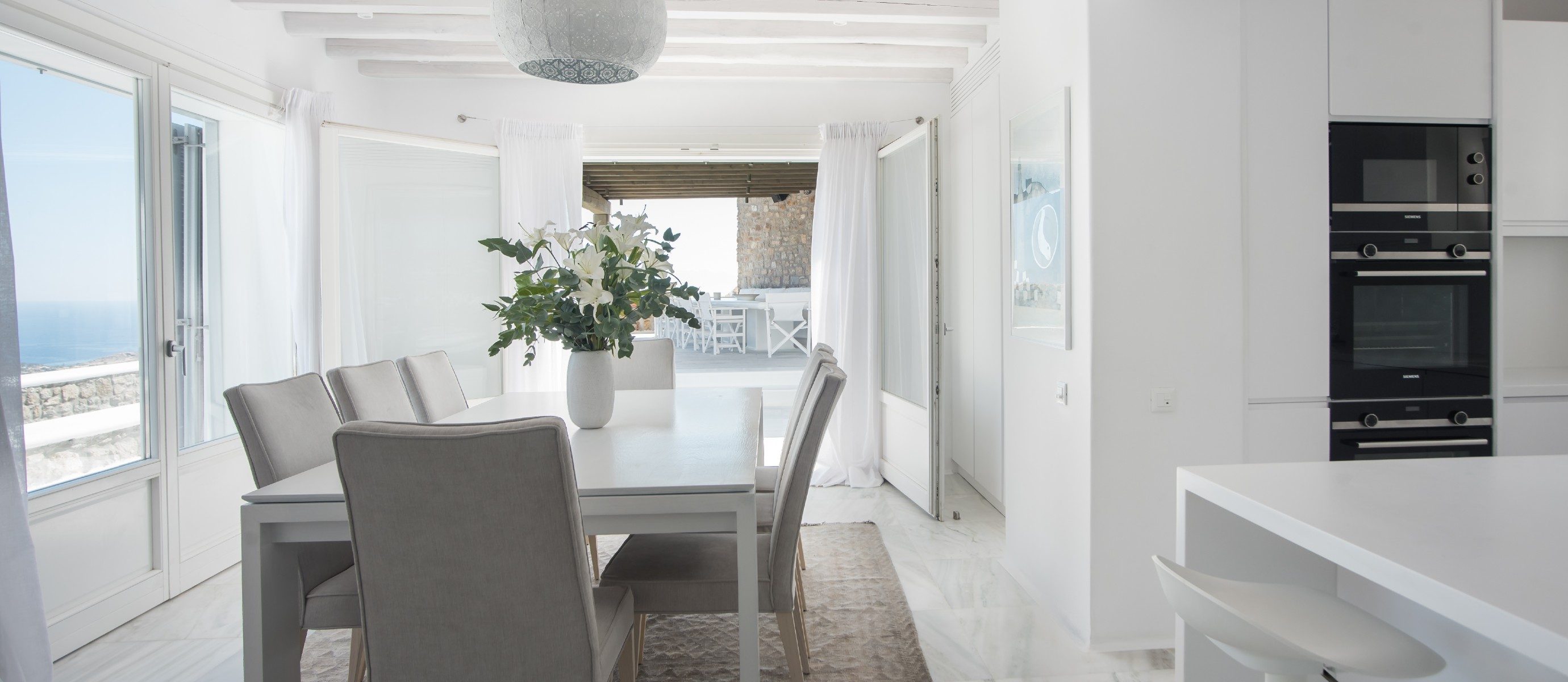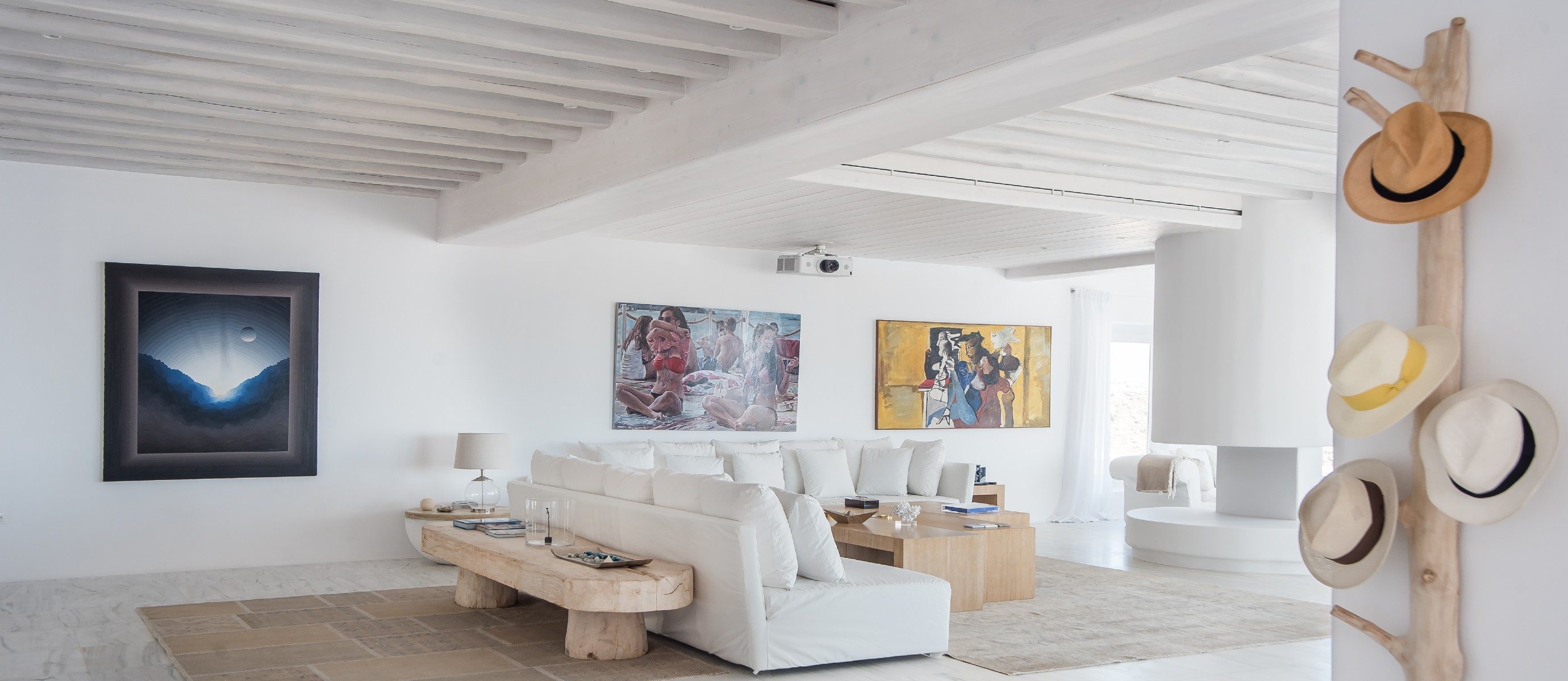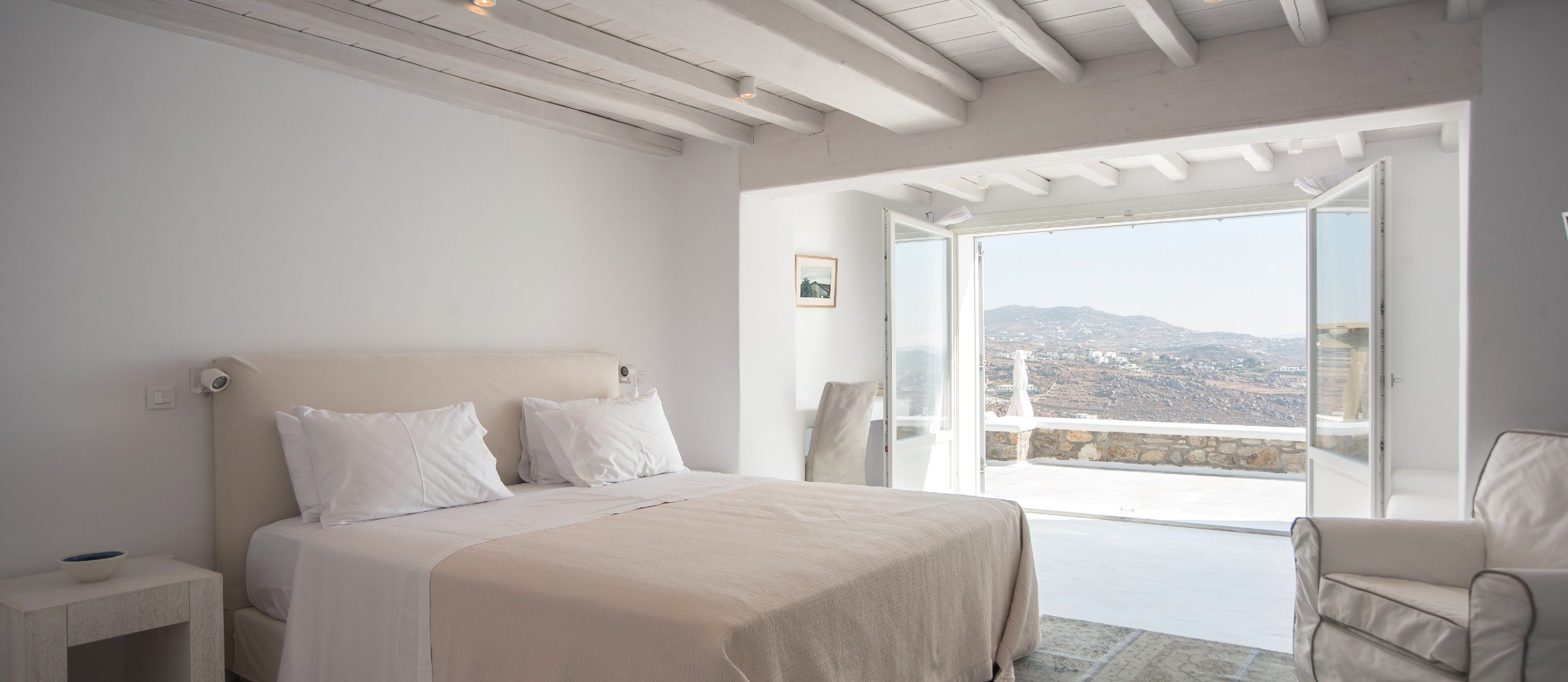 The white-washed interiors, decorated to the highest of standards, combine contemporary design with art and luxury. Psarou Heaven is an ultra-exclusive estate, ideal for those who seek top quality time with family and friends. Completely secured from the winds, the expansive terrace has every feature to keep any escapist entertained; large open spaces, plenty of outdoor lounging and eating options, a massive infinity pool, a heated Jacuzzi for eighteen, panoramic views and facilities to cater for 20 guests.