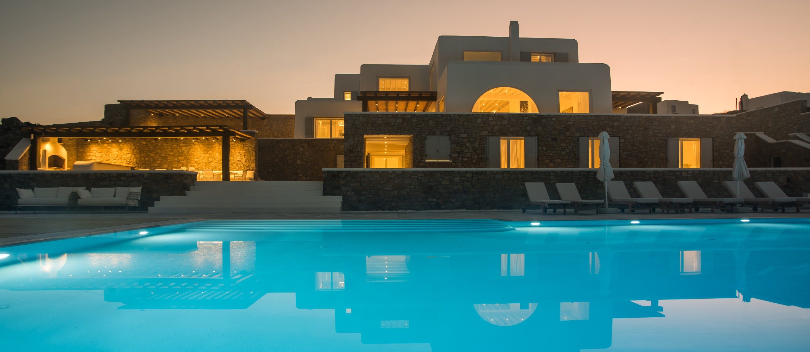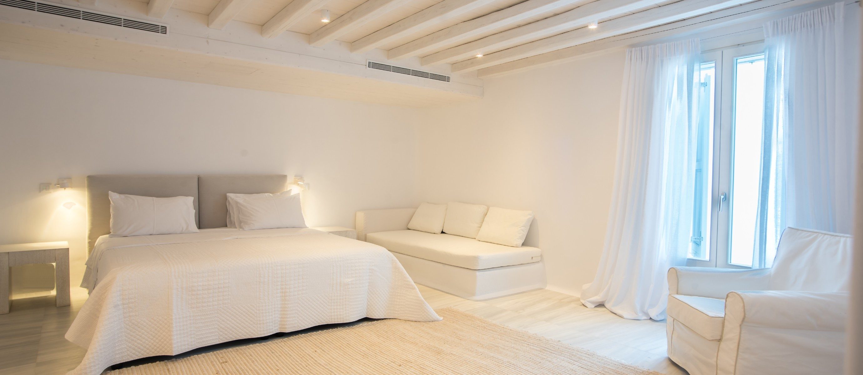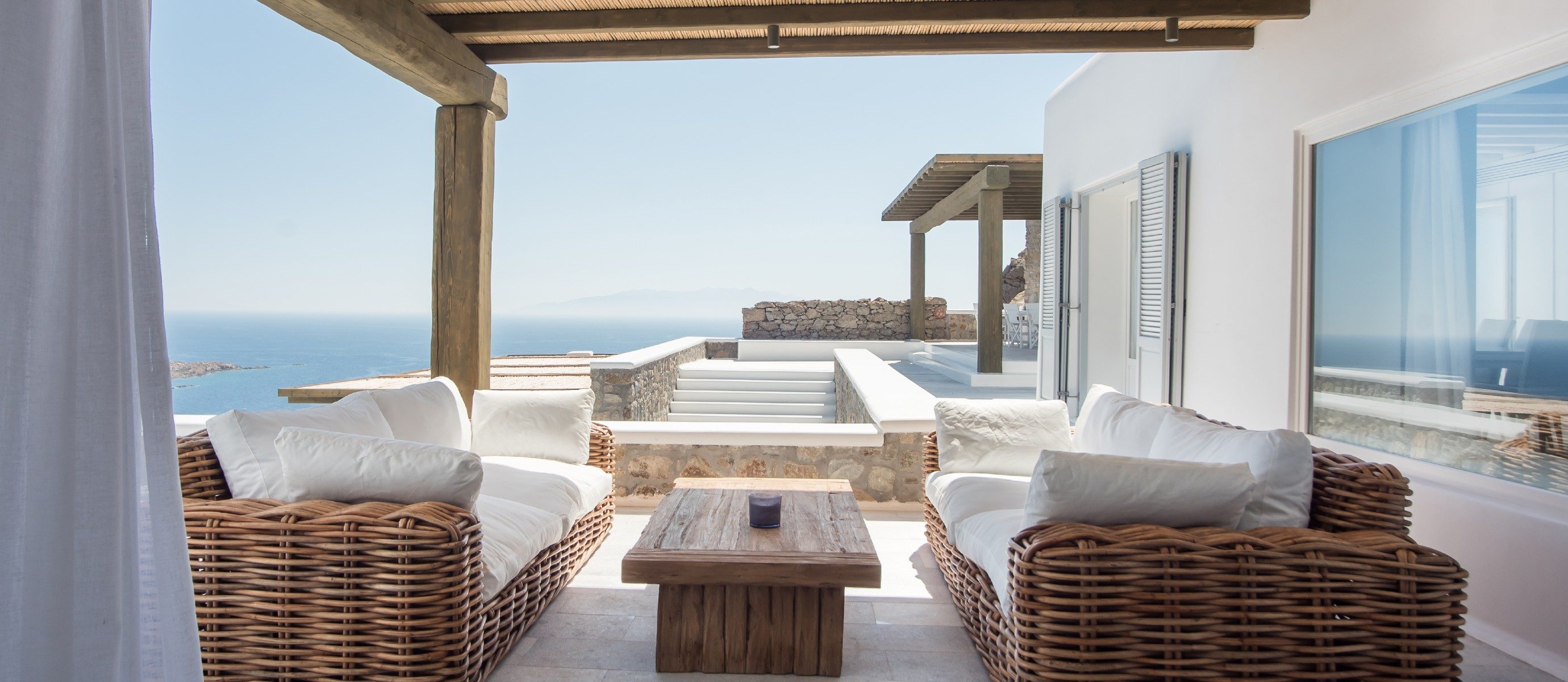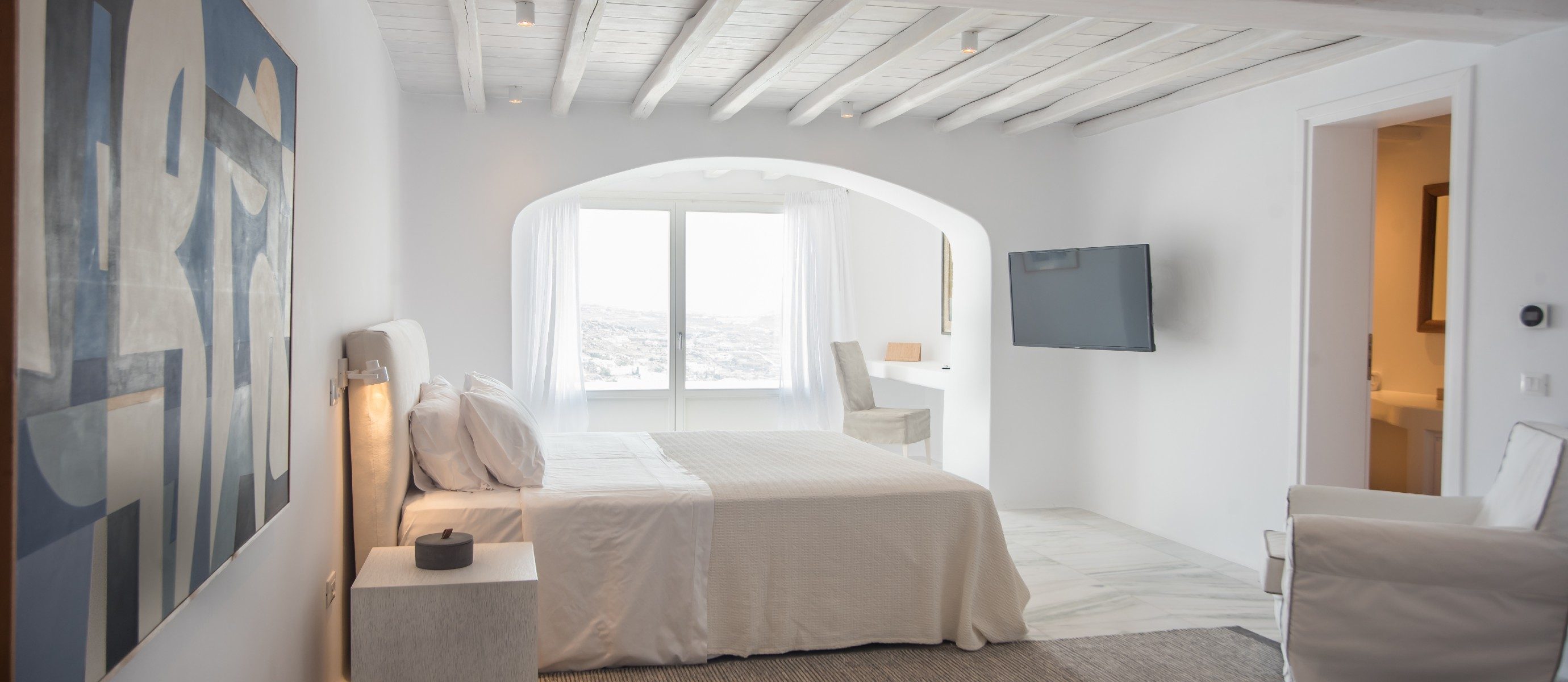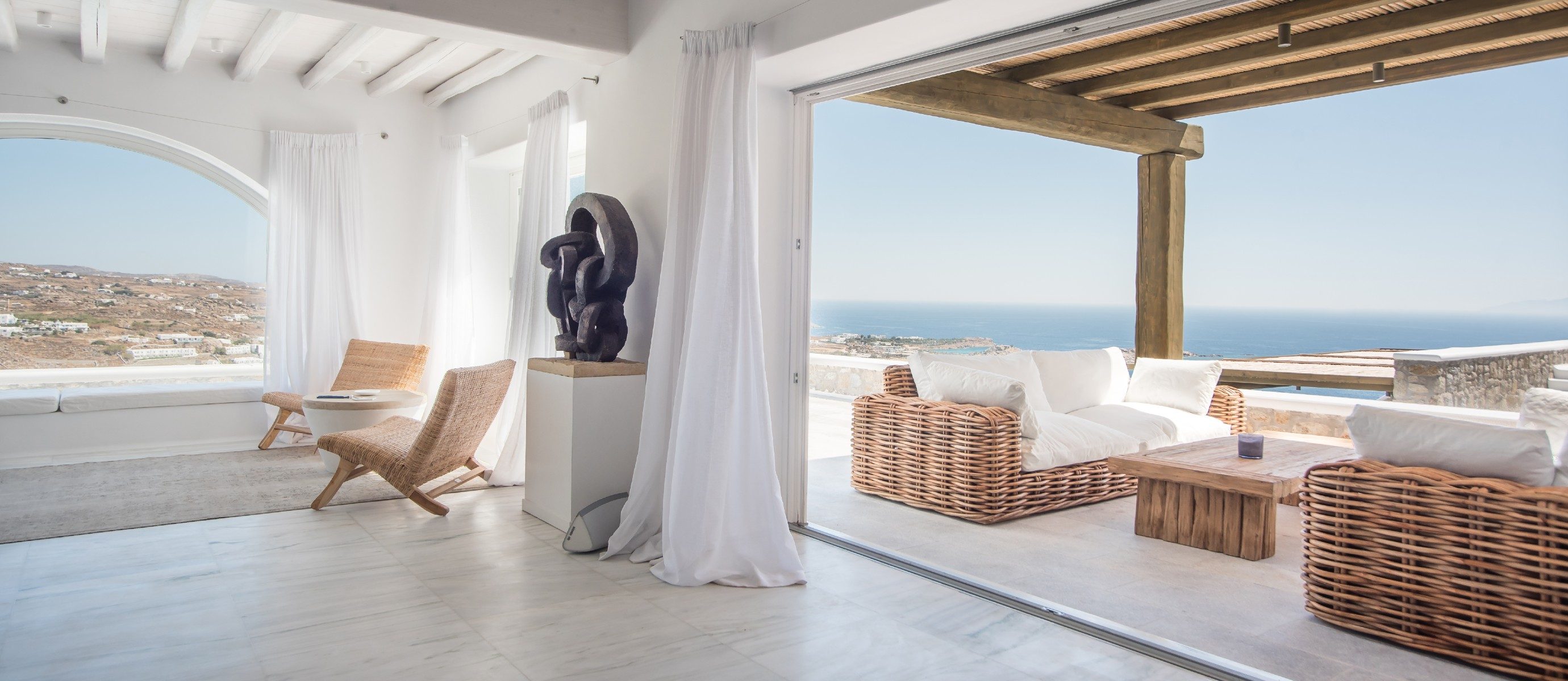 The white-washed interiors, decorated to the highest of standards, combine contemporary design with art and luxury. Psarou Heaven is an ultra-exclusive estate, ideal for those who seek top quality time with family and friends. Completely secured from the winds, the expansive terrace has every feature to keep any escapist entertained; large open spaces, plenty of outdoor lounging and eating options, a massive infinity pool, a heated Jacuzzi for eighteen, panoramic views and facilities to cater for 20 guests.