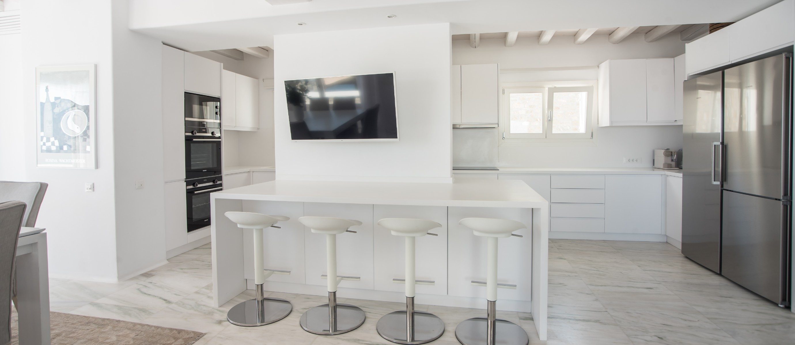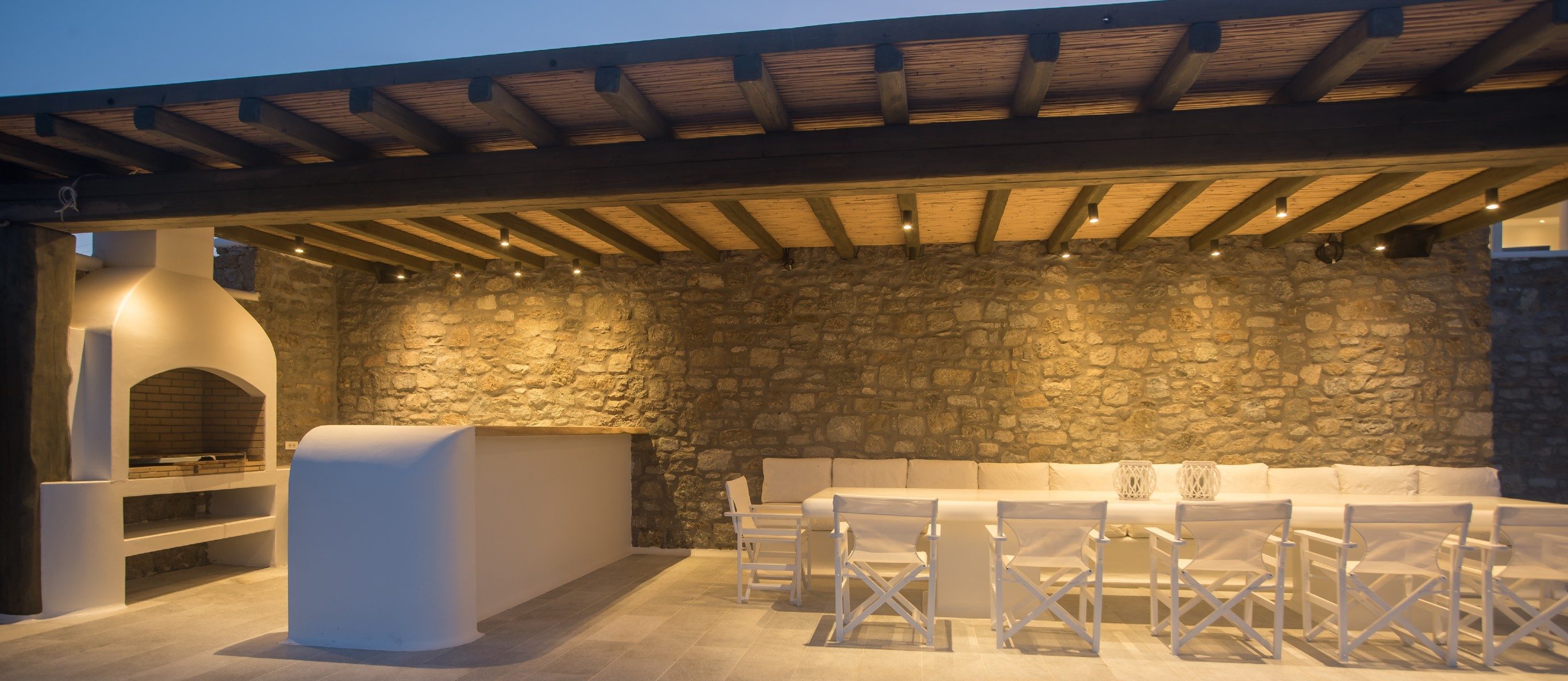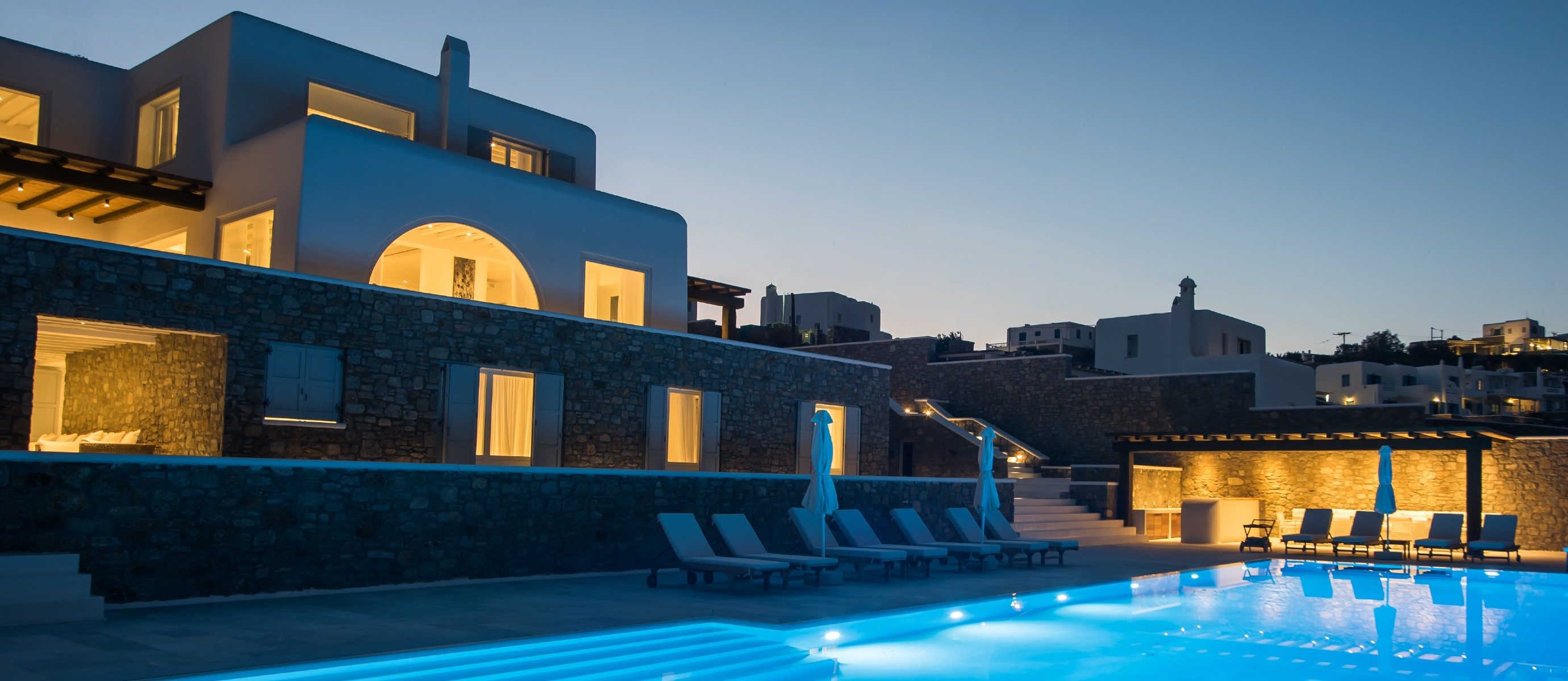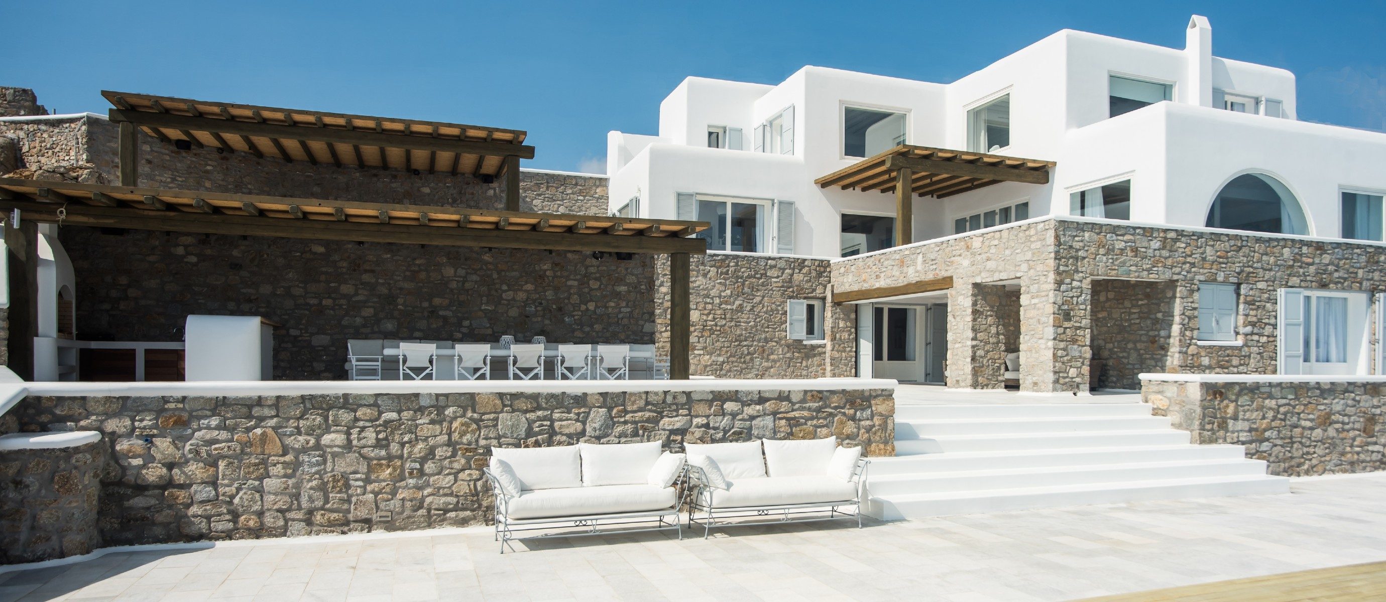 The white-washed interiors, decorated to the highest of standards, combine contemporary design with art and luxury. Psarou Heaven is an ultra-exclusive estate, ideal for those who seek top quality time with family and friends. Completely secured from the winds, the expansive terrace has every feature to keep any escapist entertained; large open spaces, plenty of outdoor lounging and eating options, a massive infinity pool, a heated Jacuzzi for eighteen, panoramic views and facilities to cater for 20 guests.