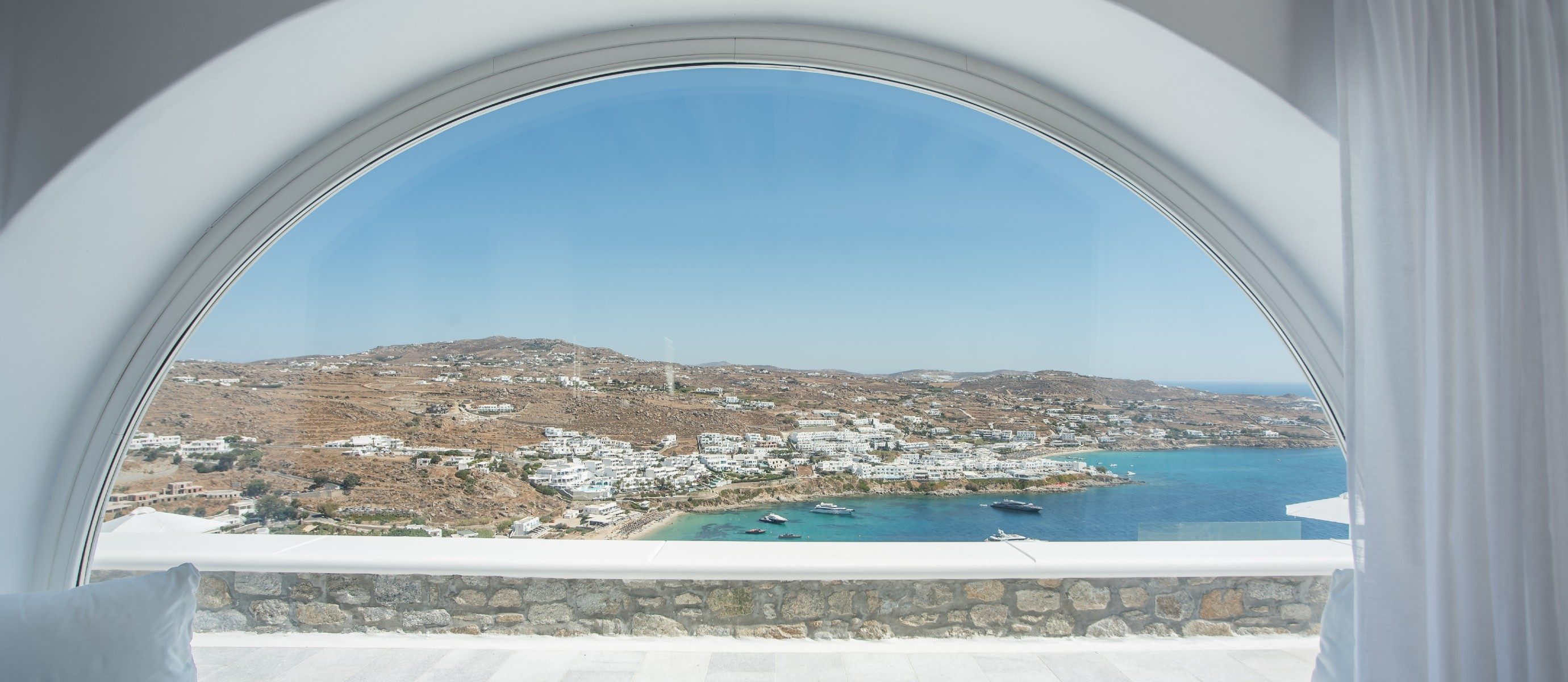 One of the most magnificent views in Mykonos, overhanging at the edge of the rocky shore