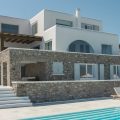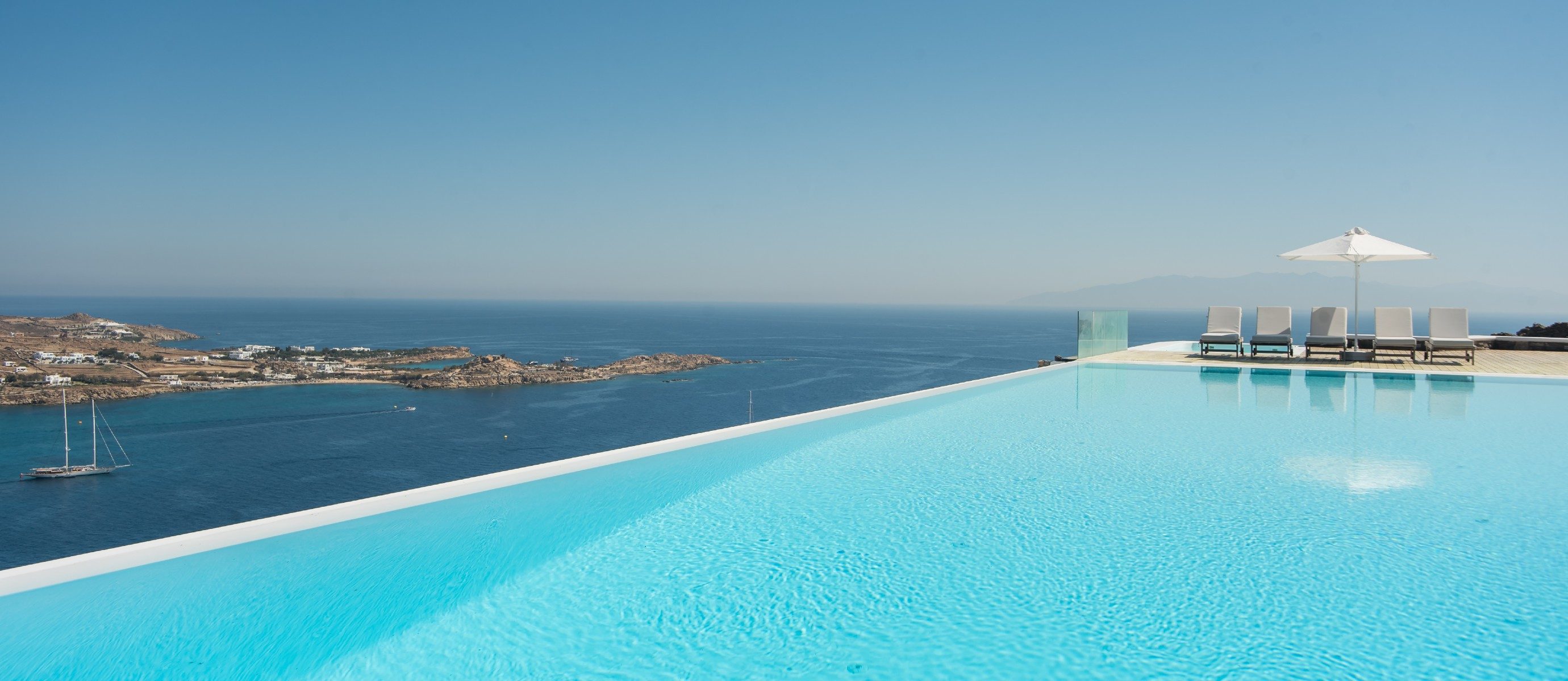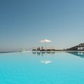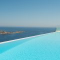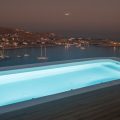 This superbly constructed property enjoys one of the most magnificent views in Mykonos, over the famous beach of Psarou, less than 3 kms from town centre. Overhanging at the very edge of the rocky shore, the villa consists of spacious living areas and terraces with breath-taking views to the Cycladic islands and the Aegean Sea. The infinity swimming pool area provides privacy and comfort to its guests where plenty of cozy corners create an unforgettable ambience. White marble terraces surround the pool with sunbeds and umbrellas.