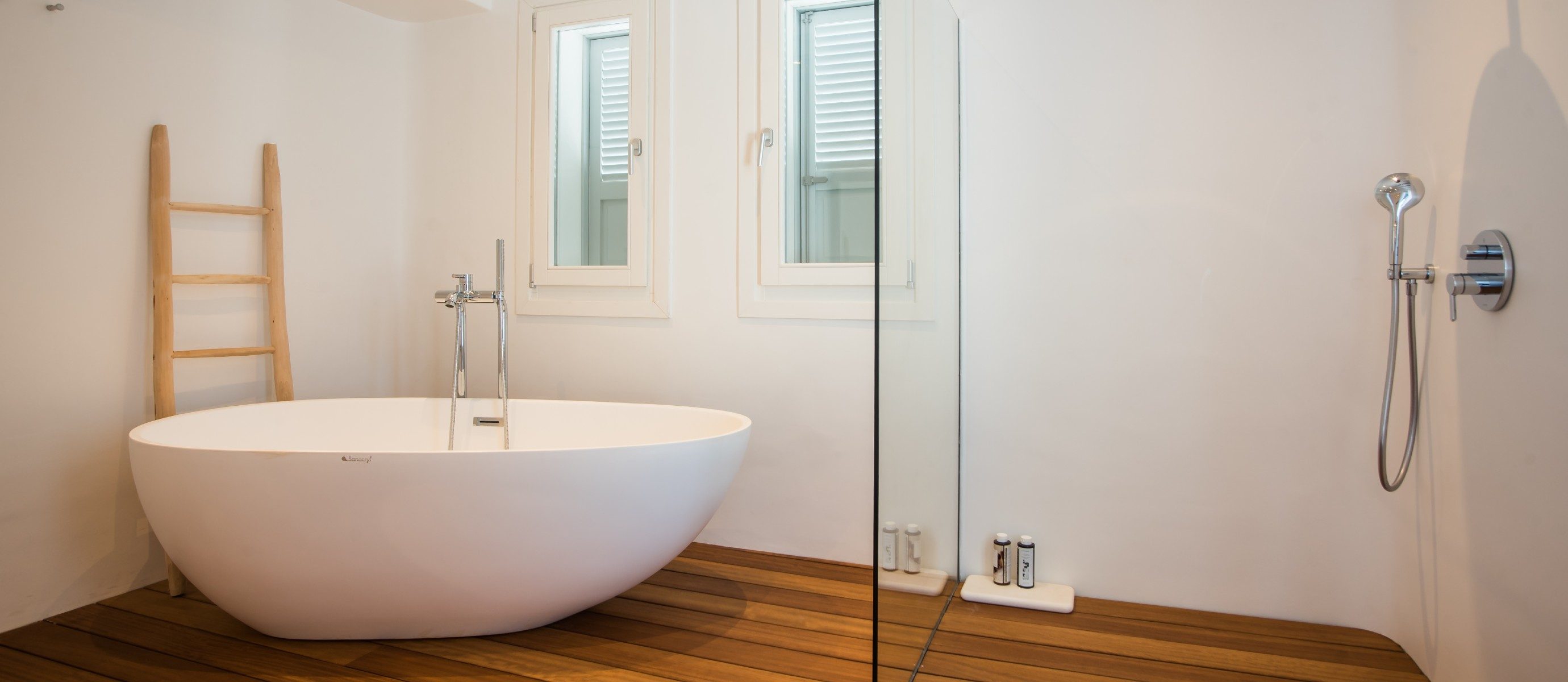 Upper level. Master area (140 sqm), divided into the main master bedroom (68.70 sqm) and the secondary master bedroom (40.50 sqm), each with king size bed, en-suite bathroom, air conditioning, panoramic sea view and access to private balconies. There is both a bath and walk-in shower in the bathroom of the main master bedroom.
