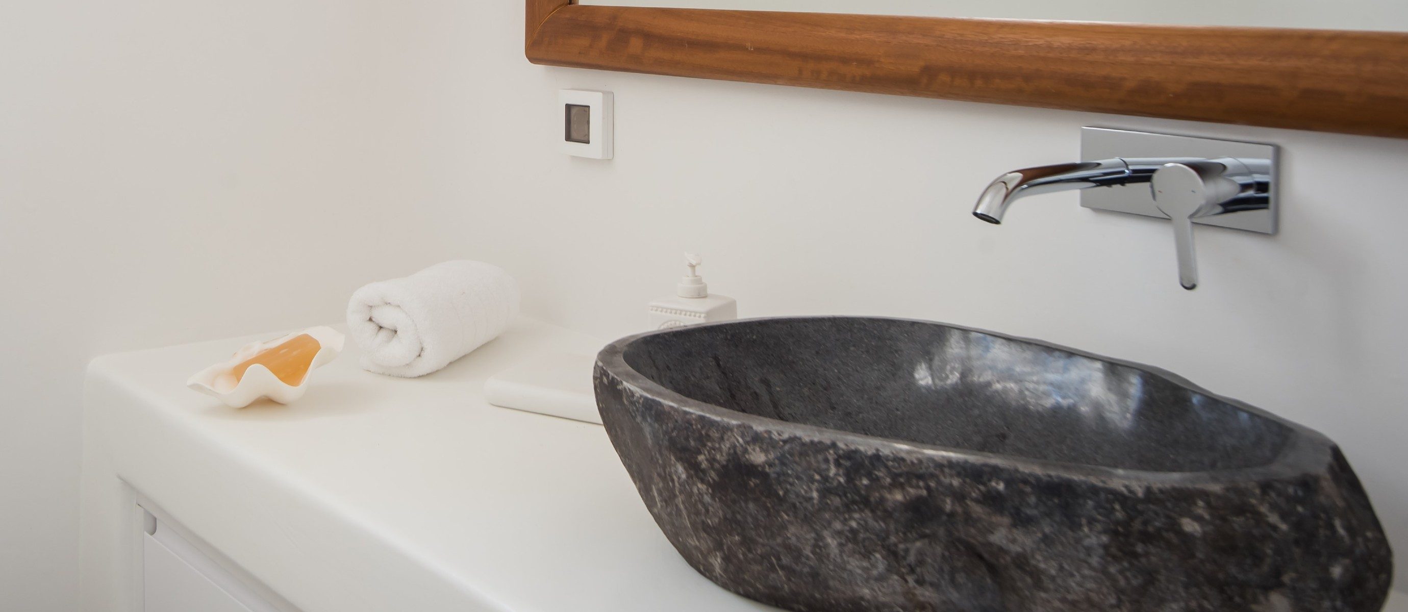 Lower level. One bedroom set alongside the pool, with queen size bed, en-suite bathroom, air conditioning, independent entrance, sea view and view underneath the pool’s water.