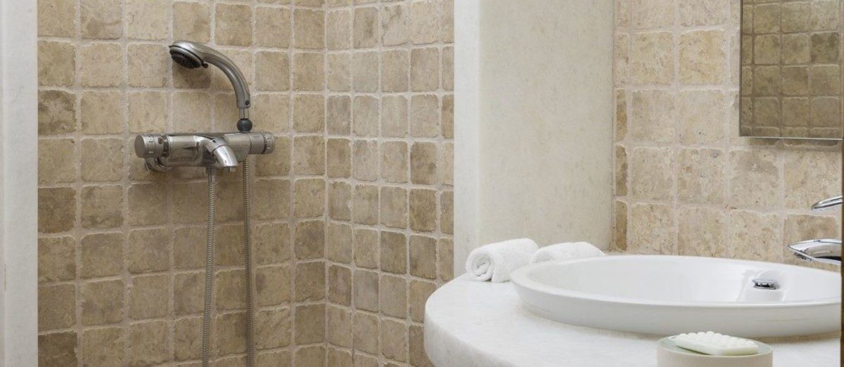 Ground Level. Entrance hall, living room with fire place (TV, mini hifi, A/C, ceiling fan), dining room, a fully equipped kitchen, a double room with en suite bathroom ( King Size bed, shower, A/C, TV, ceiling fan, terrace access with sea & pool view) and a guest cloakroom.