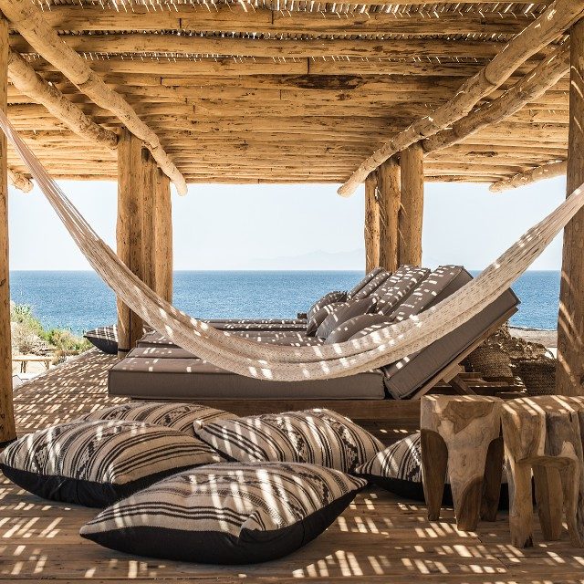 The villa, nestling perfectly well into the brown stone area of the Mykonian land, consists of 5 bedrooms and offers an outdoor area with an Infinity Pool and a magnificent lounge with a stunning sunset view, with a bar at the upper level. The white colour dominates the traditionally designed, graceful interior where the built-in sofas and beds are a natural continuance of the building itself.