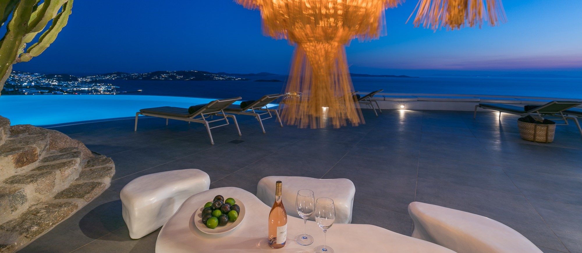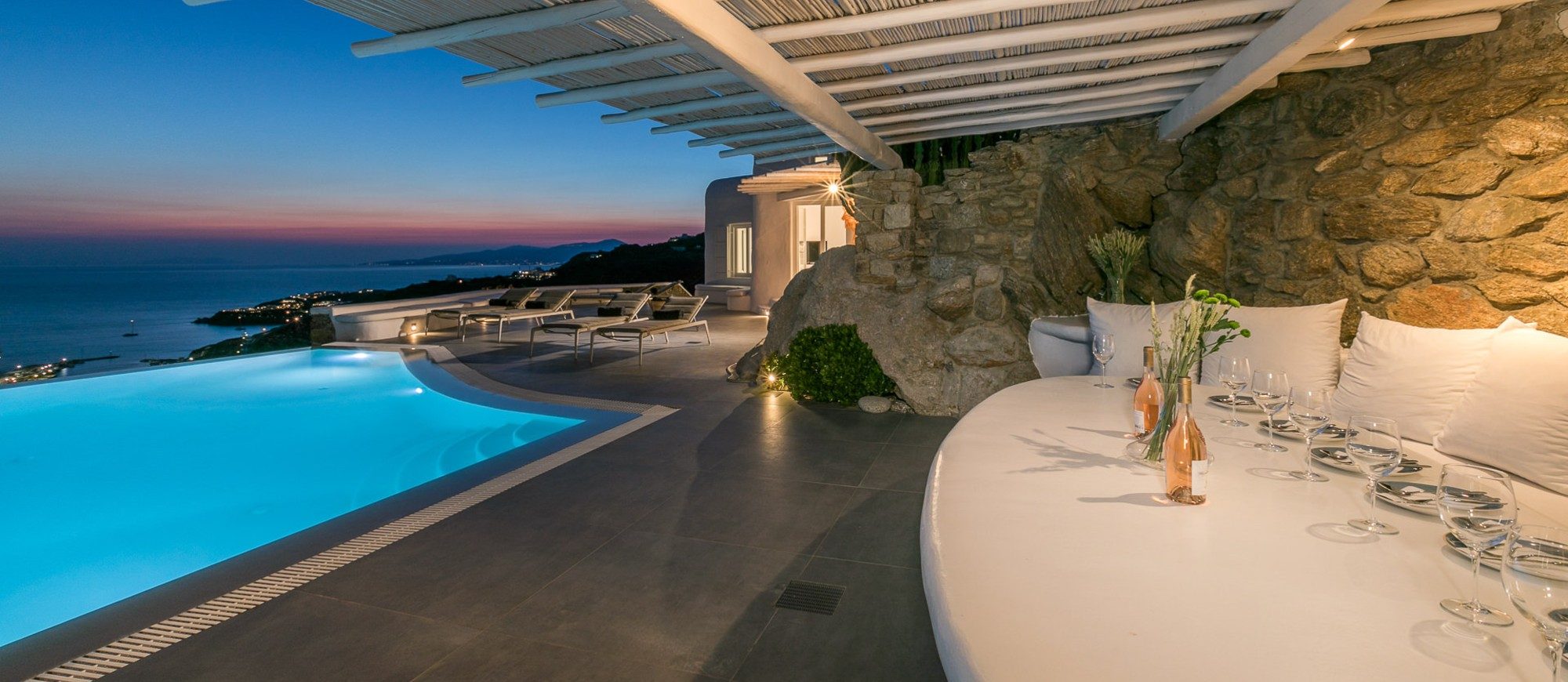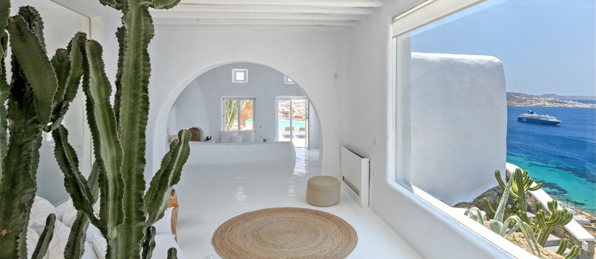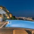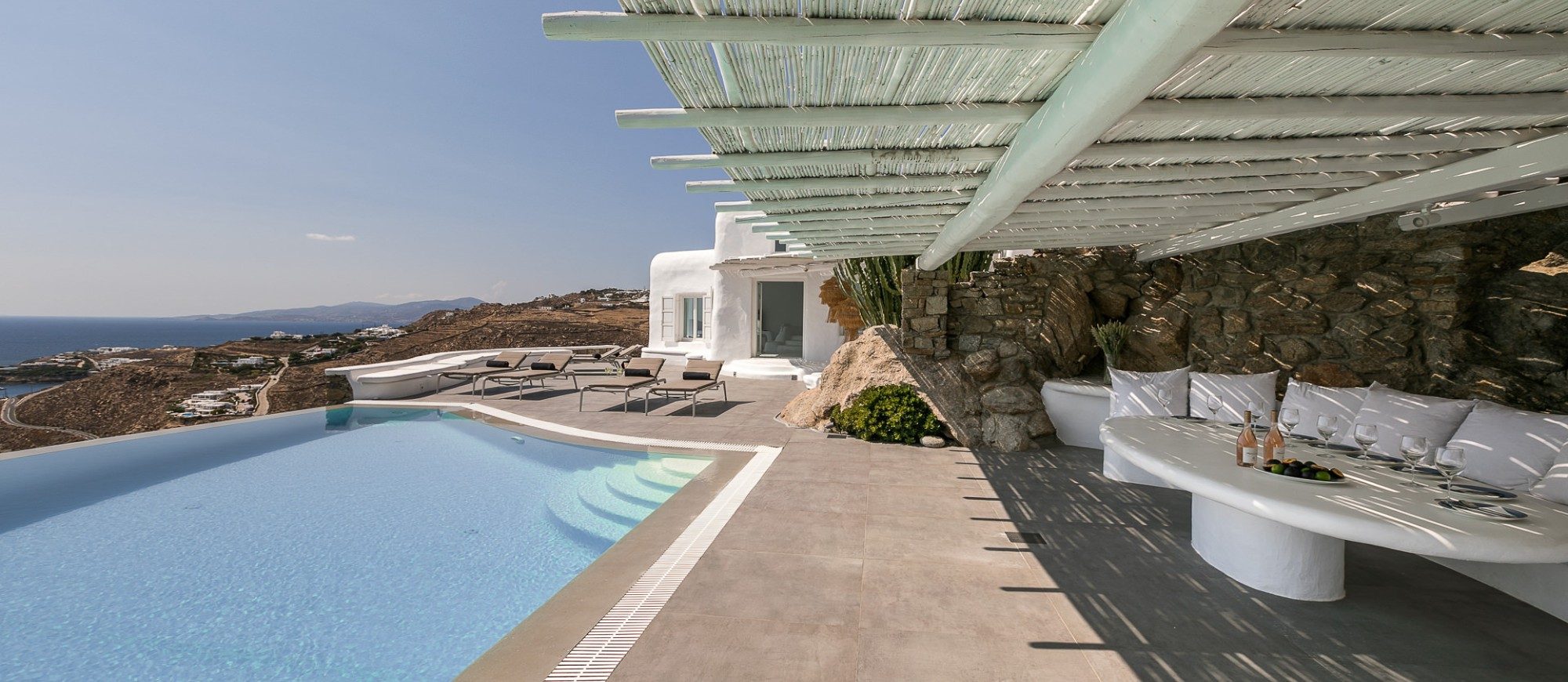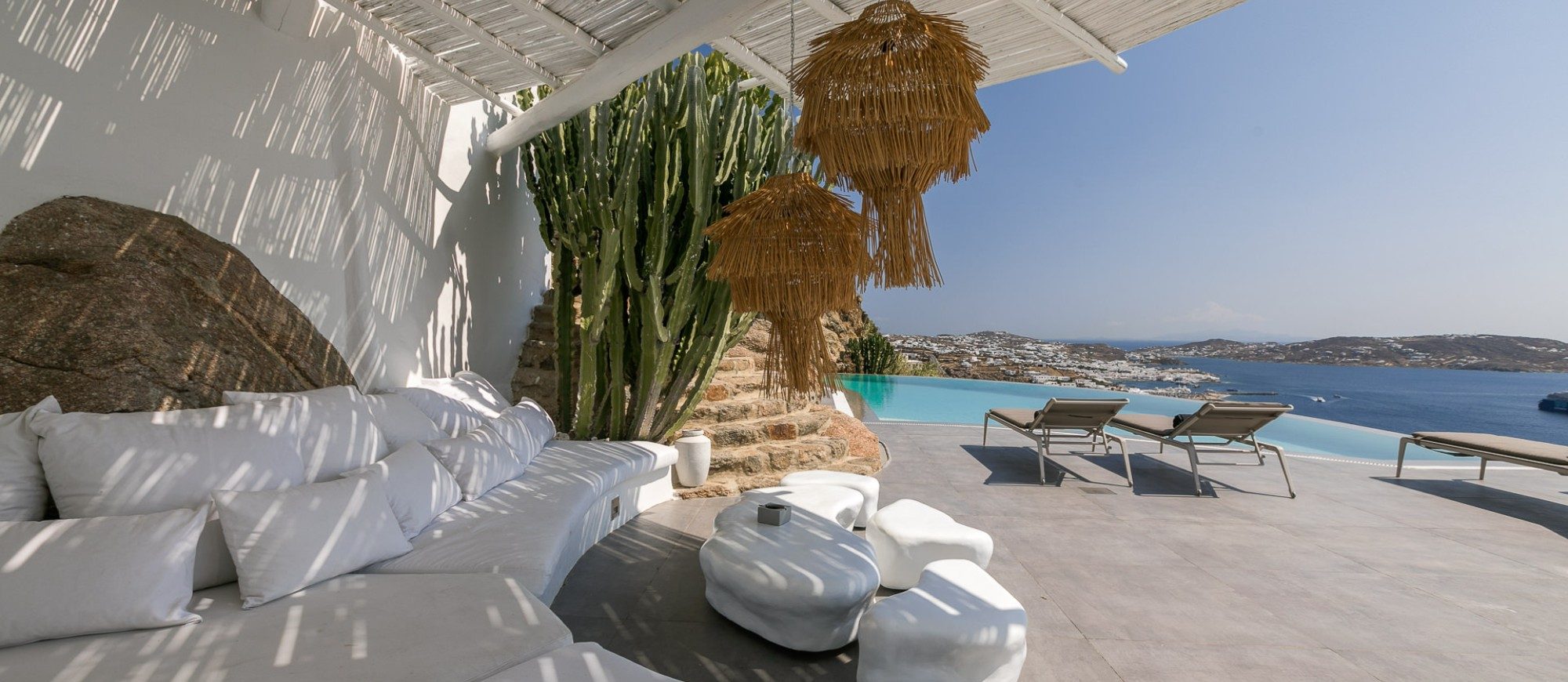 This sophisticated villa is situated in the Agia Sophia area overlooking the Aegean Sea, conveniently close to Mykonos town and the new port.