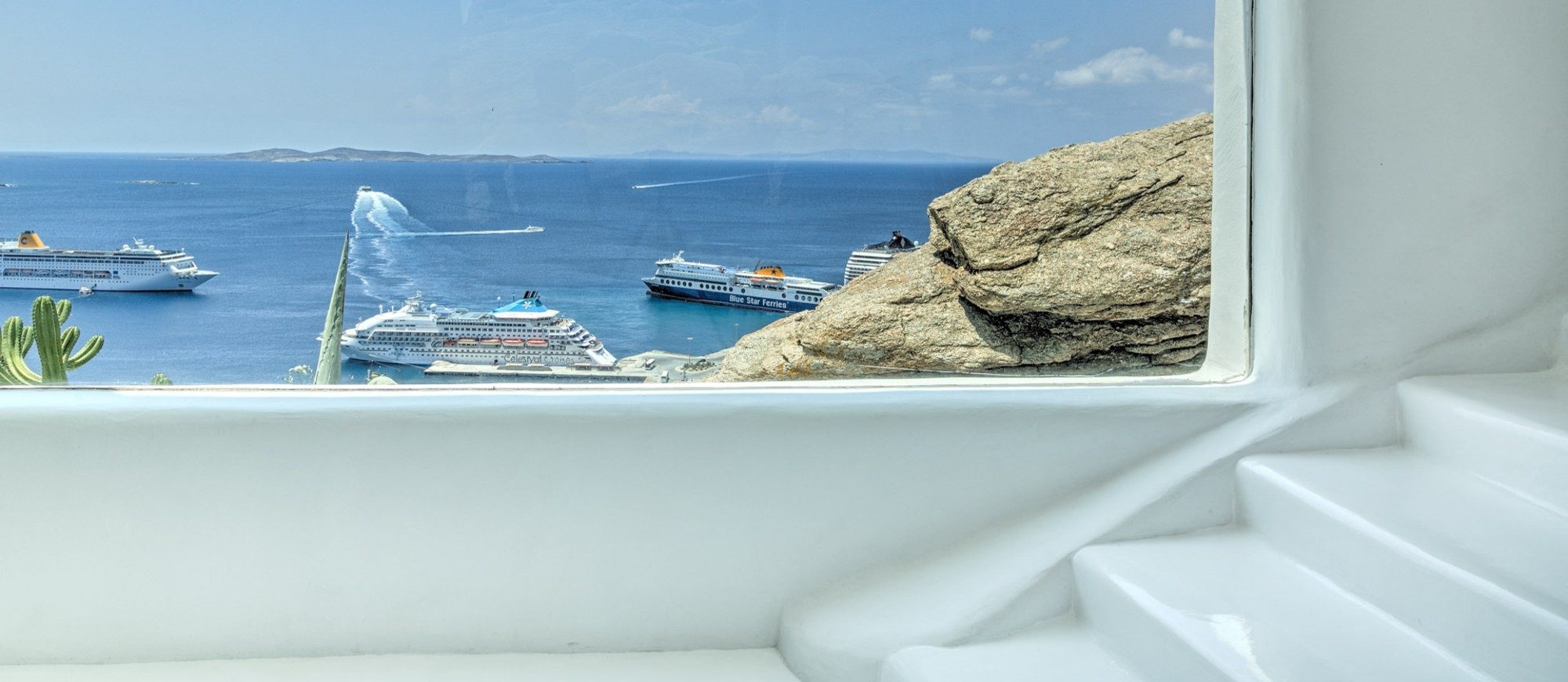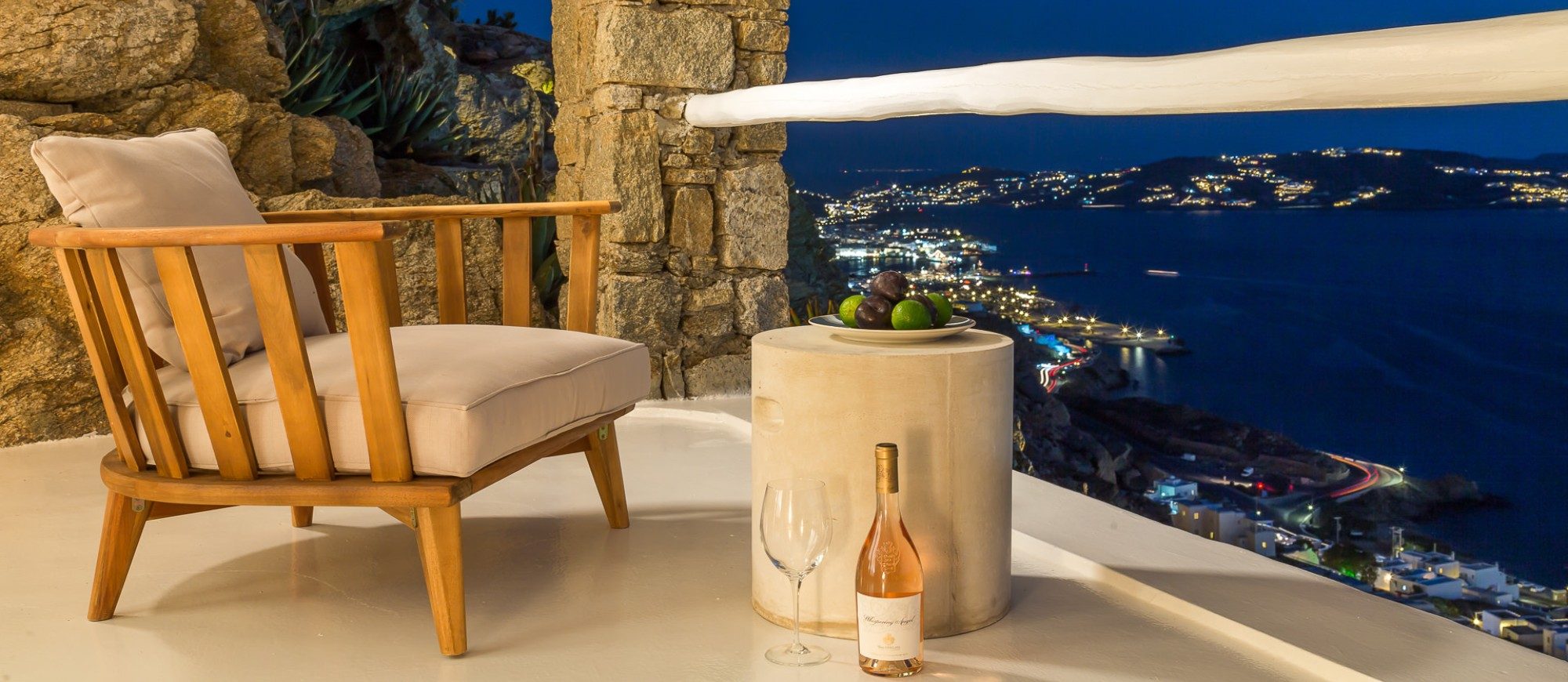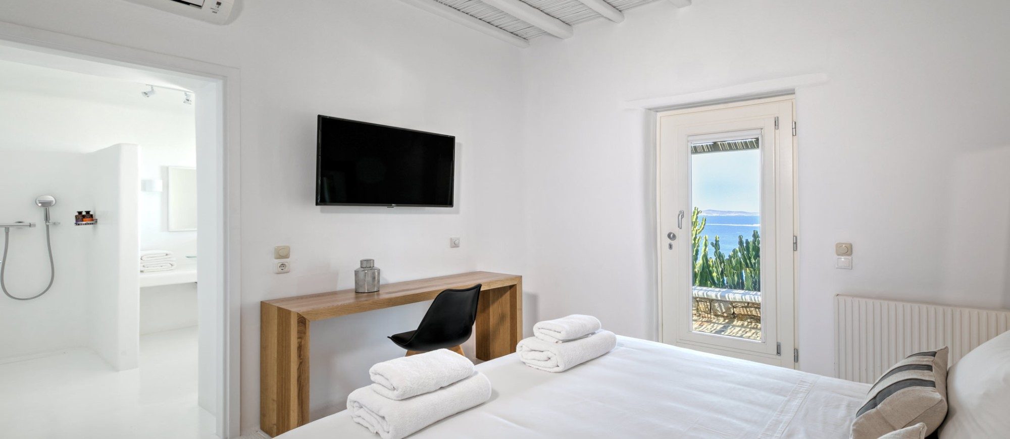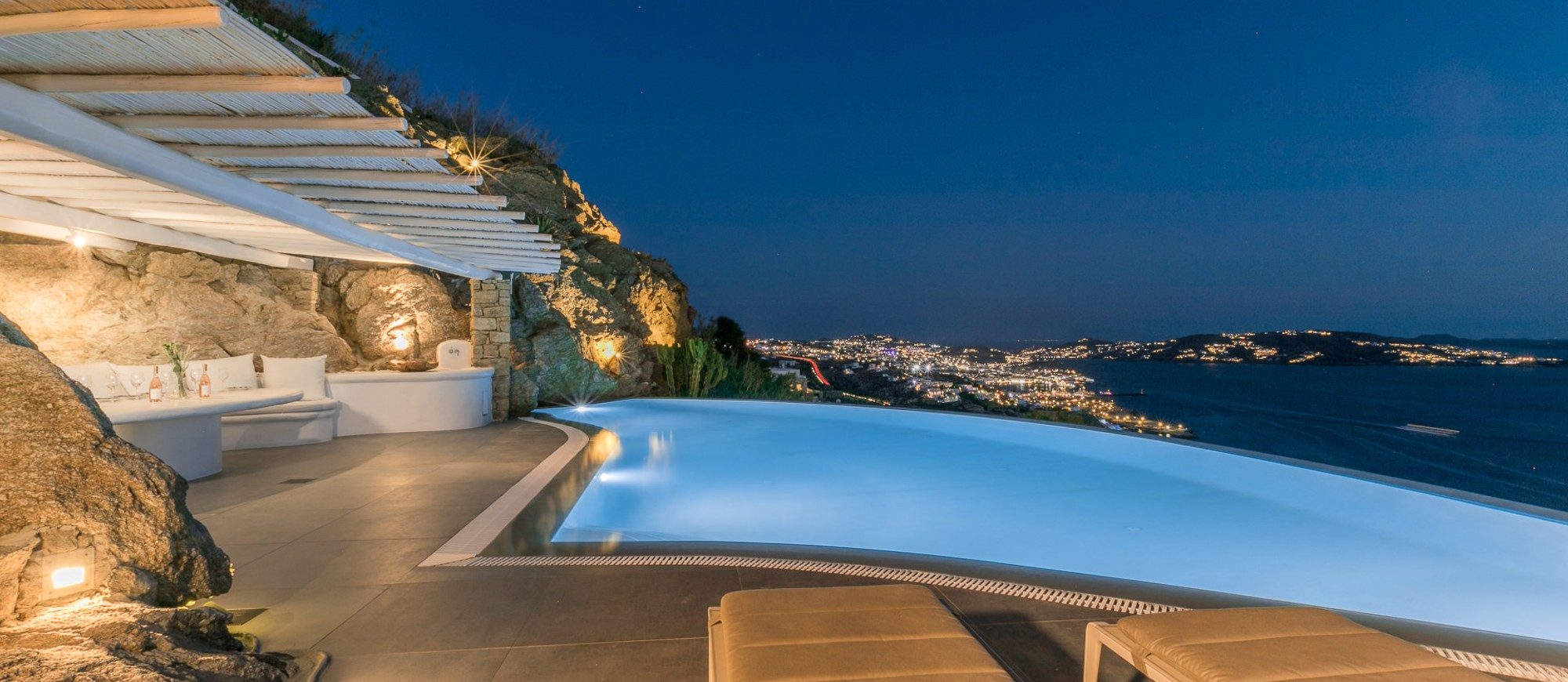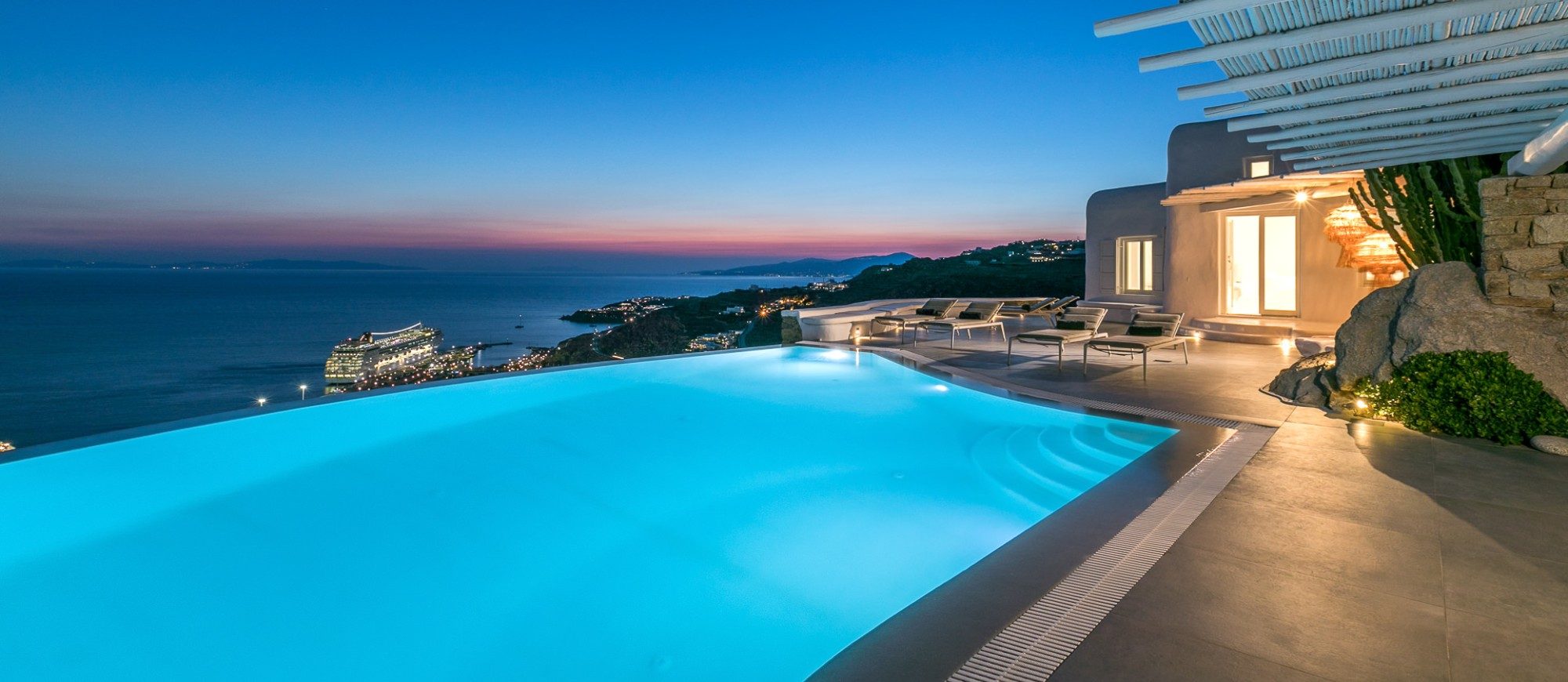 This sophisticated villa is situated in the Agia Sophia area overlooking the Aegean Sea, conveniently close to Mykonos town and the new port.