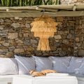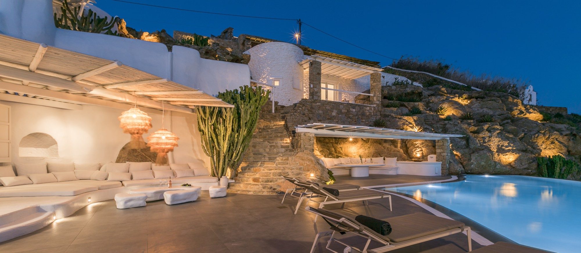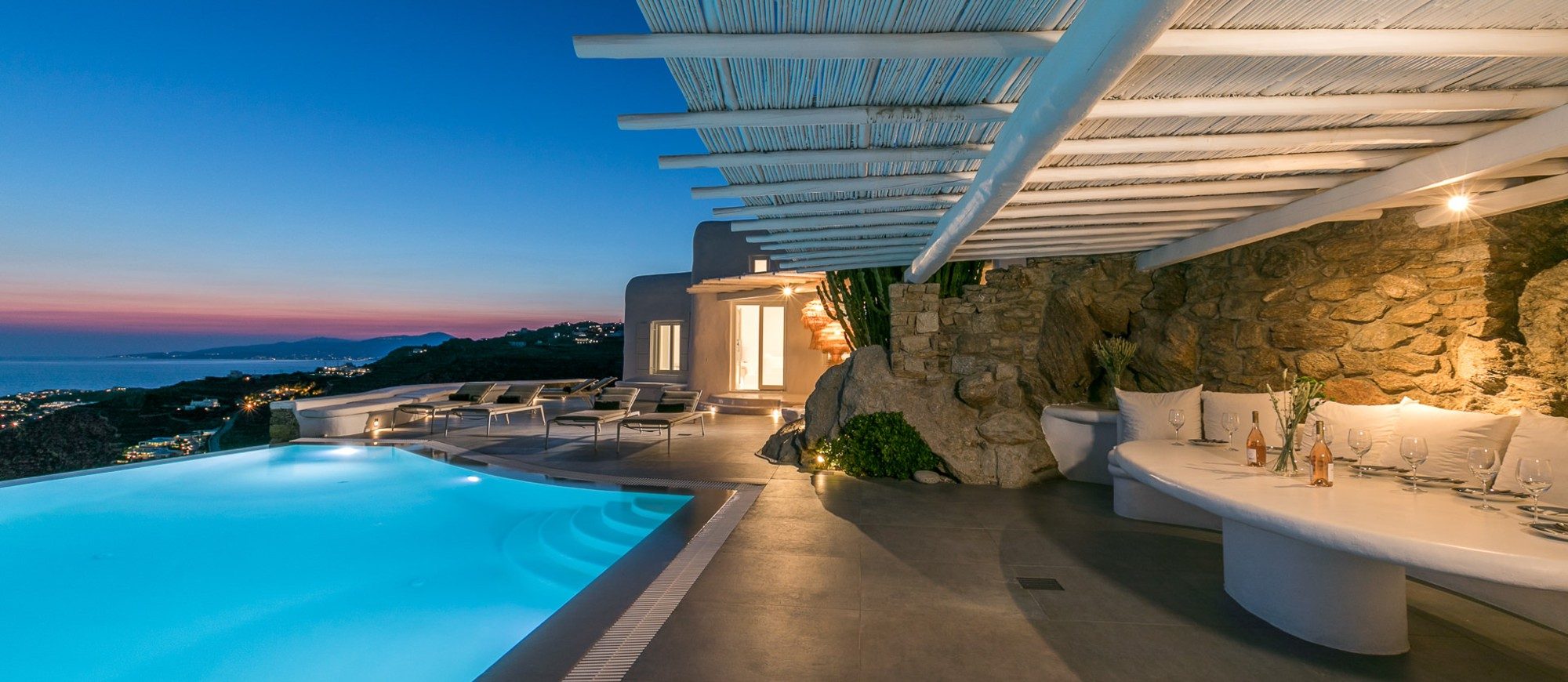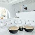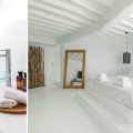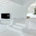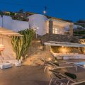 The villa, nestling perfectly well into the brown stone area of the Mykonian land, consists of 5 bedrooms and offers an outdoor area with an Infinity Pool and a magnificent lounge with a stunning sunset view, with a bar at the upper level. The white colour dominates the traditionally designed, graceful interior where the built-in sofas and beds are a natural continuance of the building itself.
