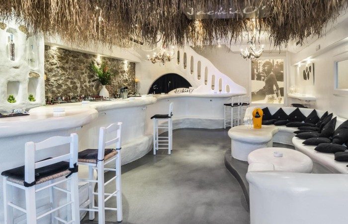 Inviting small cave like bar with white washed and stone walls, banquettes, barstools and unusual chandeliers made from drift wood. Subdued lighting plus candles. Two floors, both the same. Few tables outside but mainly a standing crowd enjoying drinks, chatting and dancing. No traffic to worry about.
