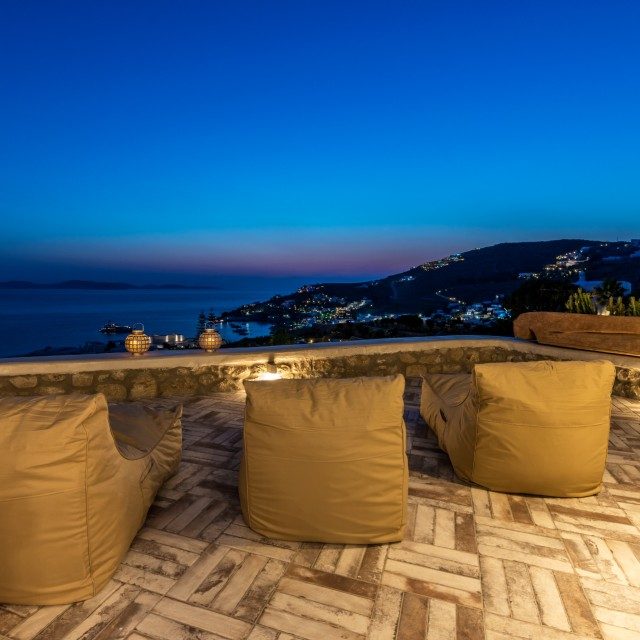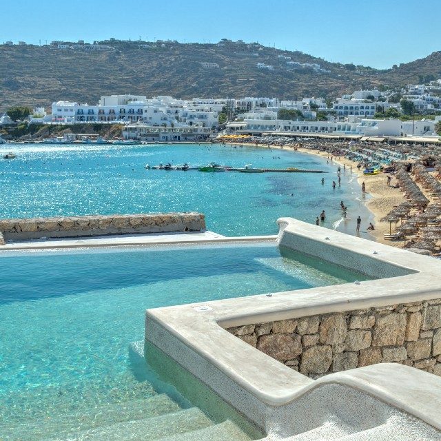 The restaurant is located on the beautiful, sheltered beach of Ornos with its shallow turquoise waters and golden sand and is an ideal family setting, away from the cosmopolitan Mykonos.