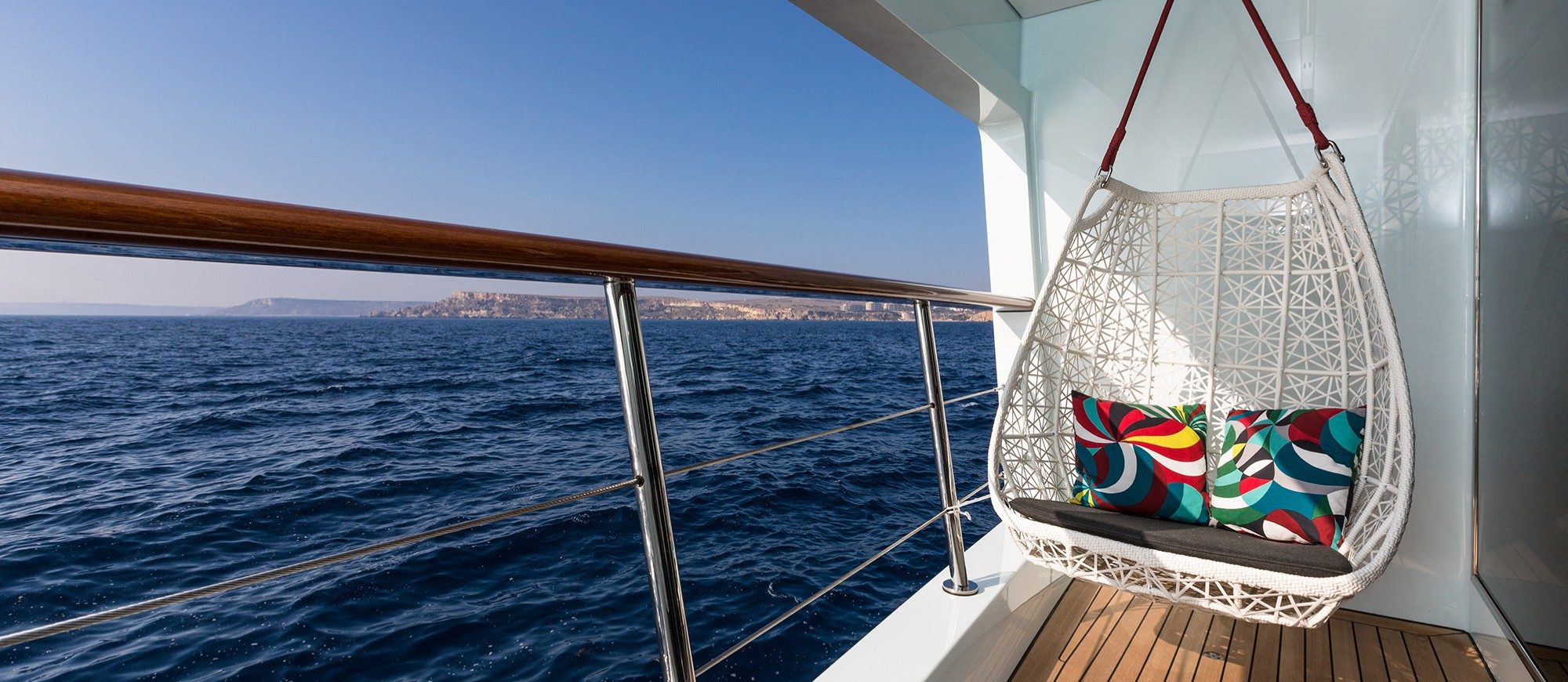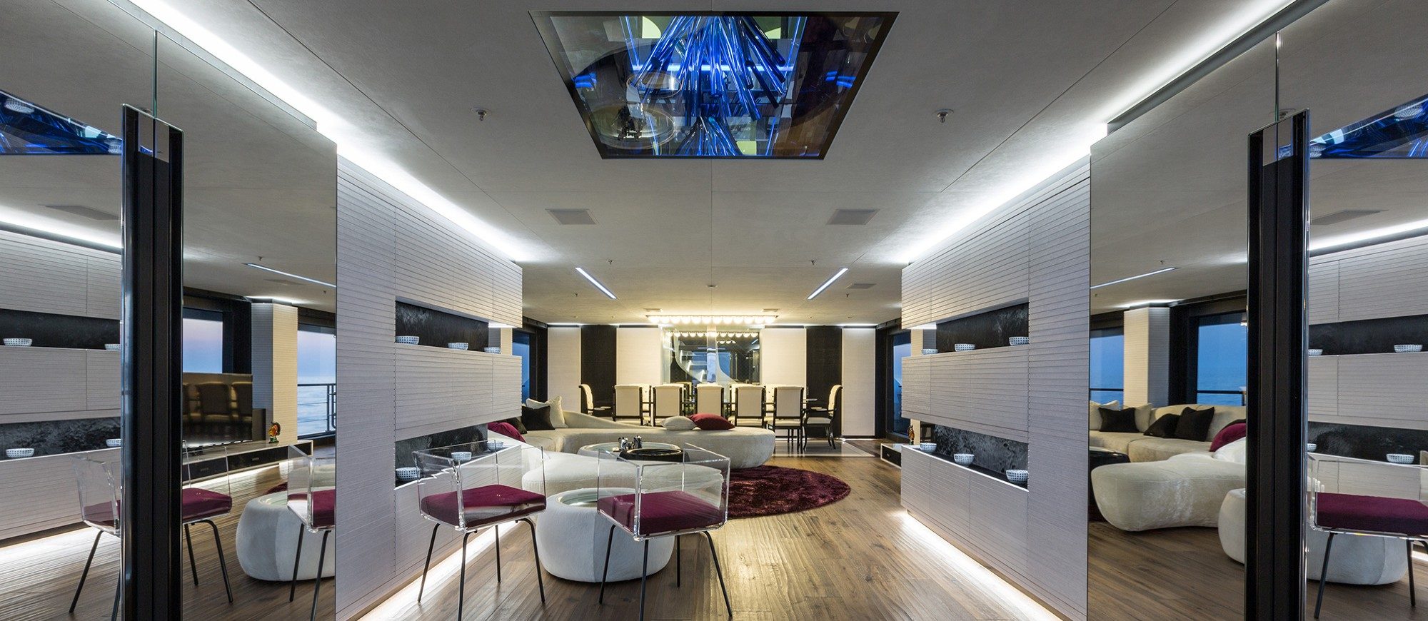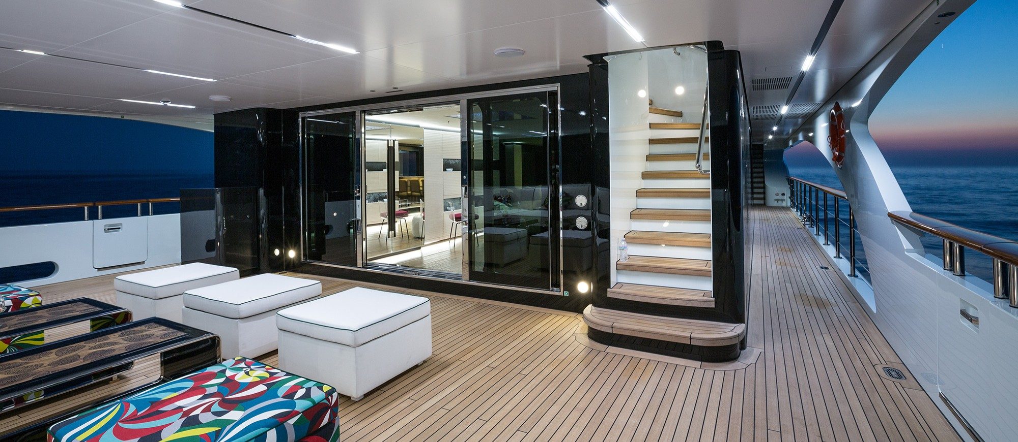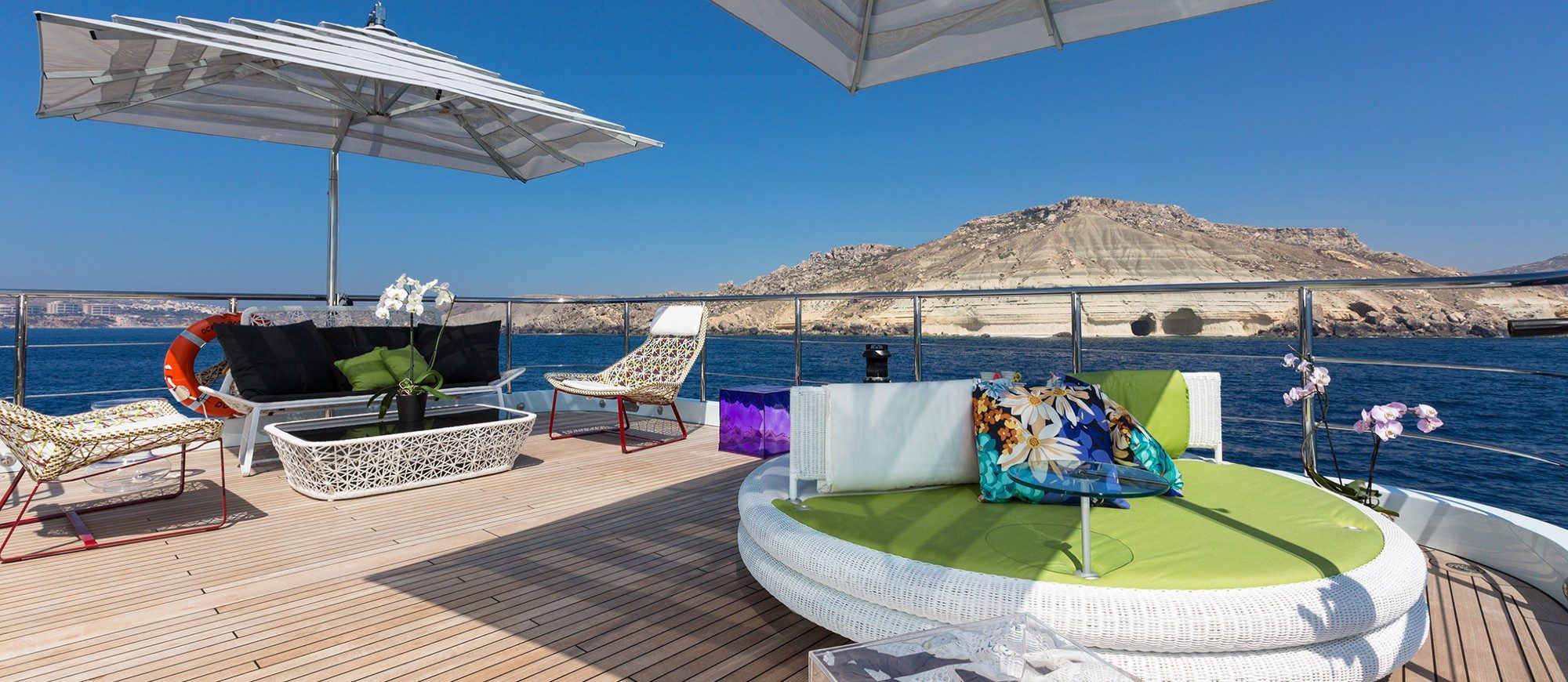 Her spacious interior, created by designer Mauro Izzo, boasts spaces where Zen gardens stylishly mix with light woods, glass walls and floor-to-ceiling windows in the main salon, providing unobstructed sea views and an abundance of natural light.