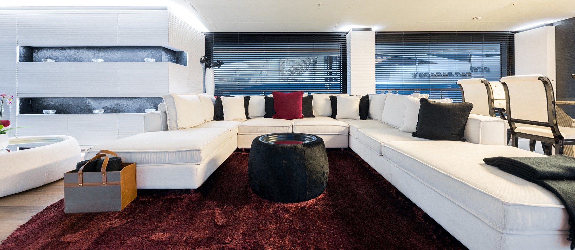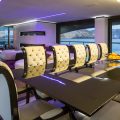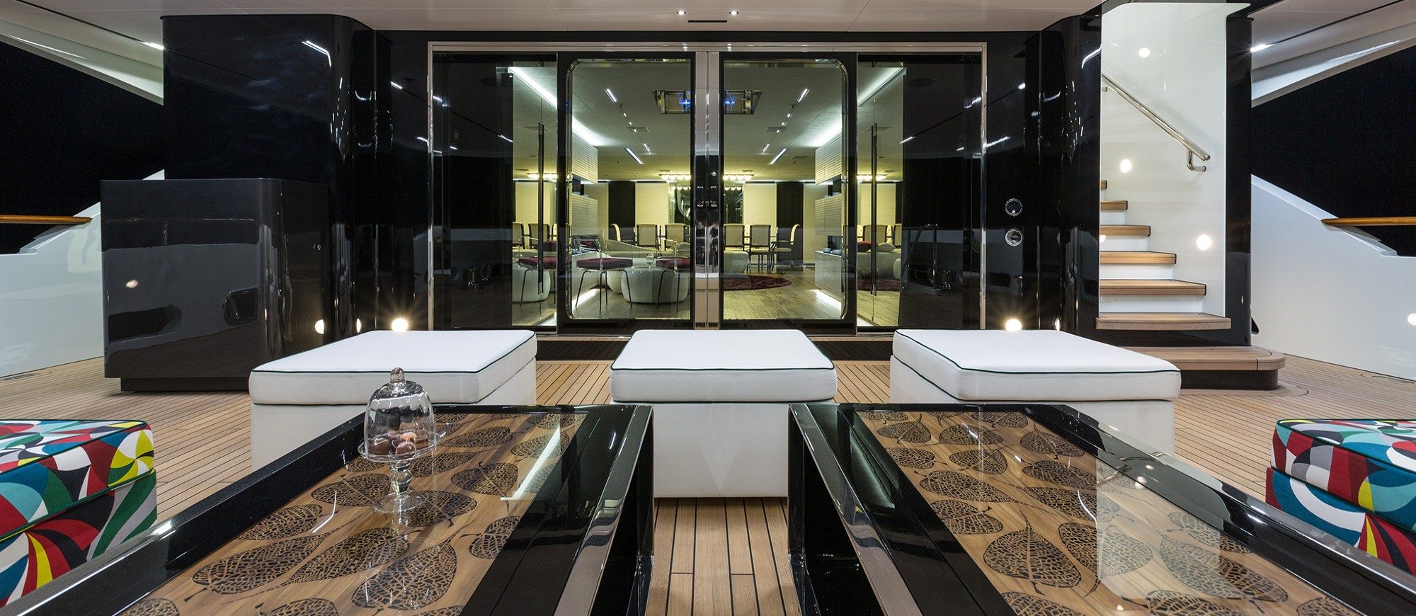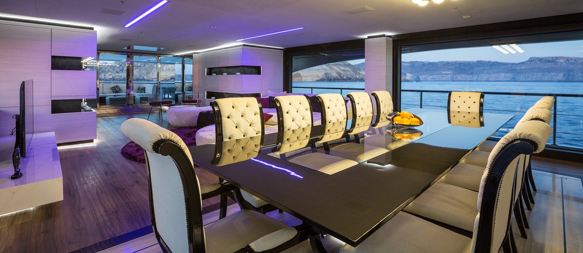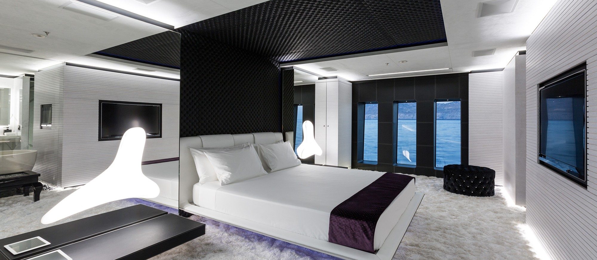 Her spacious interior, created by designer Mauro Izzo, boasts spaces where Zen gardens stylishly mix with light woods, glass walls and floor-to-ceiling windows in the main salon, providing unobstructed sea views and an abundance of natural light.
