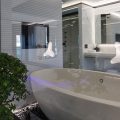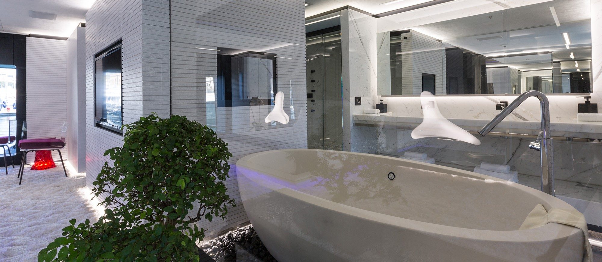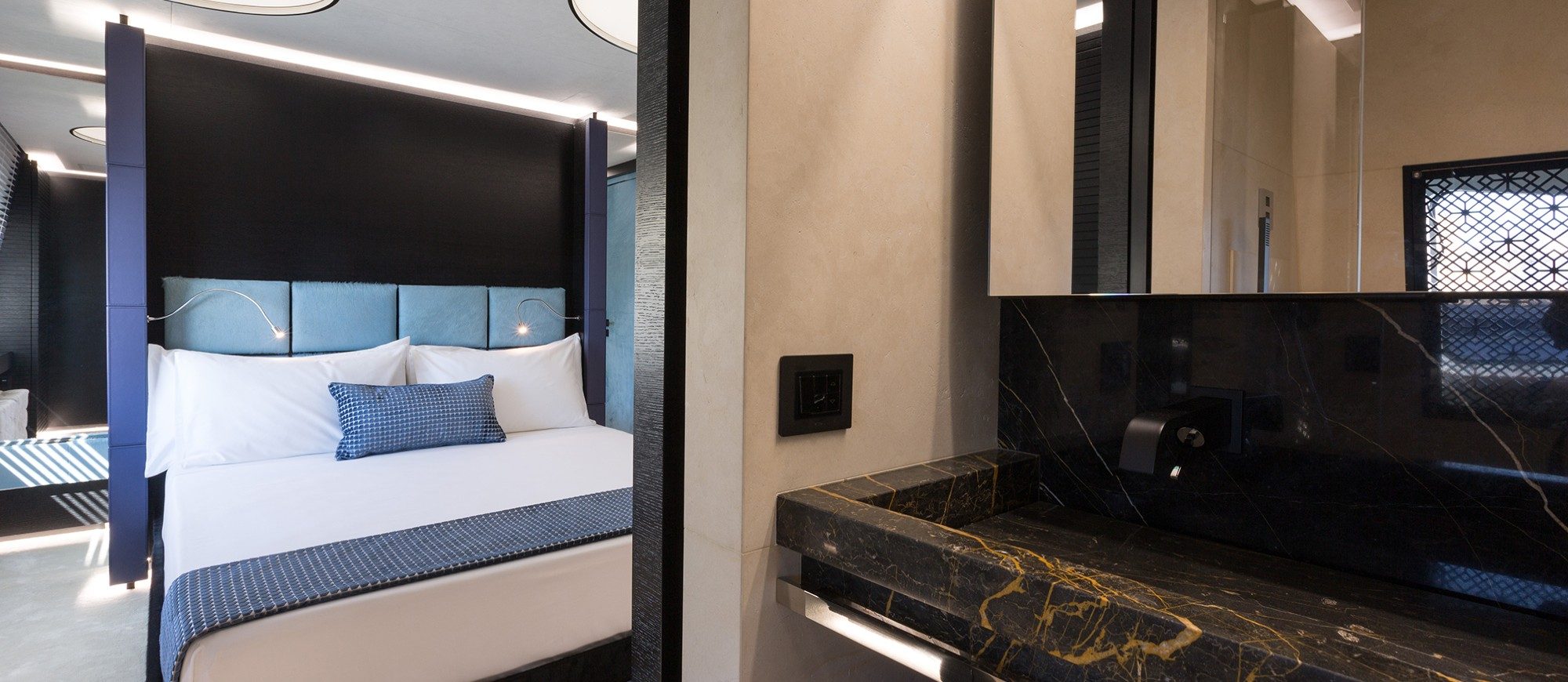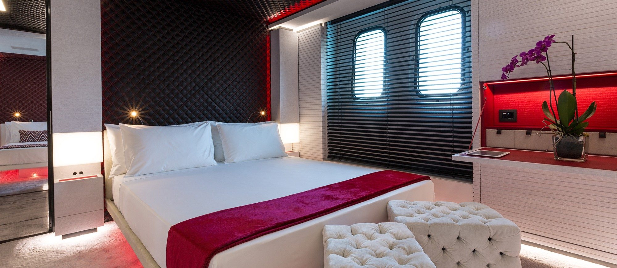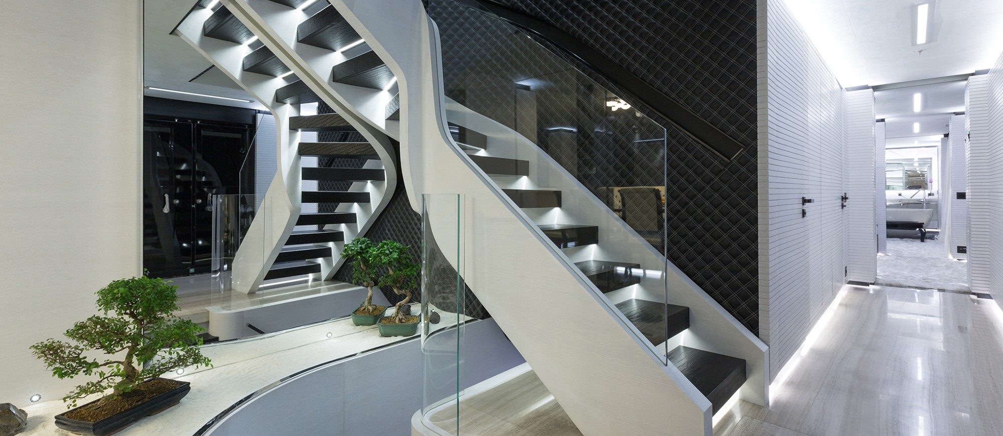 Her spacious interior, created by designer Mauro Izzo, boasts spaces where Zen gardens stylishly mix with light woods, glass walls and floor-to-ceiling windows in the main salon, providing unobstructed sea views and an abundance of natural light.